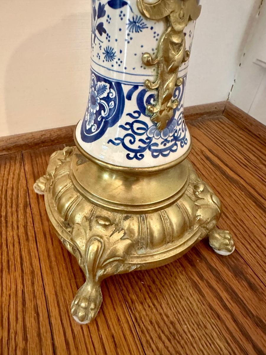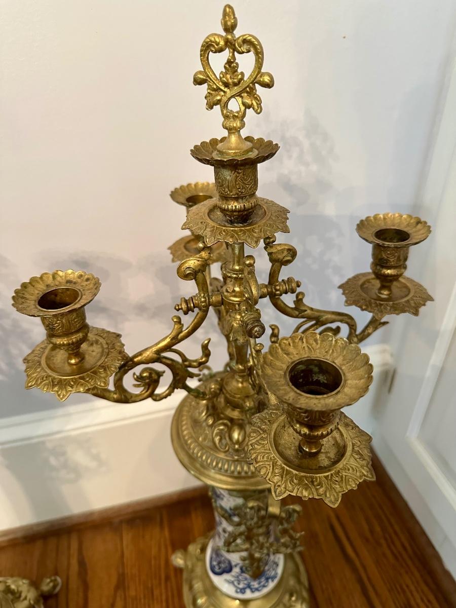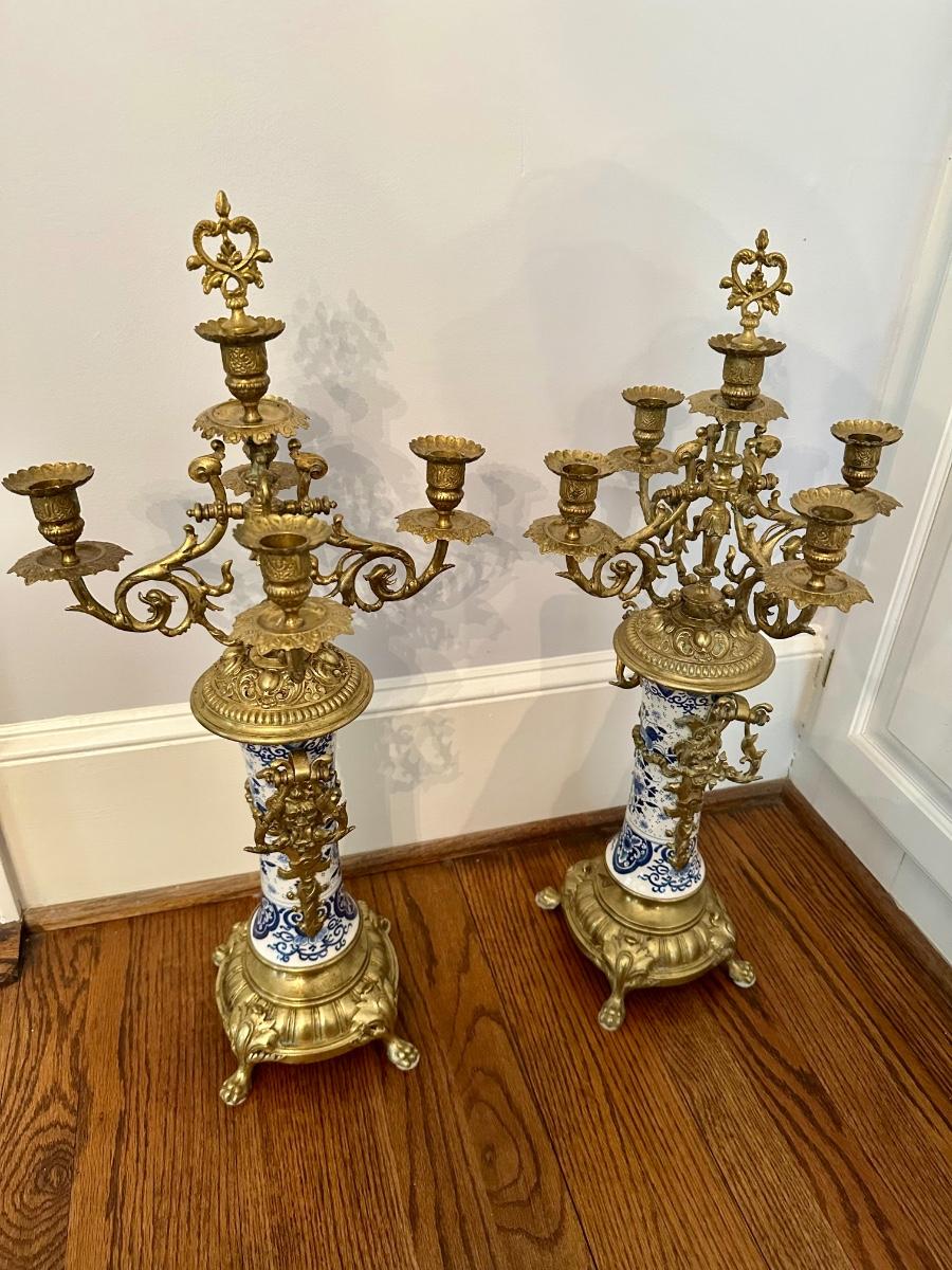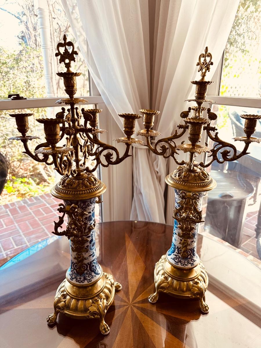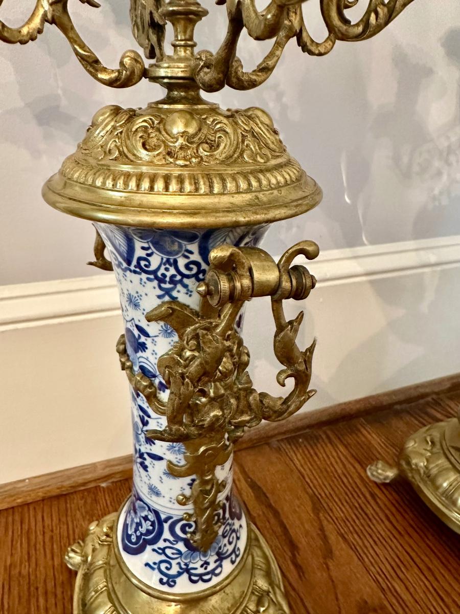 BLUE WHITE DELFT BRASS CANDLEABRA PAIR