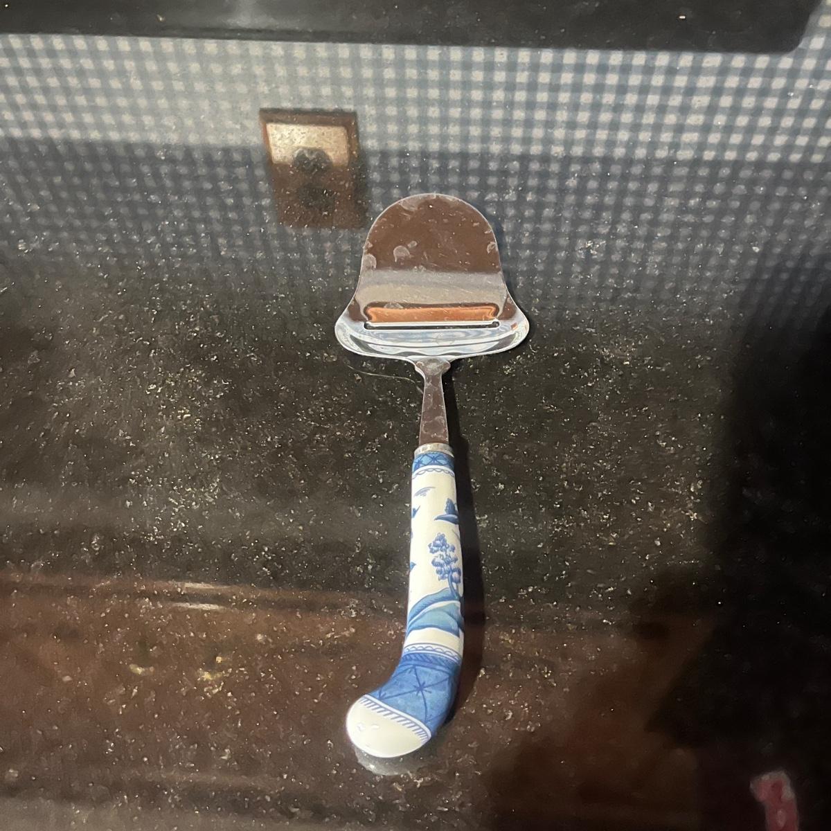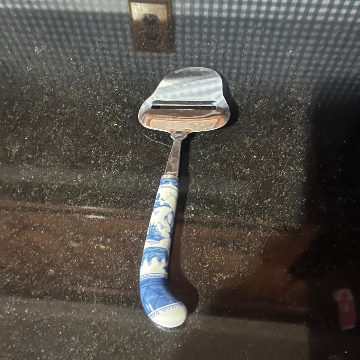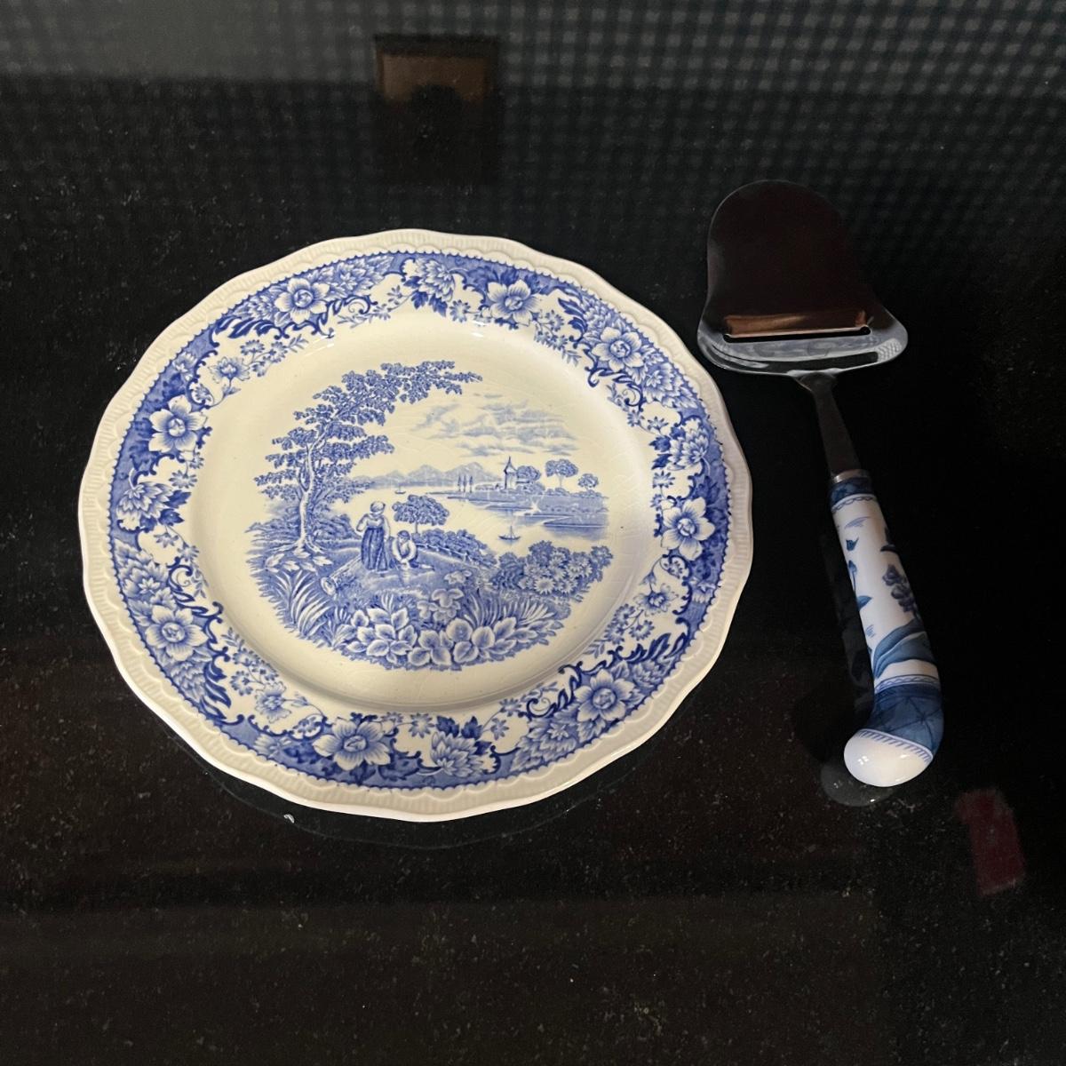 Lot contains a selection of blue dish ware that includes seven plates including a Spode plate, four bowls, eight small serving dishes and a cheese slicer. Largest plate measures 11”D.