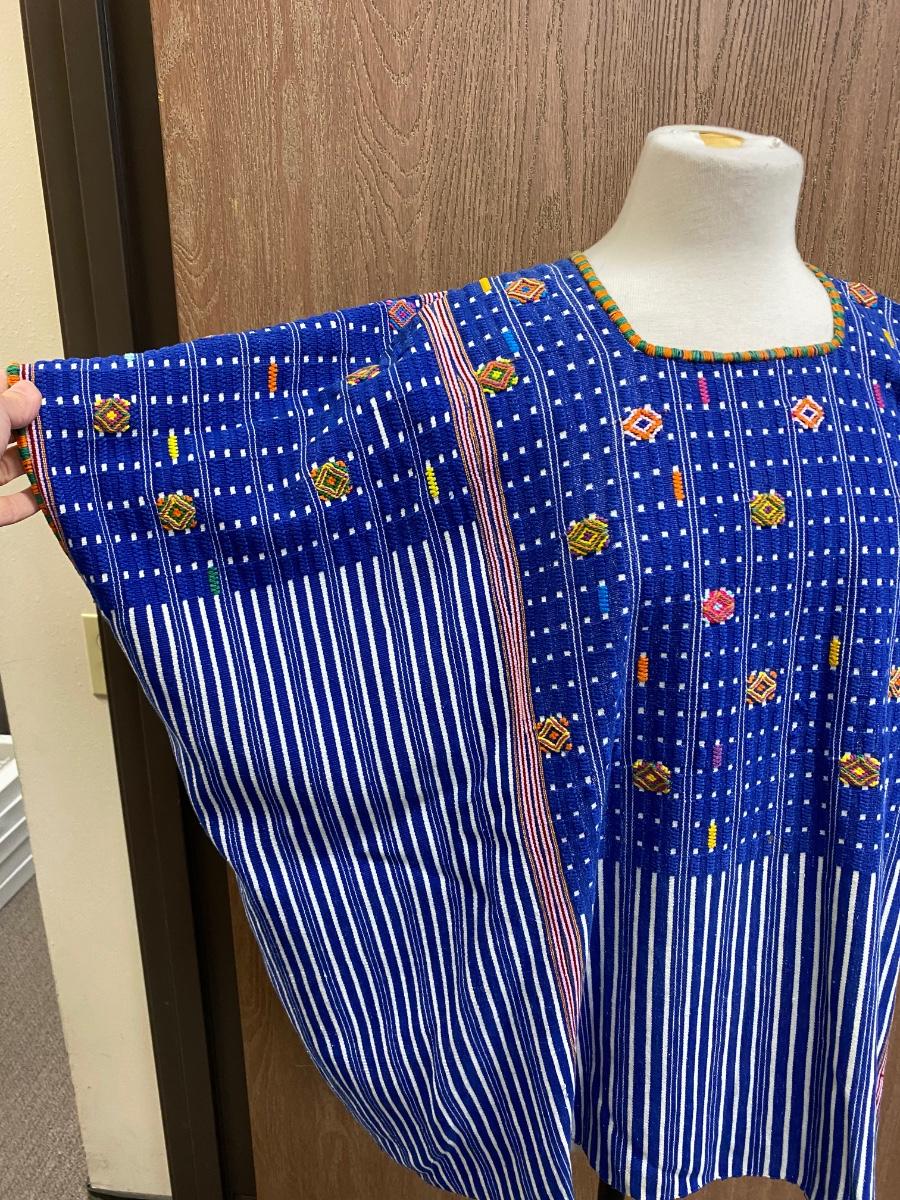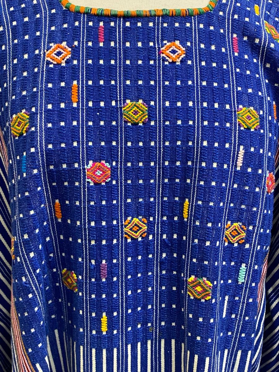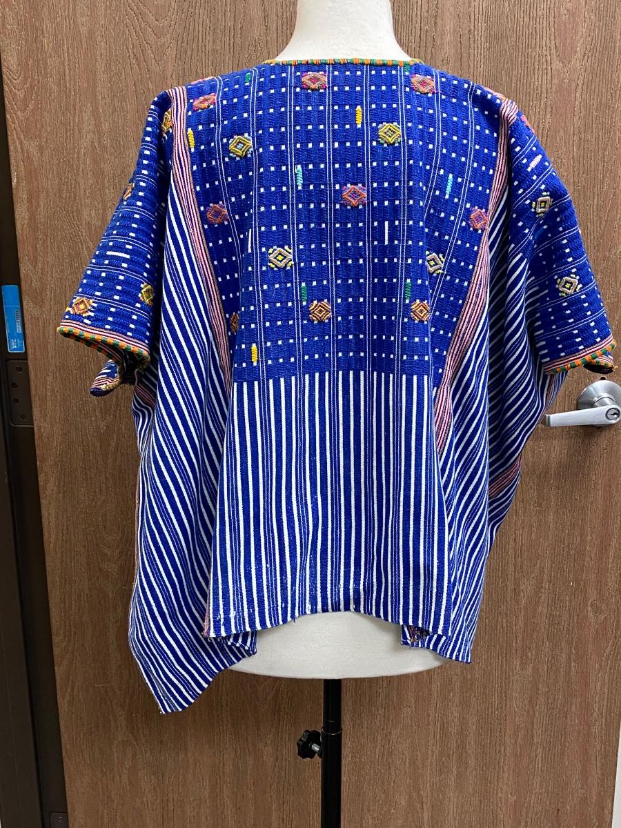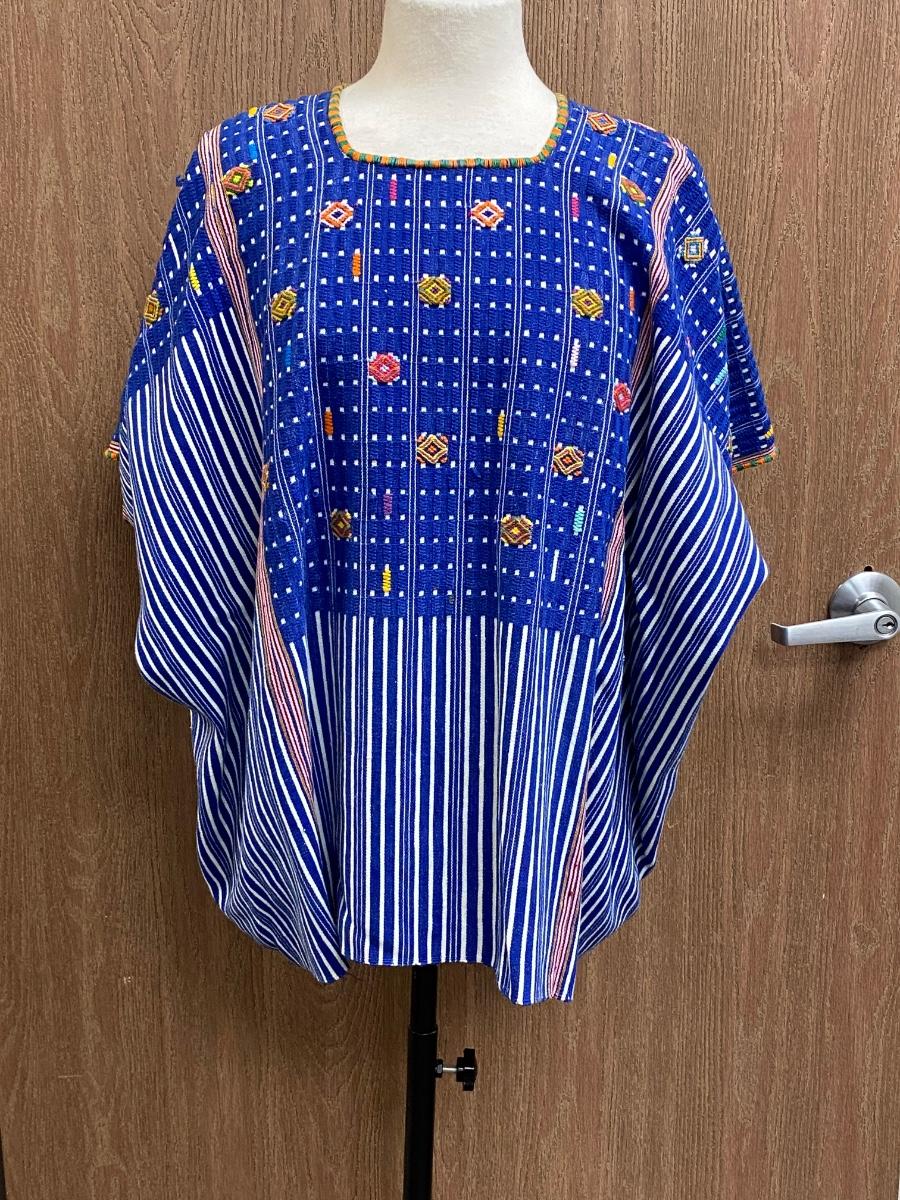 Blue and white Mexican peasant blouse with embroidered details. Caftan style blouse, at the hips length. In good condition. Medium/large size.