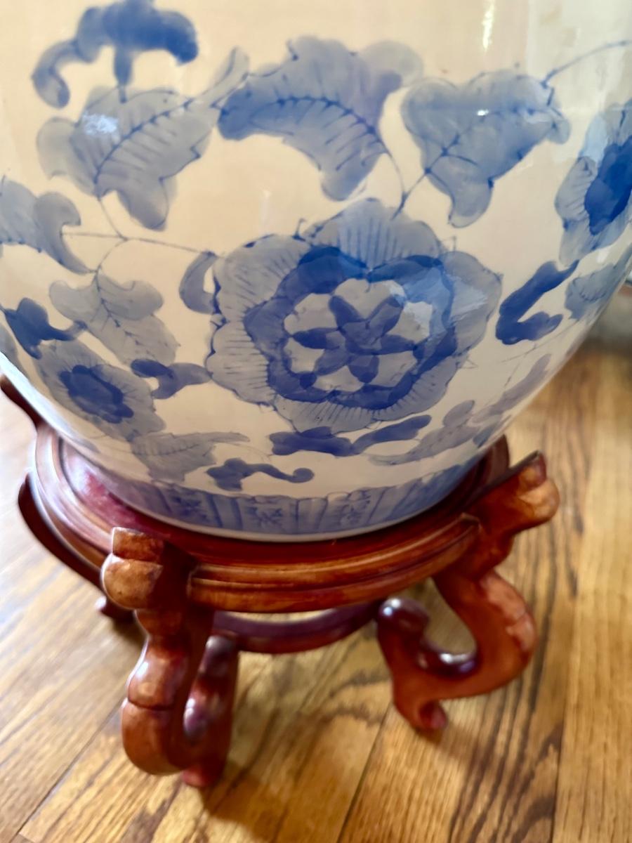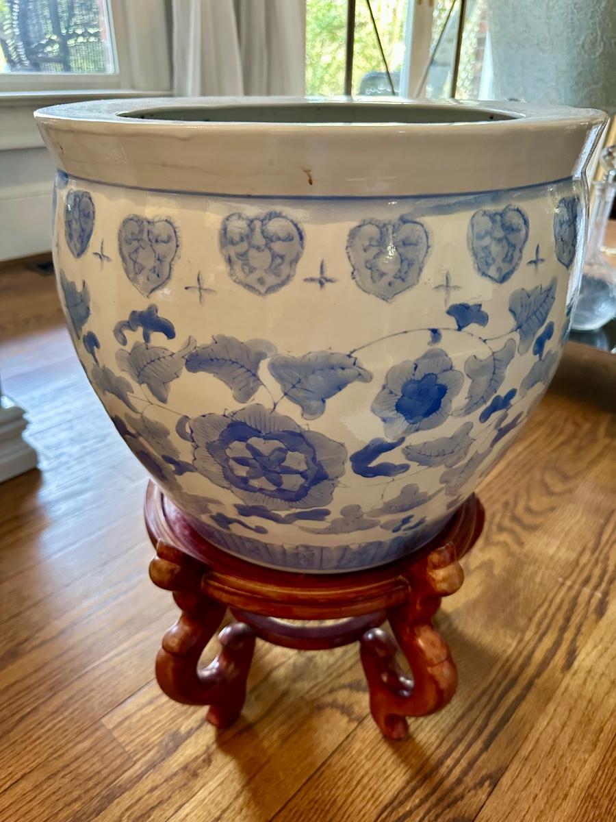 BLUE WHITE FISHBOWL PLANTER ON STAND