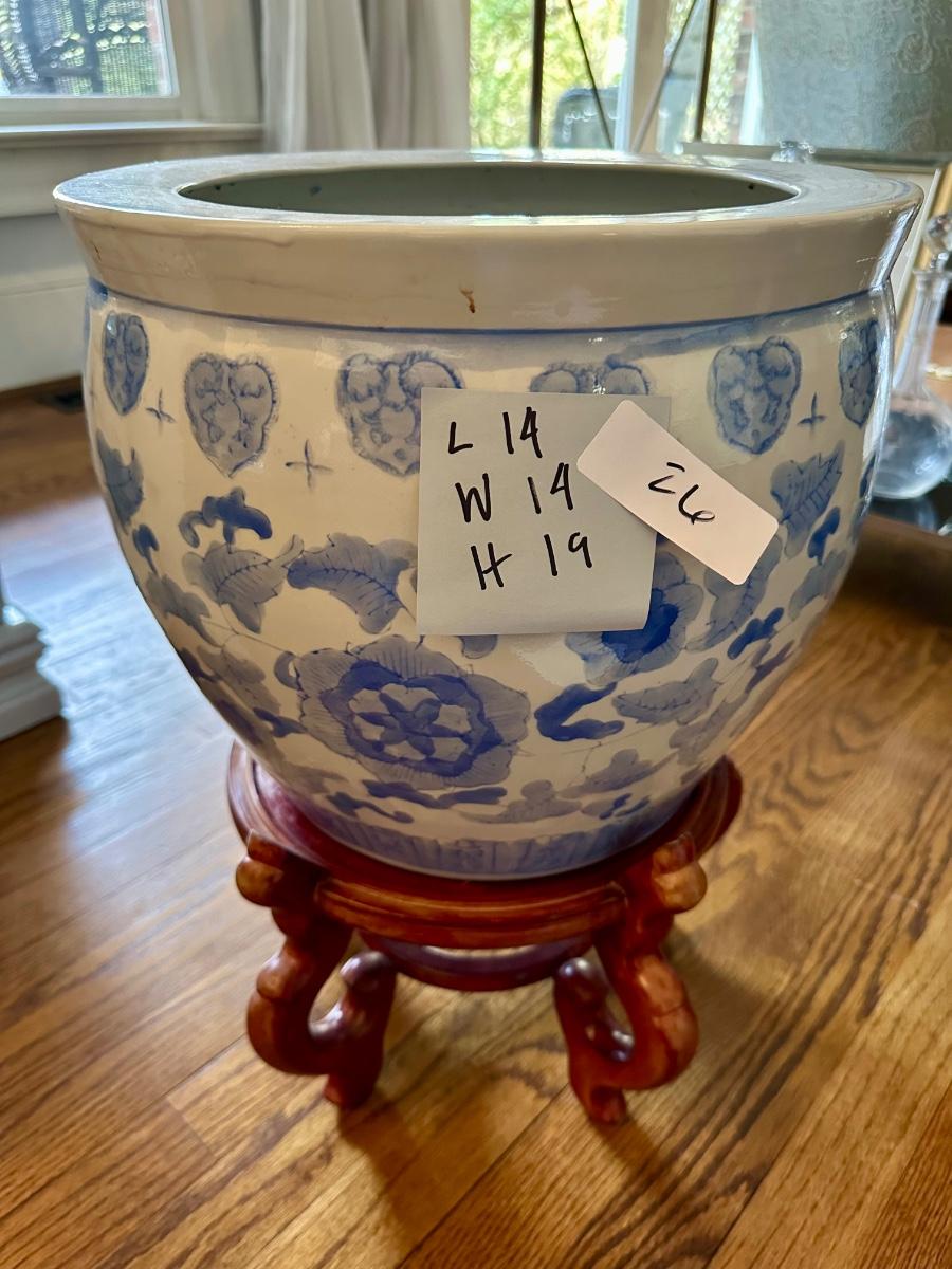 BLUE WHITE FISHBOWL PLAANTER ON STAND 14X19