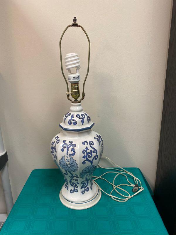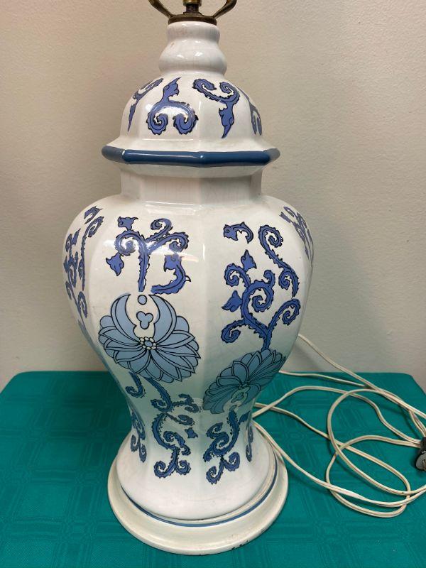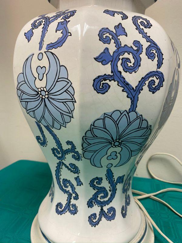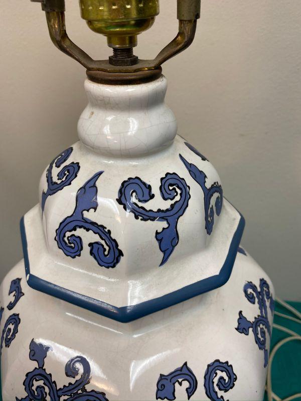 Blue & white table lamp. Has a flower and vine design. There is crazing to the glaze. Large base, no shade.