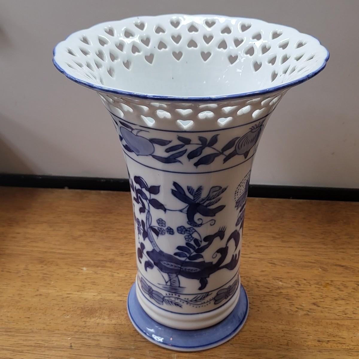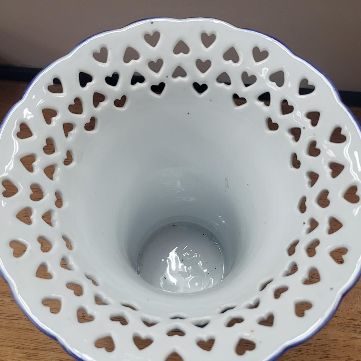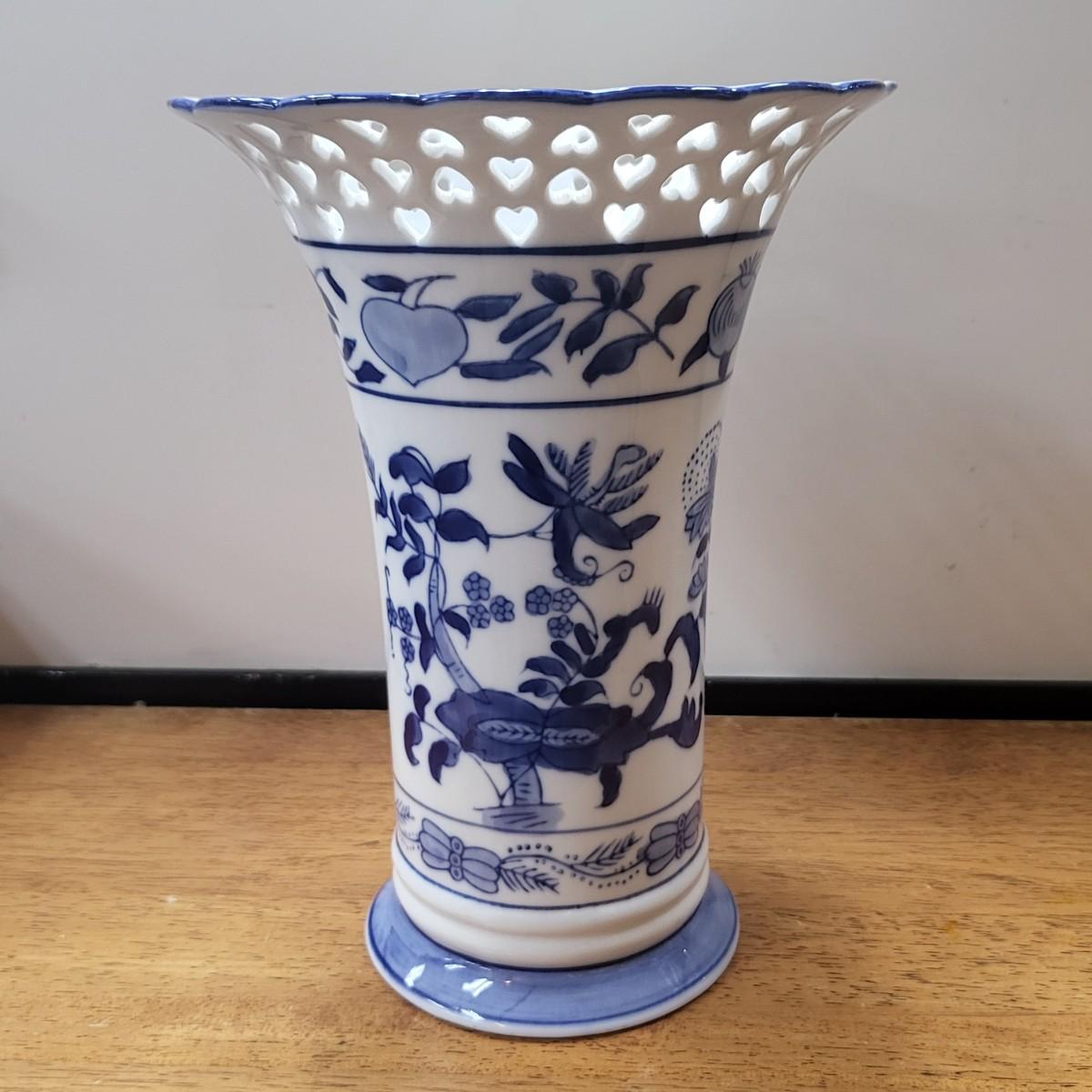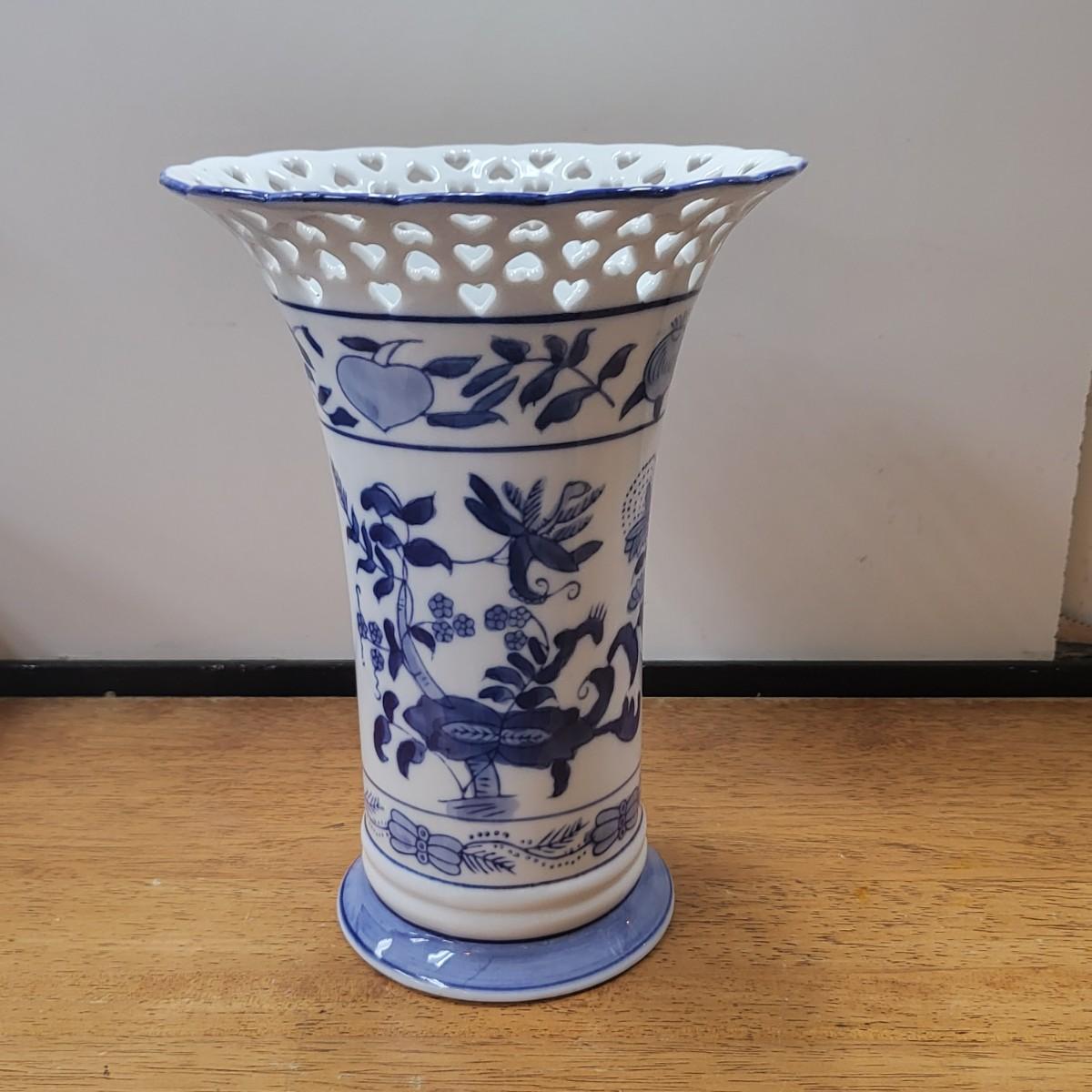 The vase measures 10.5" tall. Flares out at top to 7.5" round and base is 4.5" round. Handpainted, glazed blue & white. Hearts lattice pattern top.