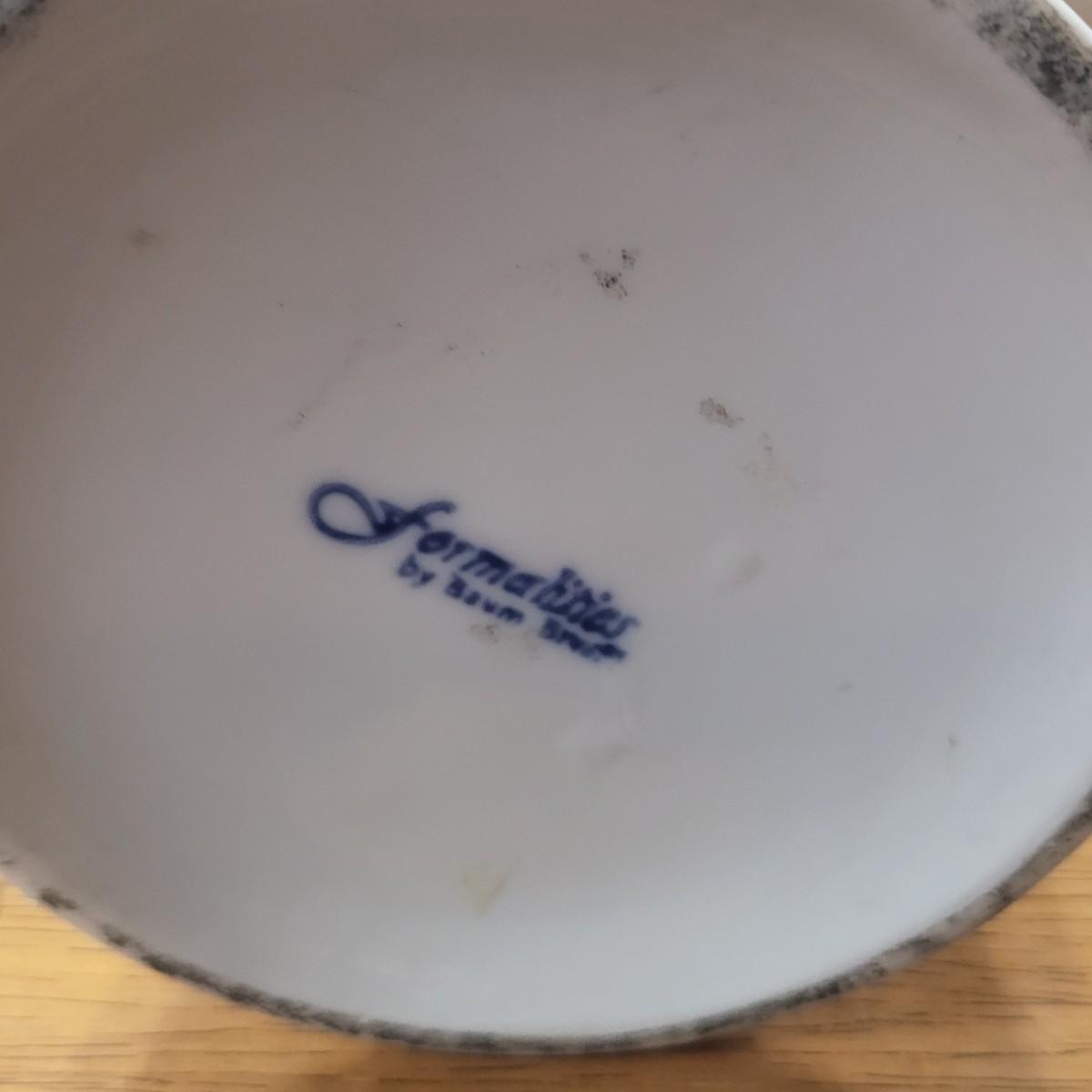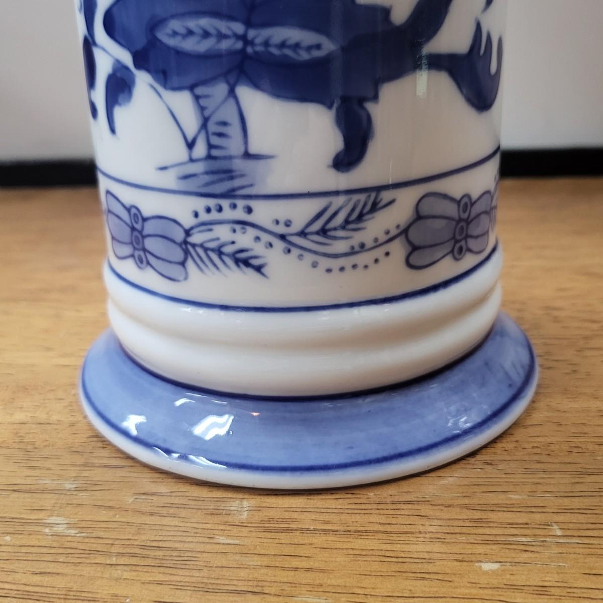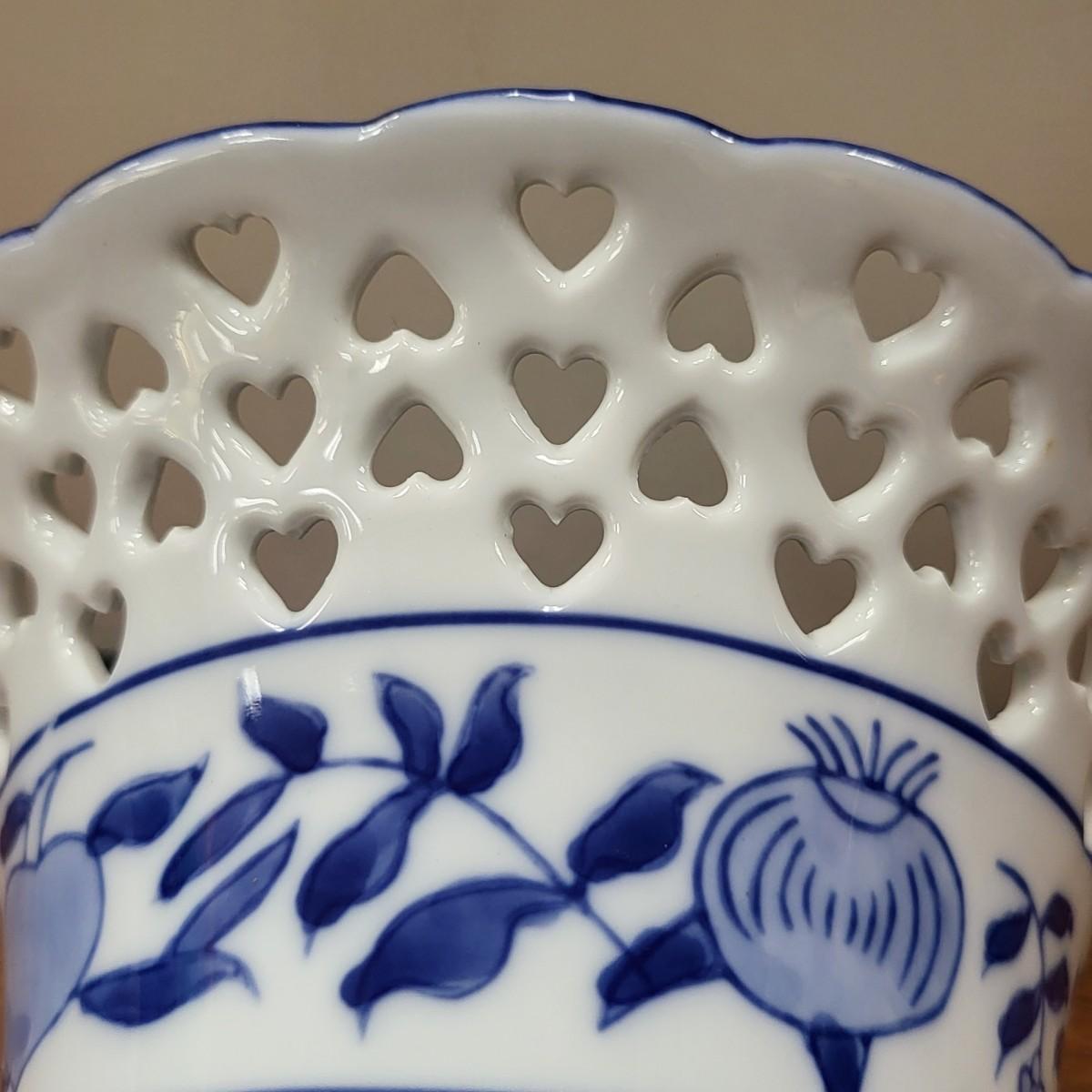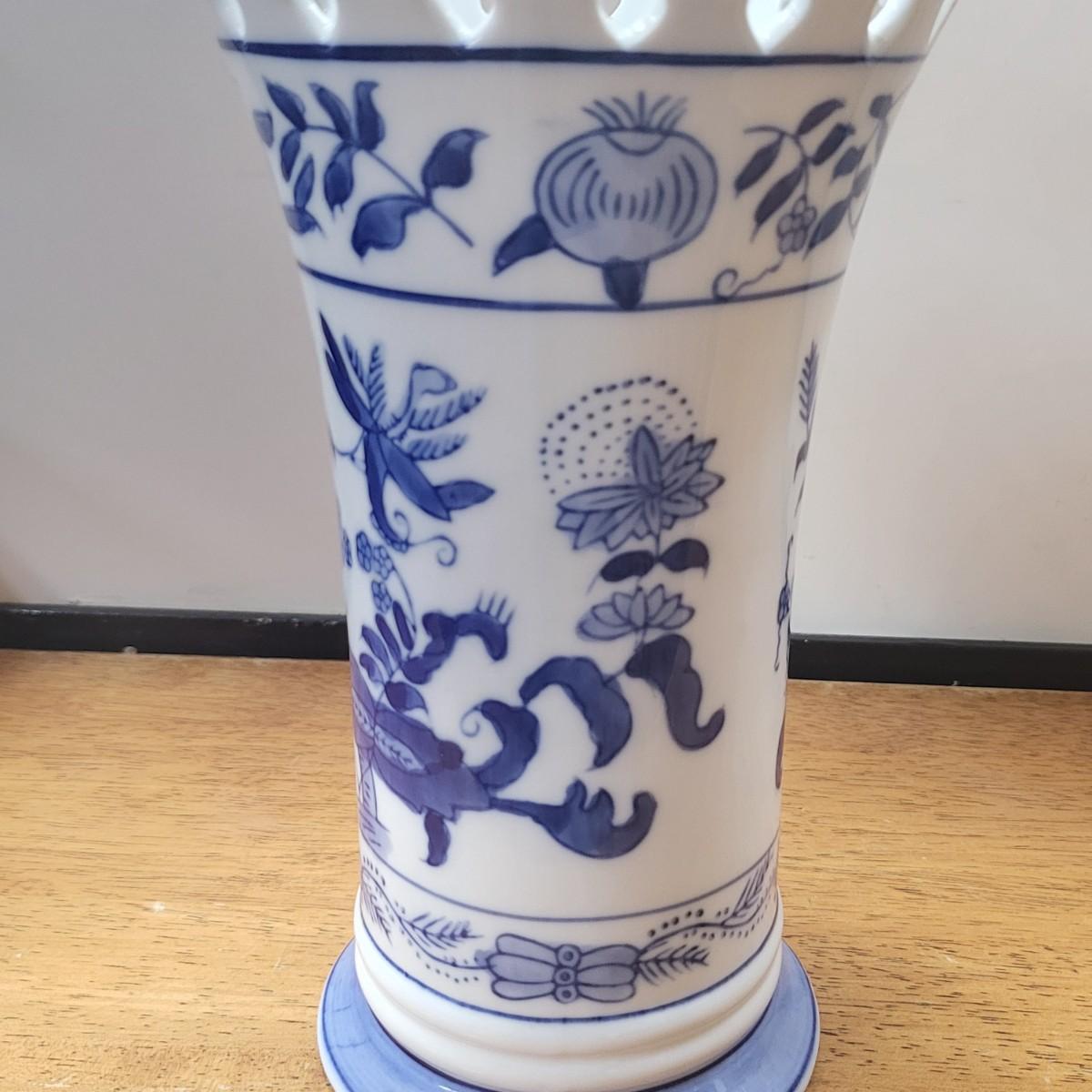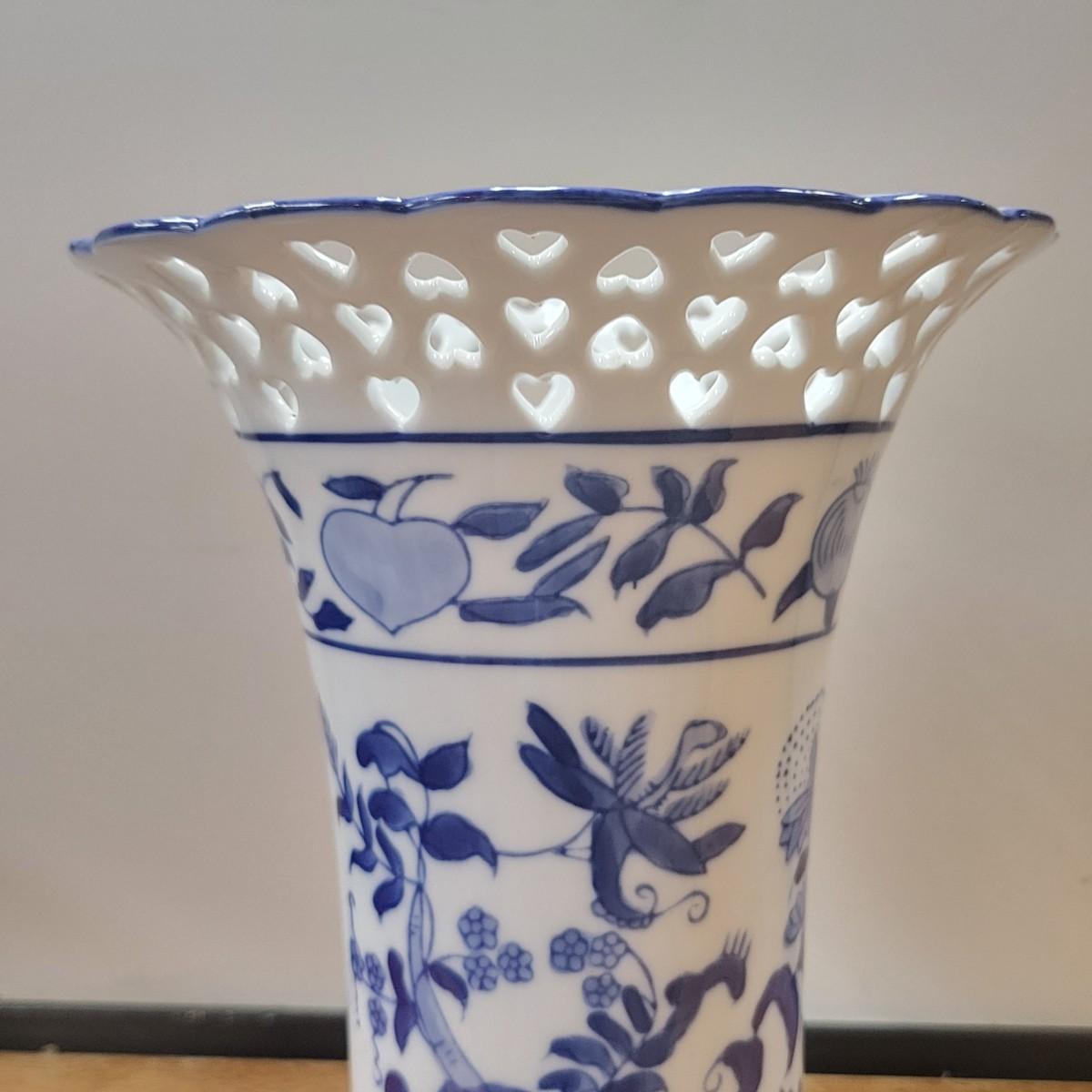 The vase measures 10.5" tall. Flares out at top to 7.5" round and base is 4.5" round. Handpainted, glazed blue & white. Hearts lattice pattern top.