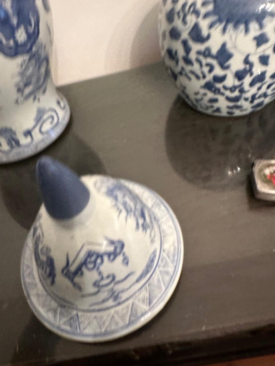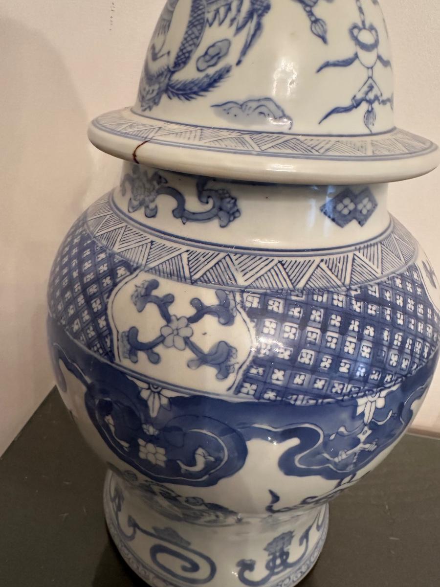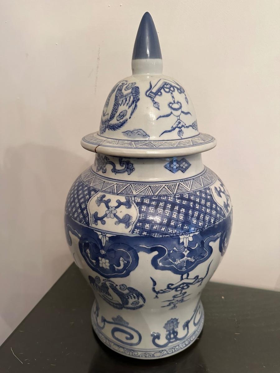 BLUE & WHITE LIDDED JAR, 17" TALL, AS PICTURED