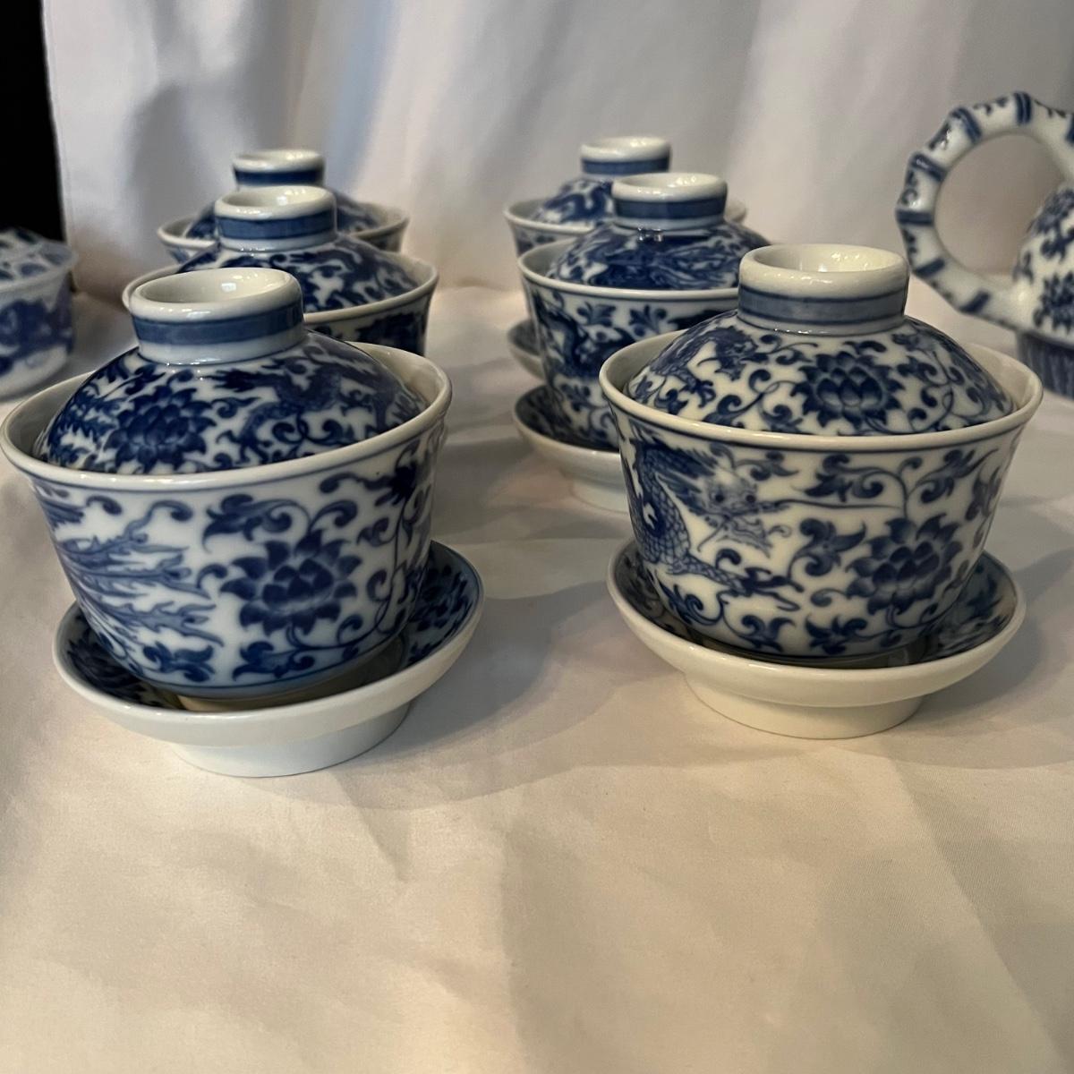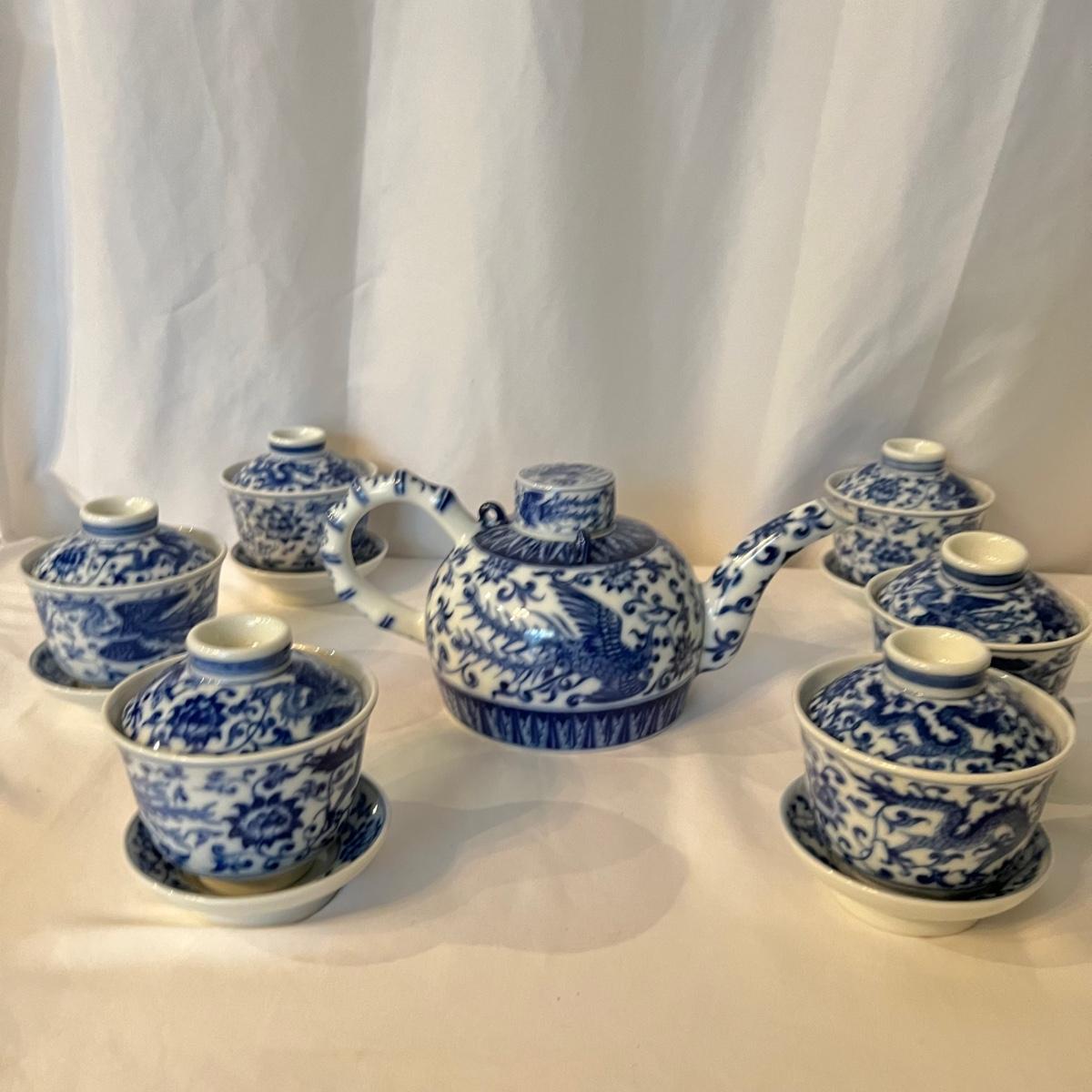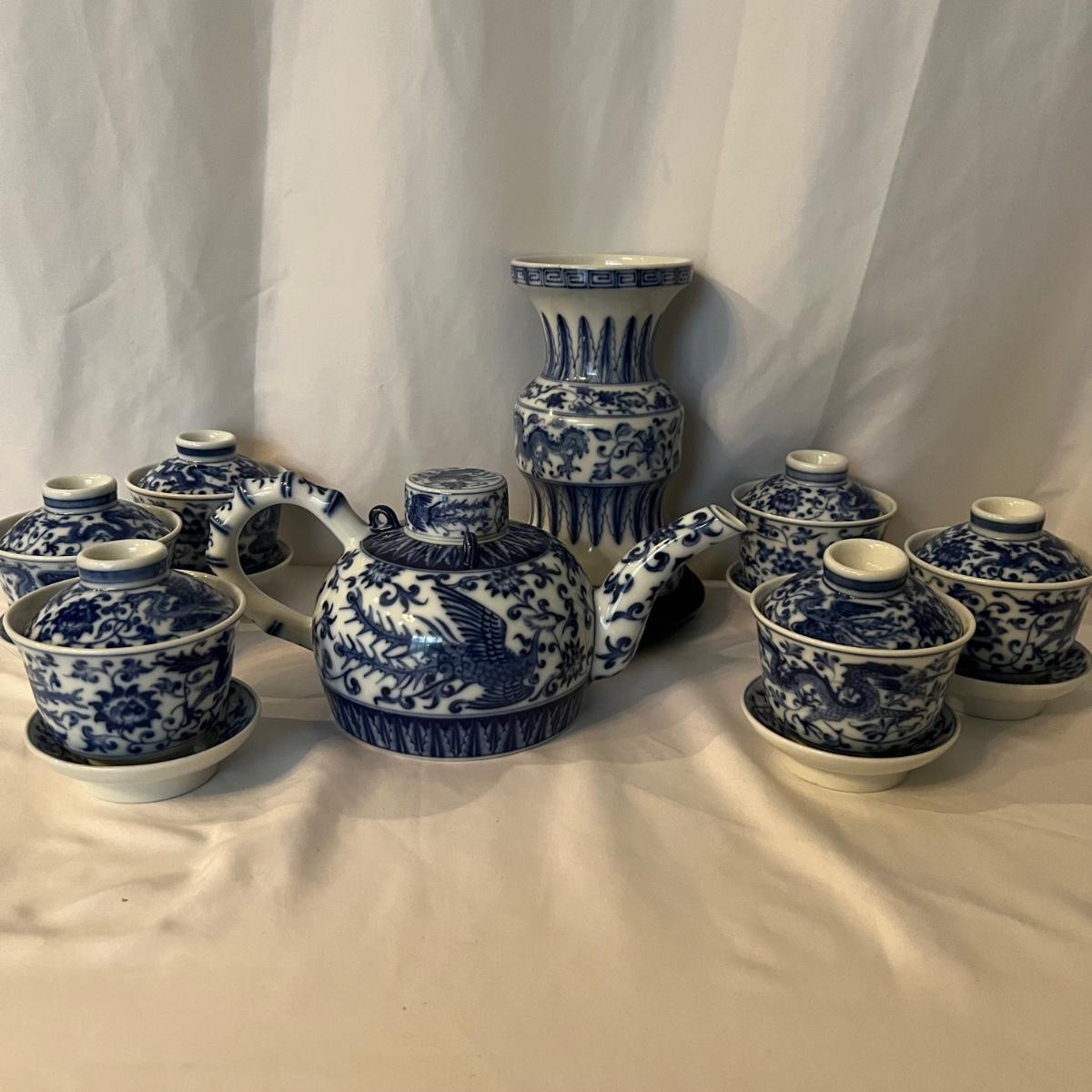 Six sets of three piece China tea cups, a teapot and a vase are all porcelain in a blue and white design. All pieces have makers marks, see images. The vase has a lightweight wood base.