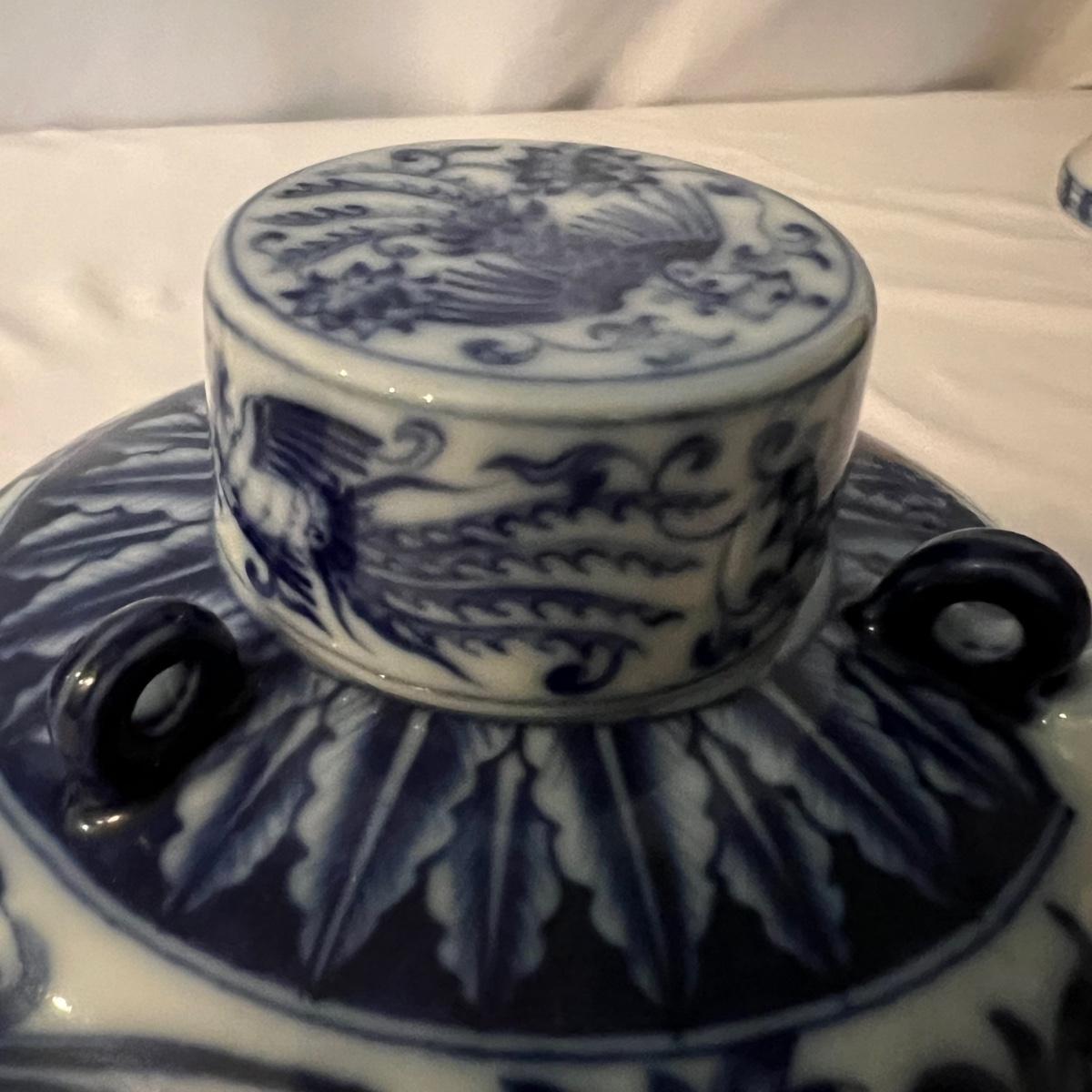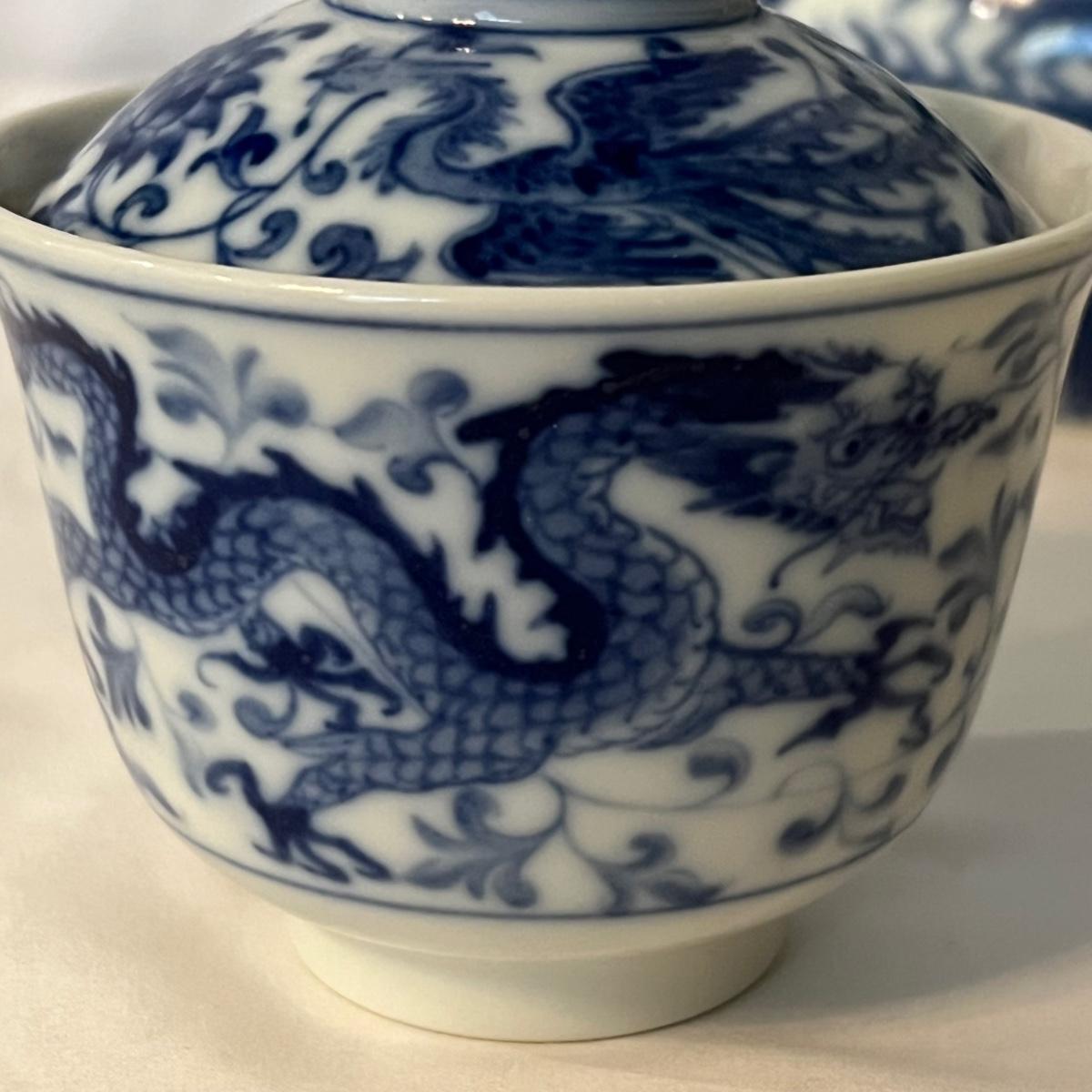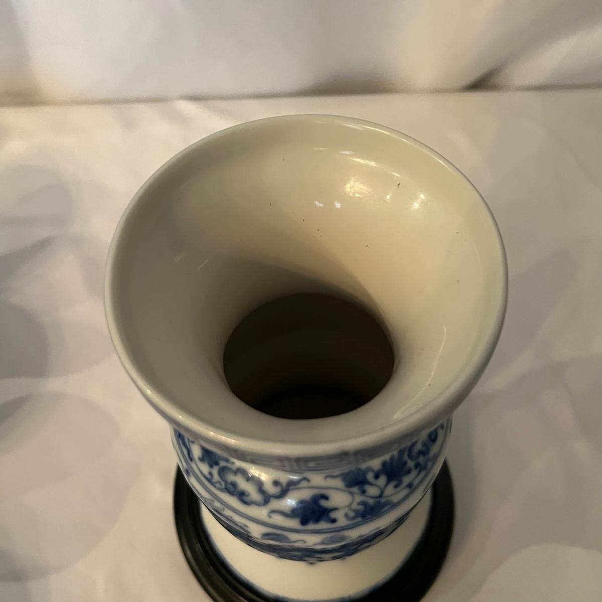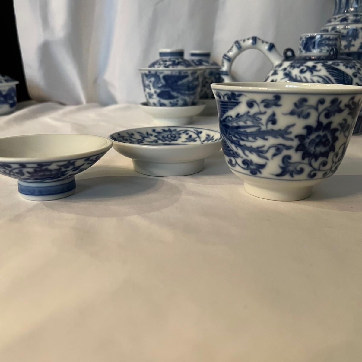 Six sets of three piece China tea cups, a teapot and a vase are all porcelain in a blue and white design. All pieces have makers marks, see images. The vase has a lightweight wood base.