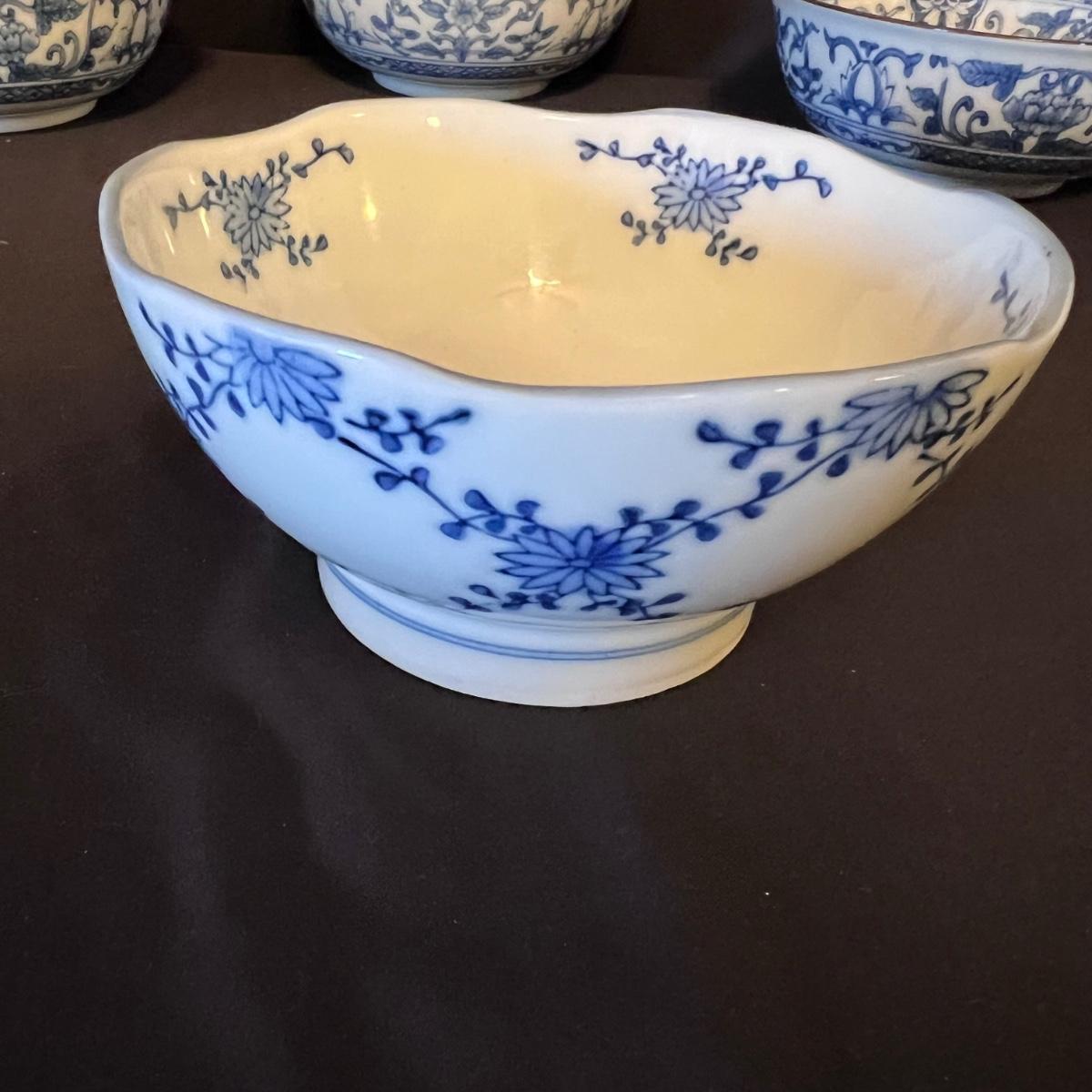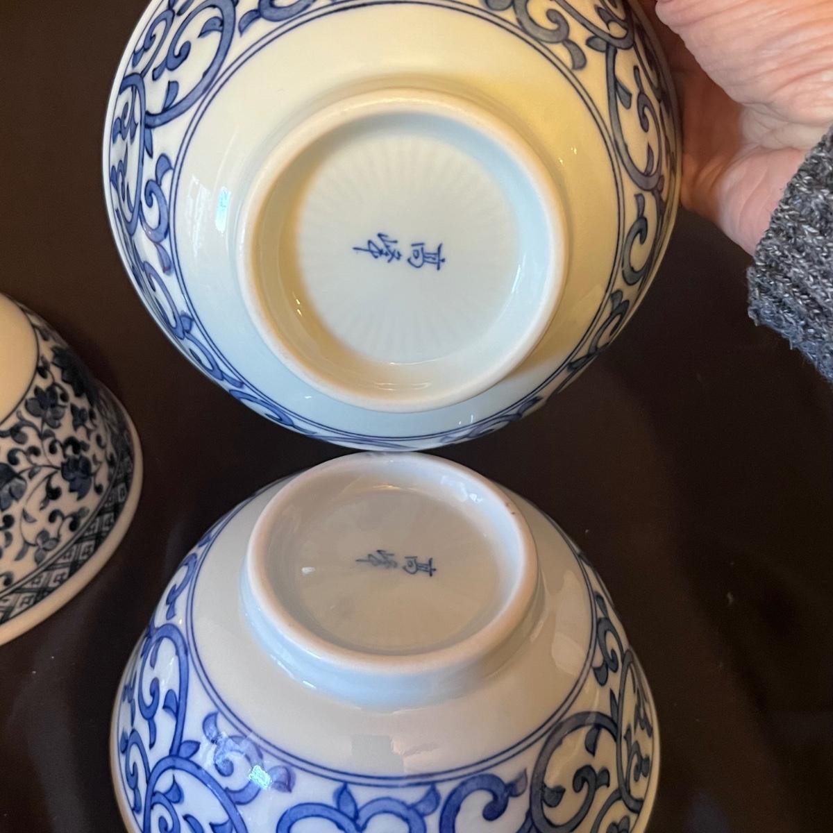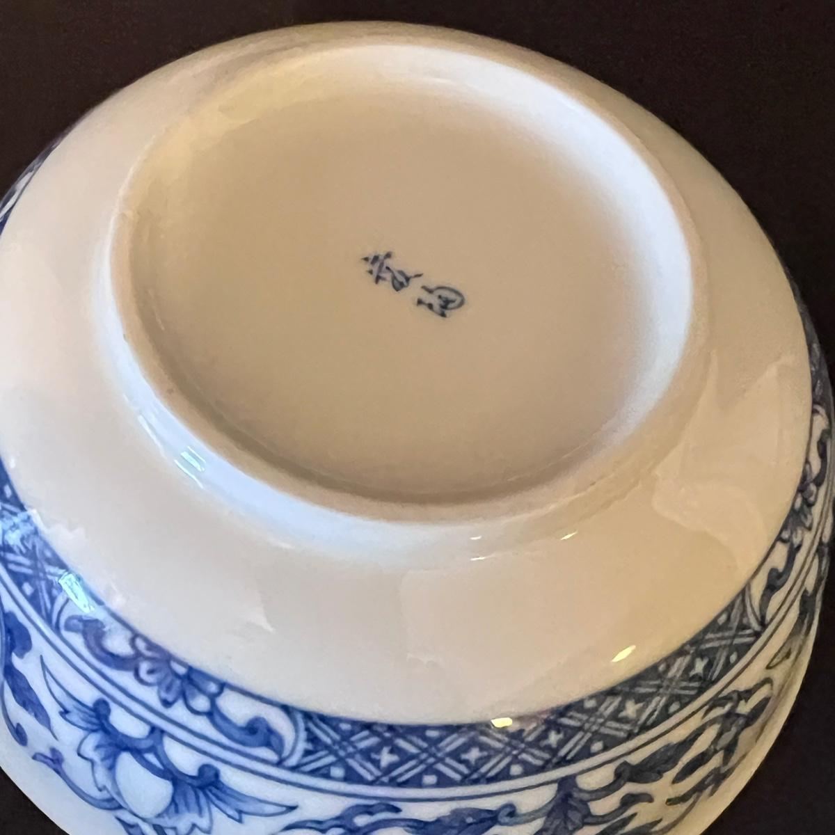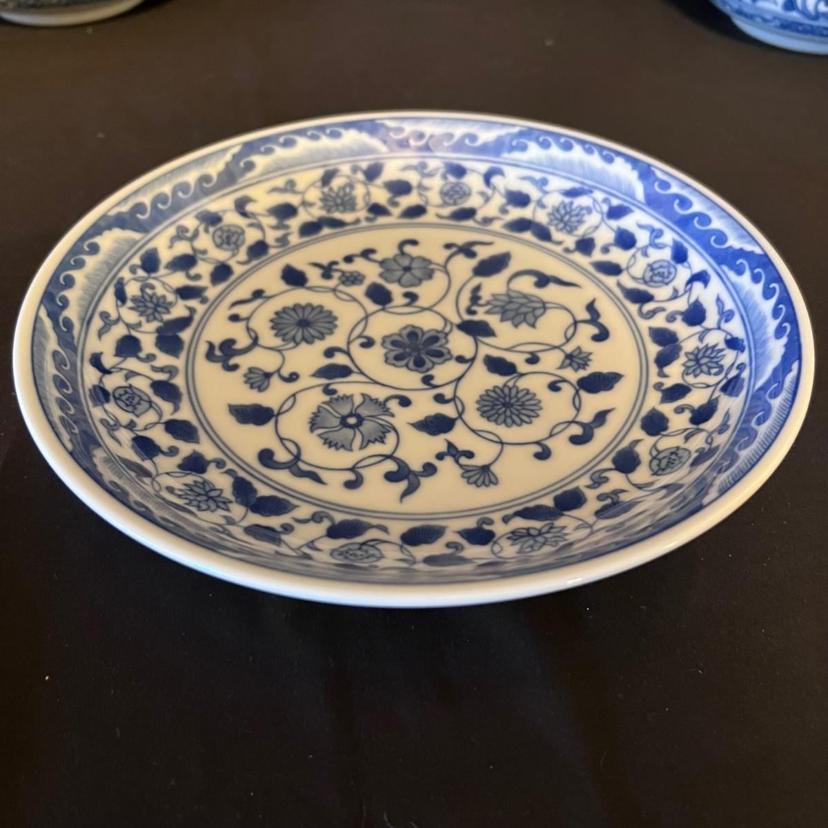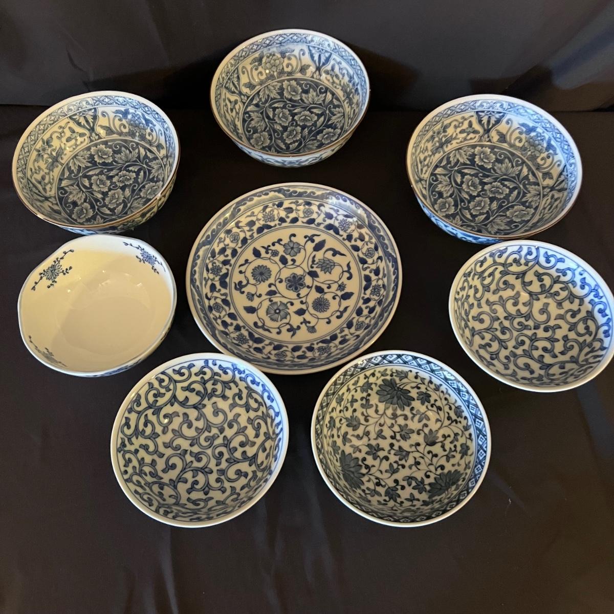 Assortment of blue and white porcelain dishes. The larger dish measures 9”D x 1.25”H. Three dishes with platinum rims are matching, note that one dish has 2 chips in its rim. There is one dish with more white than the rest and then there are three dishes, two of which have a matching pattern and all three have the same mfg mark.