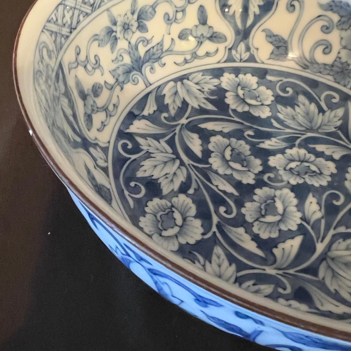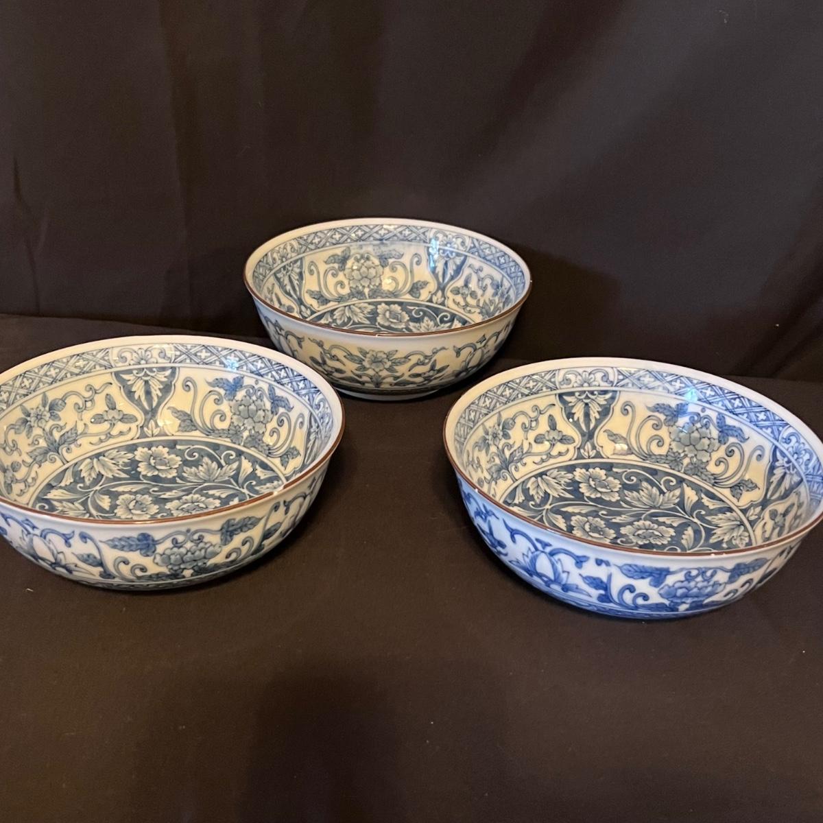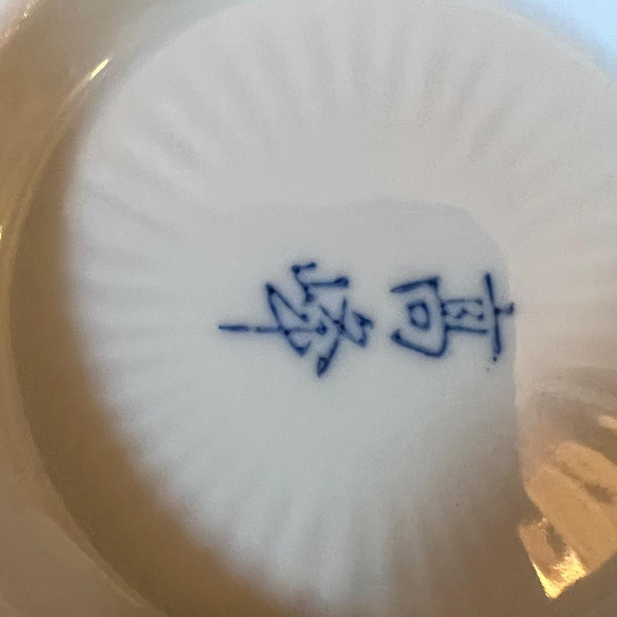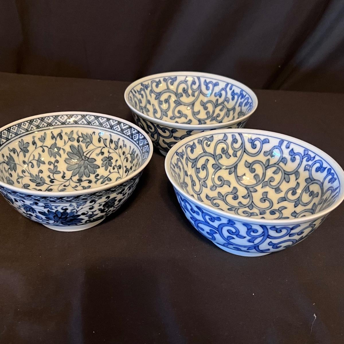 Assortment of blue and white porcelain dishes. The larger dish measures 9”D x 1.25”H. Three dishes with platinum rims are matching, note that one dish has 2 chips in its rim. There is one dish with more white than the rest and then there are three dishes, two of which have a matching pattern and all three have the same mfg mark.
