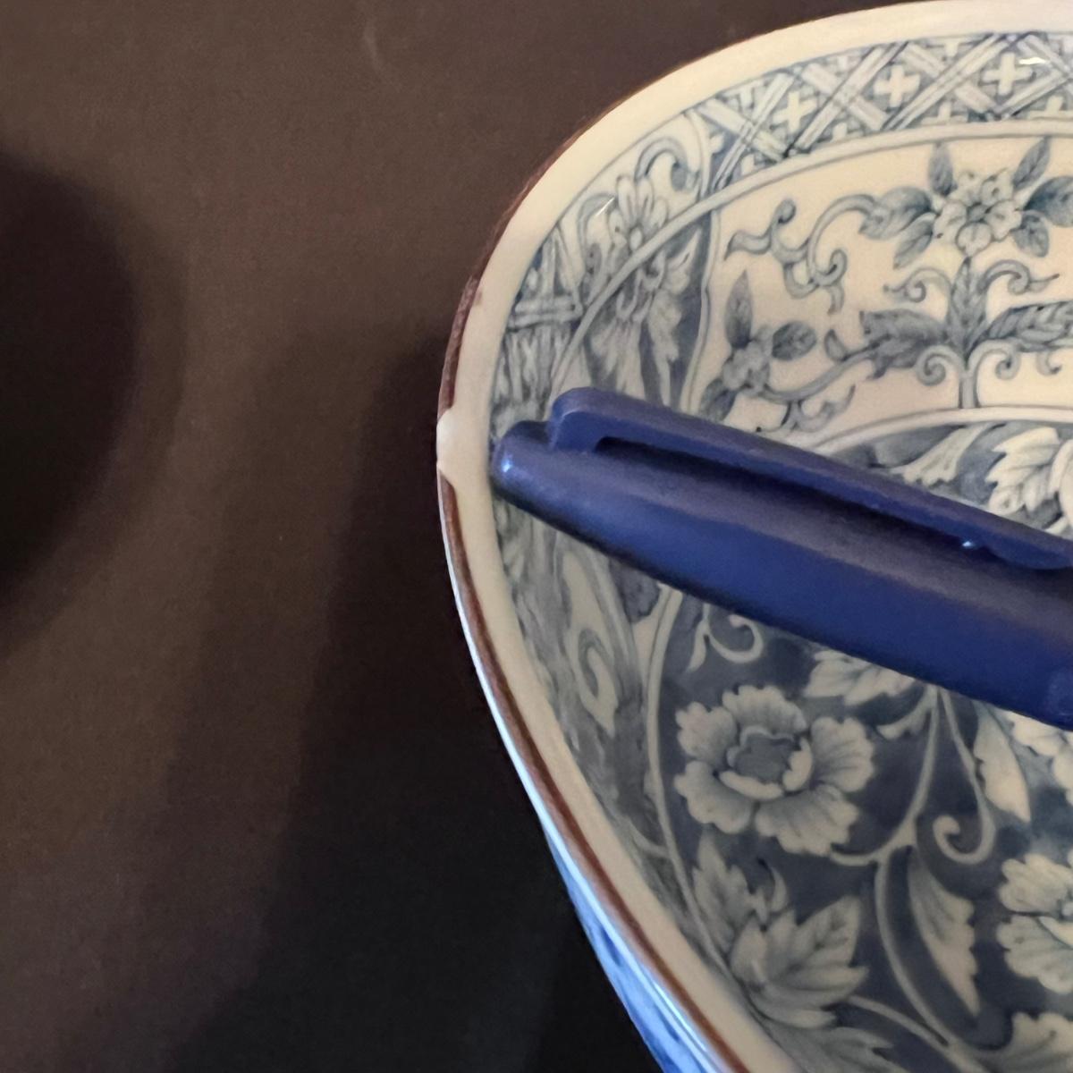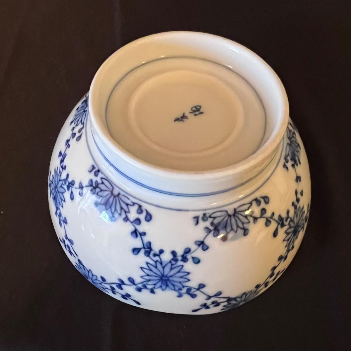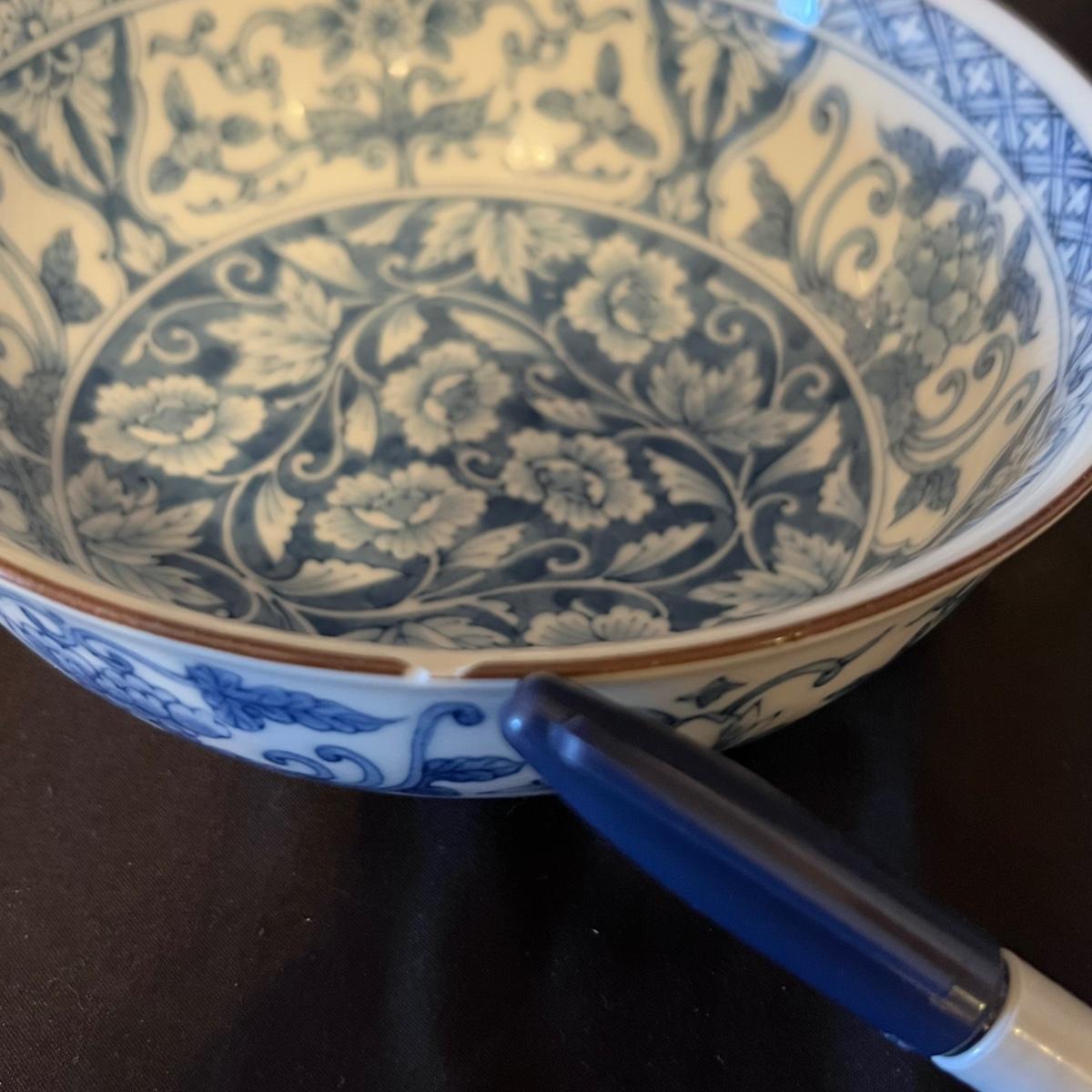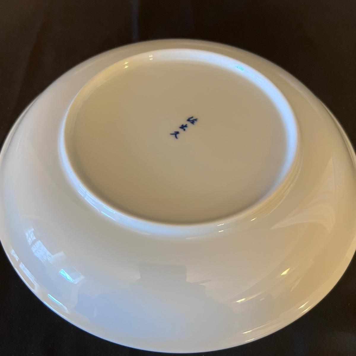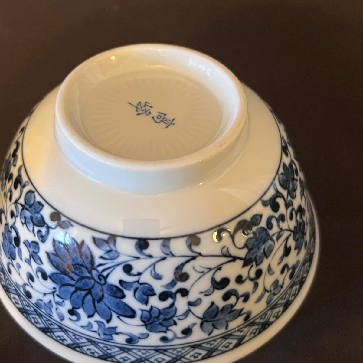 Assortment of blue and white porcelain dishes. The larger dish measures 9”D x 1.25”H. Three dishes with platinum rims are matching, note that one dish has 2 chips in its rim. There is one dish with more white than the rest and then there are three dishes, two of which have a matching pattern and all three have the same mfg mark.