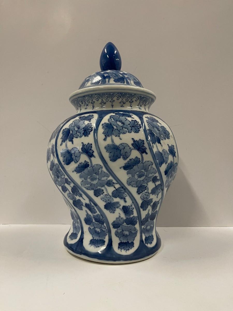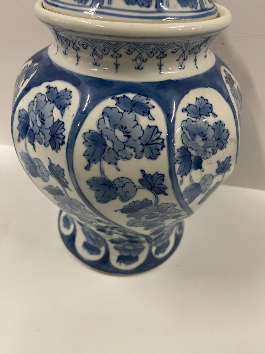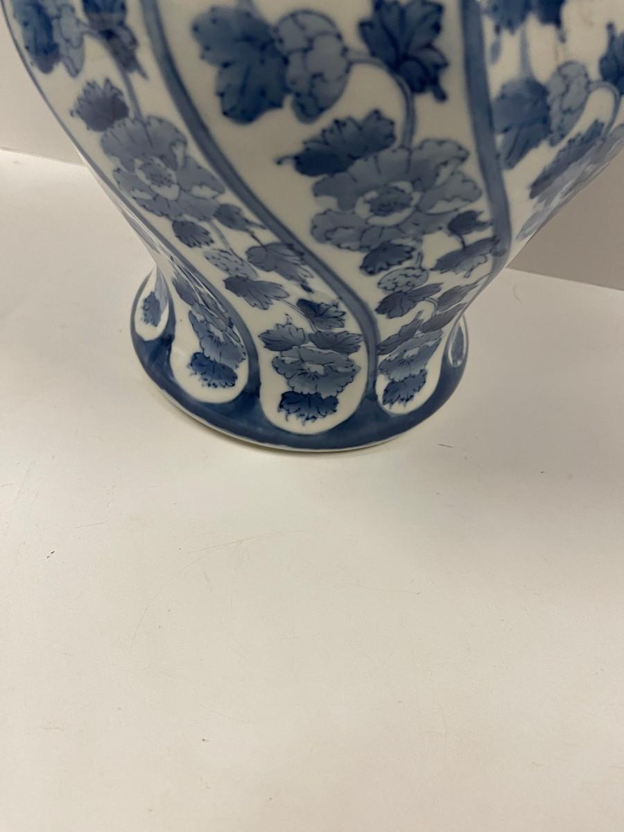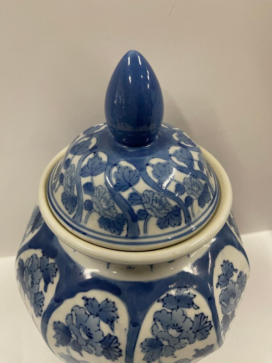 Blue and white porcelain ginger jar. Has floral motif. Very good condition, no chips, cracks or repairs. 12/4" to top of finial.