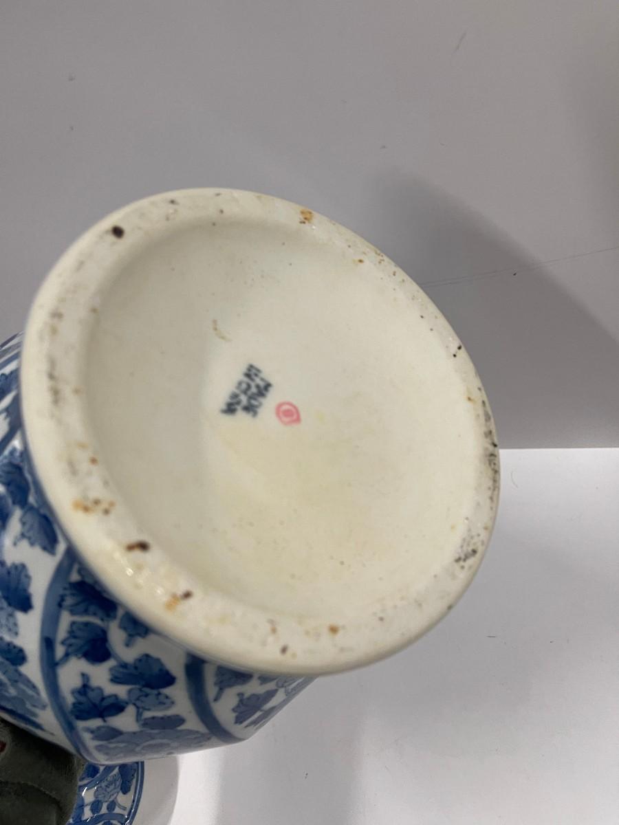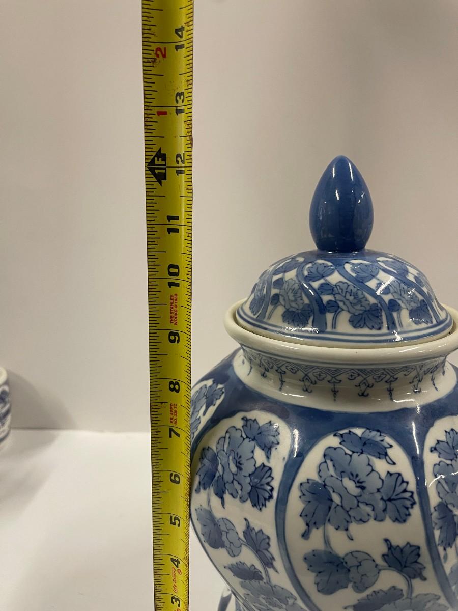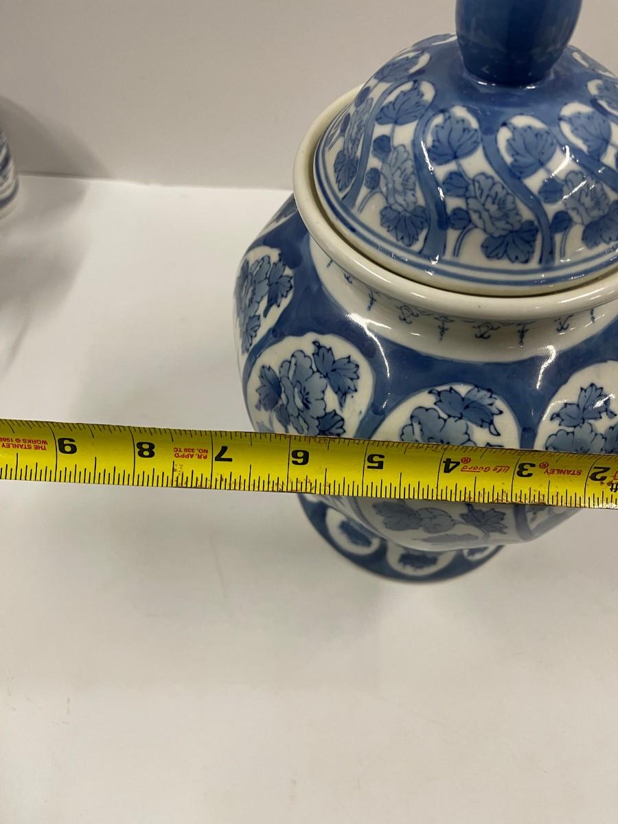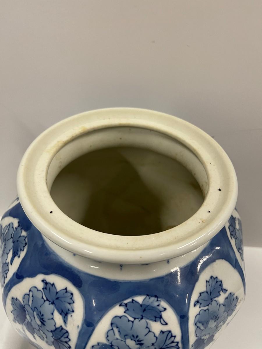 Blue and white porcelain ginger jar. Has floral motif. Very good condition, no chips, cracks or repairs. 12/4" to top of finial.
