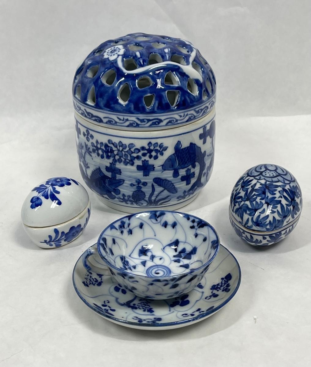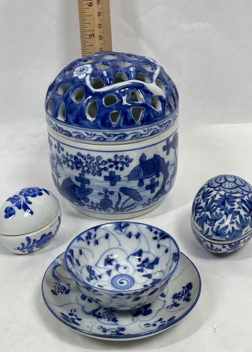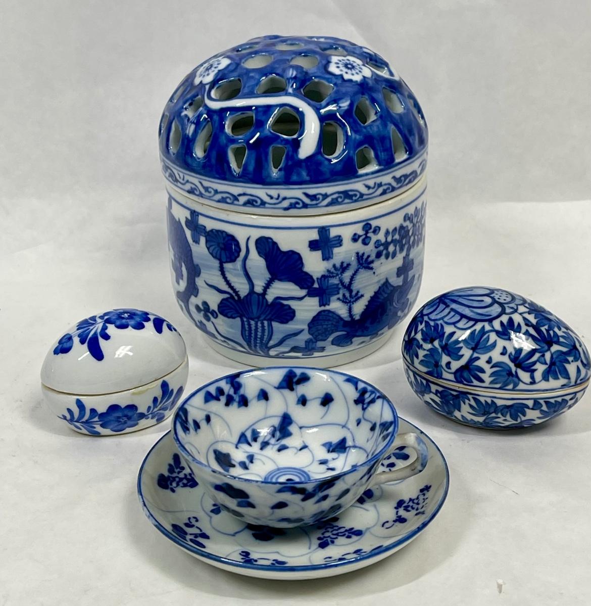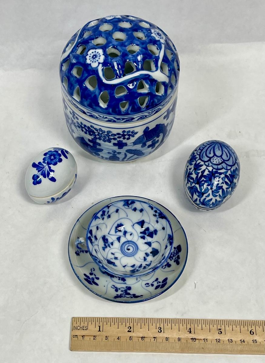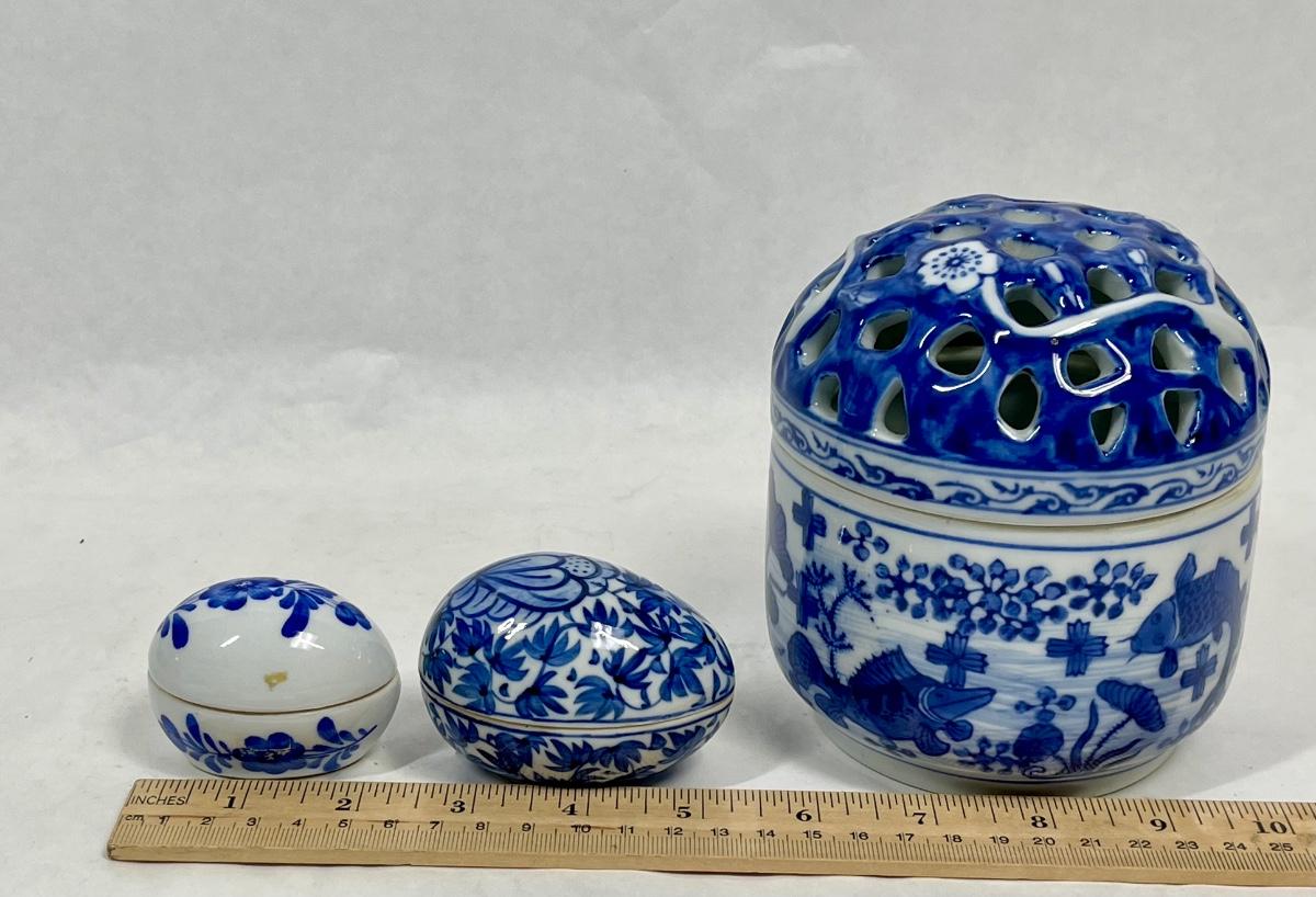 Delft chintz potpourri and trinket egg boxes in good condition.