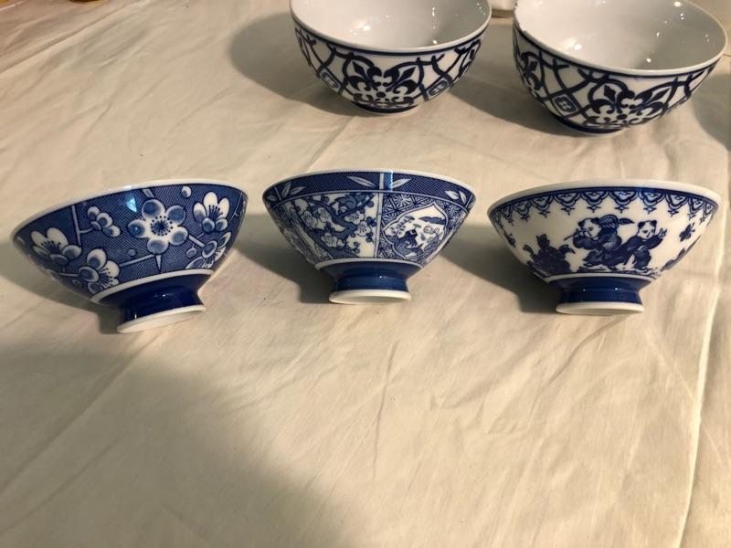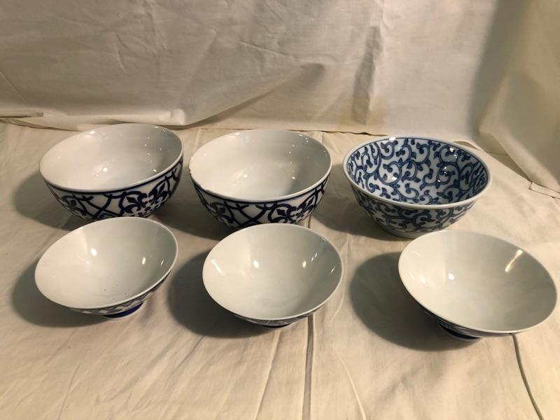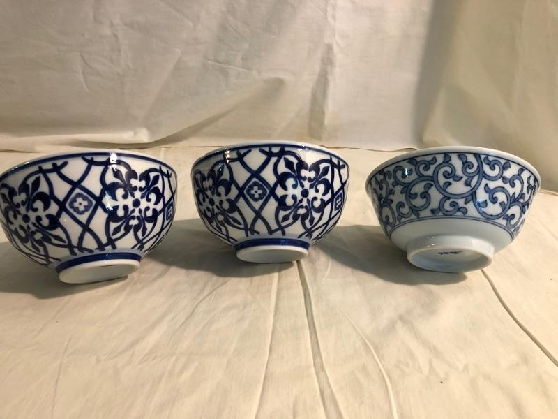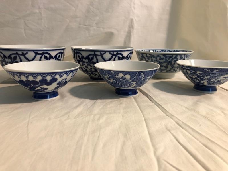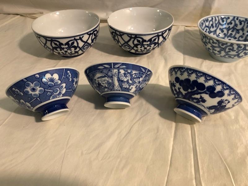 Set of 3 large blue and white asian rice bowl with set of 3 small blue and white asian rice bowls large bowls are 6in in diameter and 3in tall at the rim, the small bowls are 4.5 in diameter and 2.25 in tall at the rim