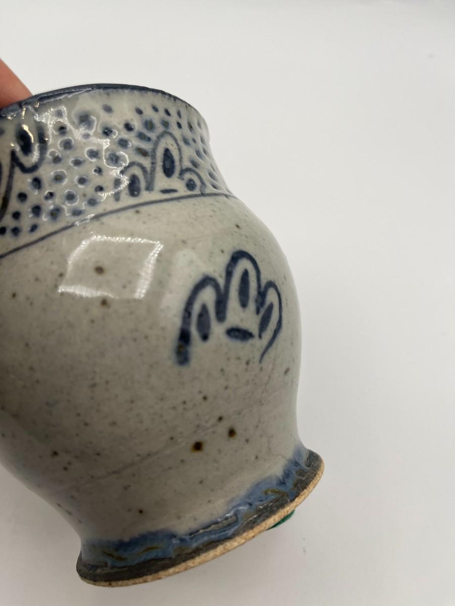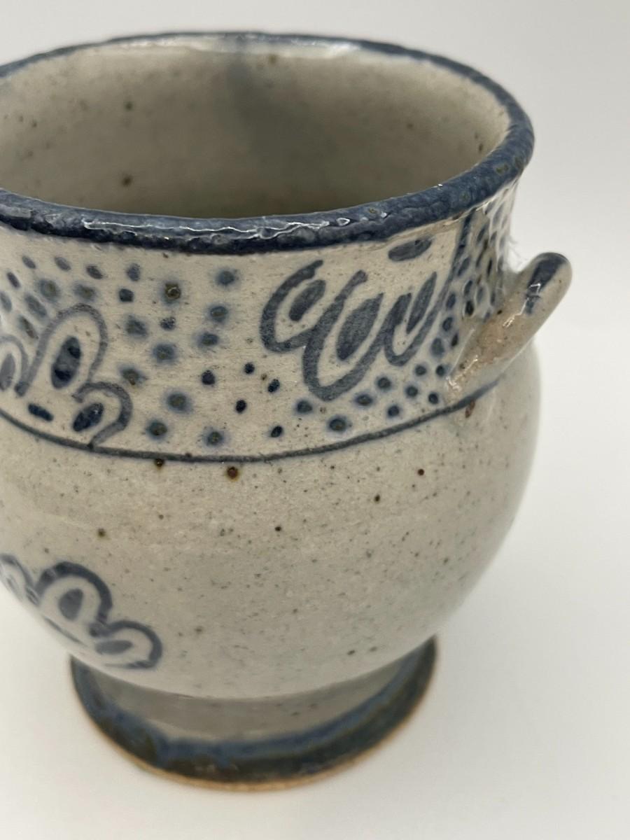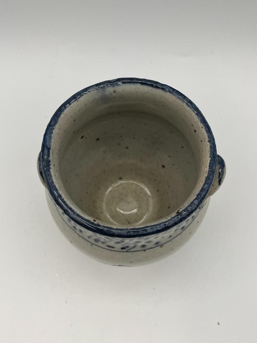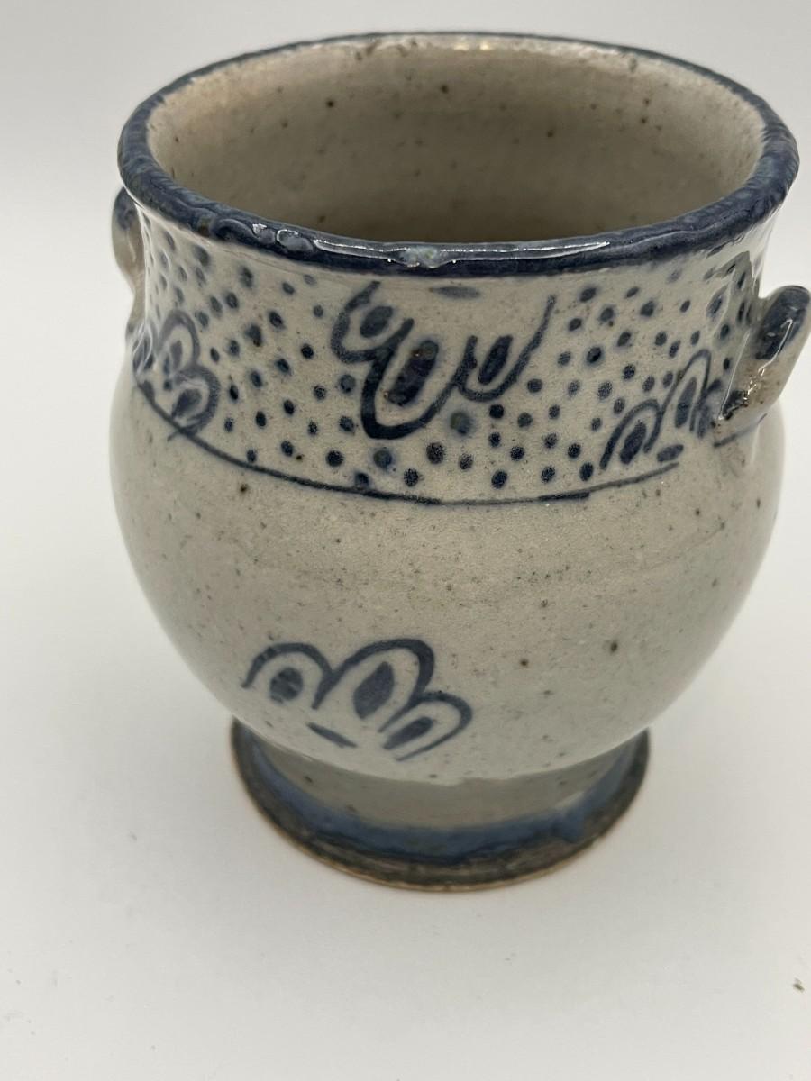 Traditional blue & white salt glaze pottery piece with handles. We can't quite make out the signature, but this is definitely a piece of handmade pottery in the Early American or Canadian tradition. Similar pieces are made by Colonial Williamsburg traditional potters. 3" Diameter at mouth x 4" H # 723