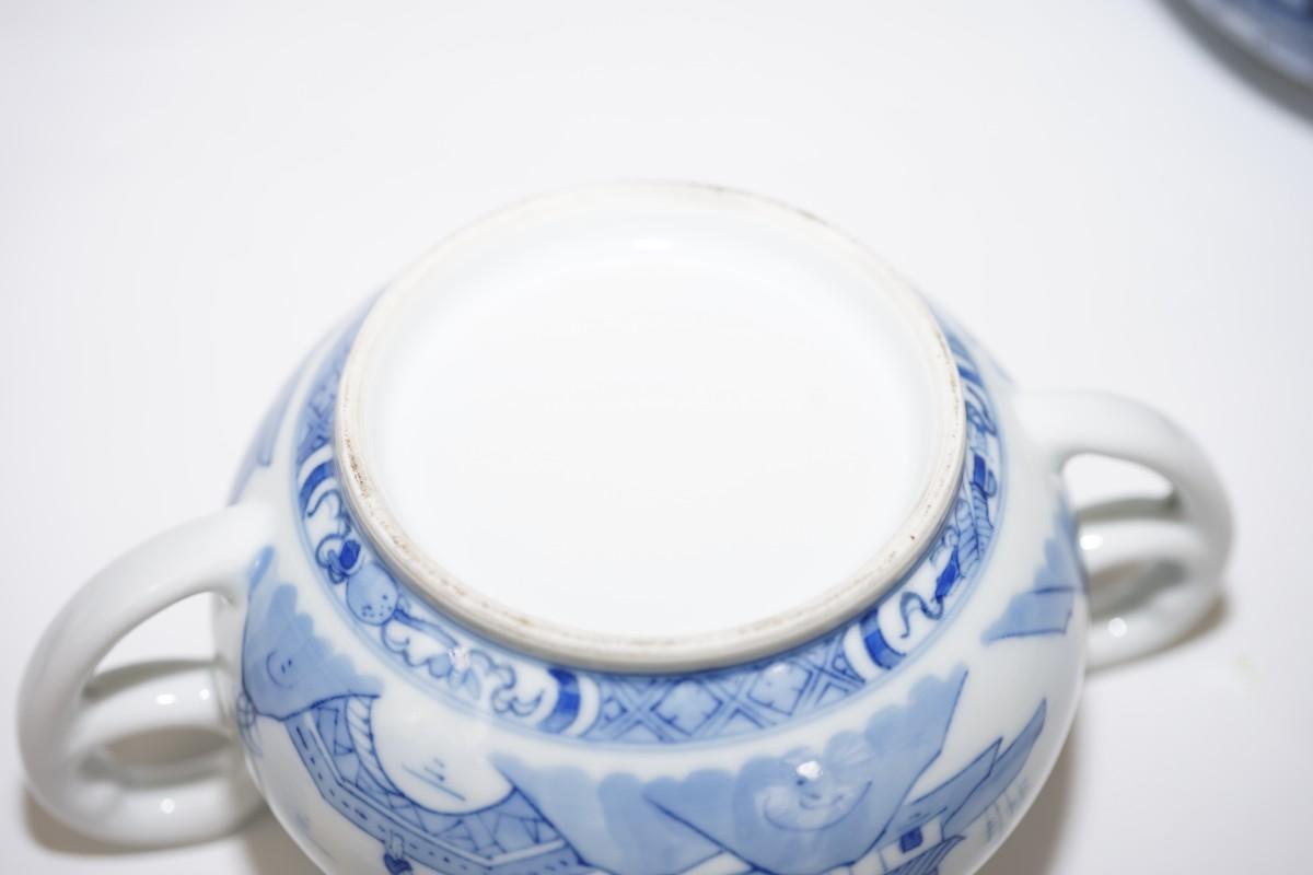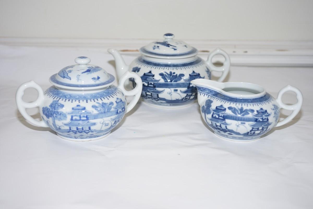 BLUE WILLOW TEA SET . TEAPOT, CREAMER AND SUGAR