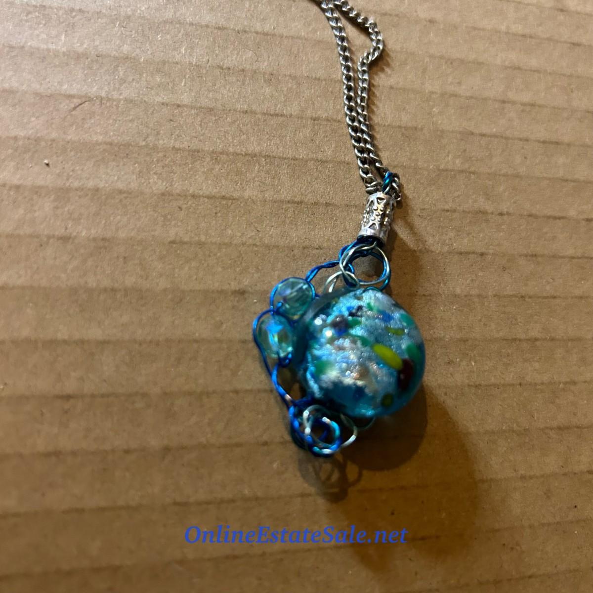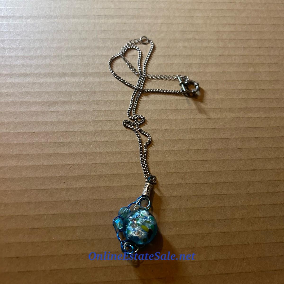 22in Silver Colored Chain with Blue Stone and Wire Pendant and Toggle Clasp
