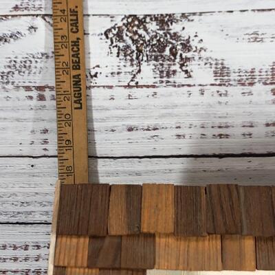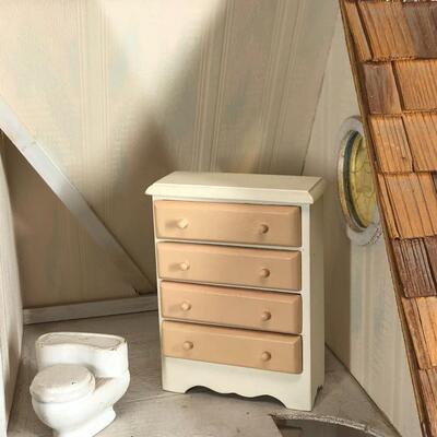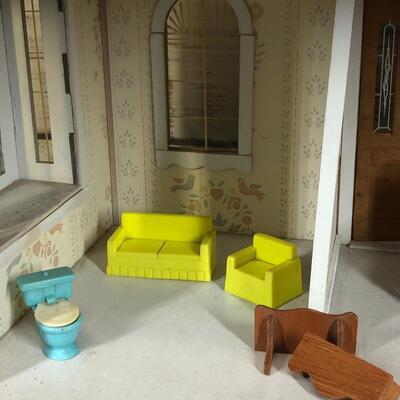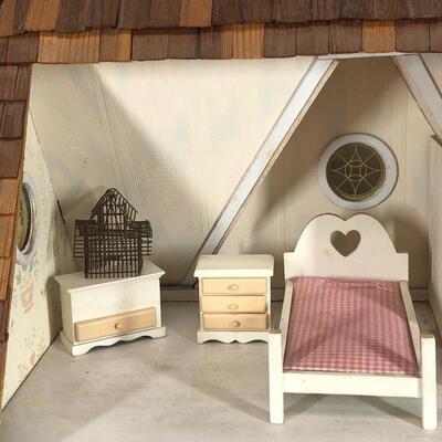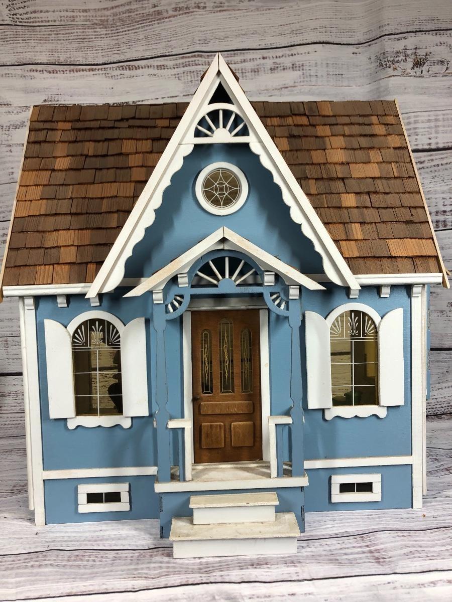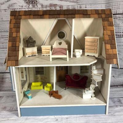 Cute two story cottage dollhouse. White trim on blue, wood shingle roof. Comes with furniture shown. About 17" wide and 18" tall. Good displayed condition