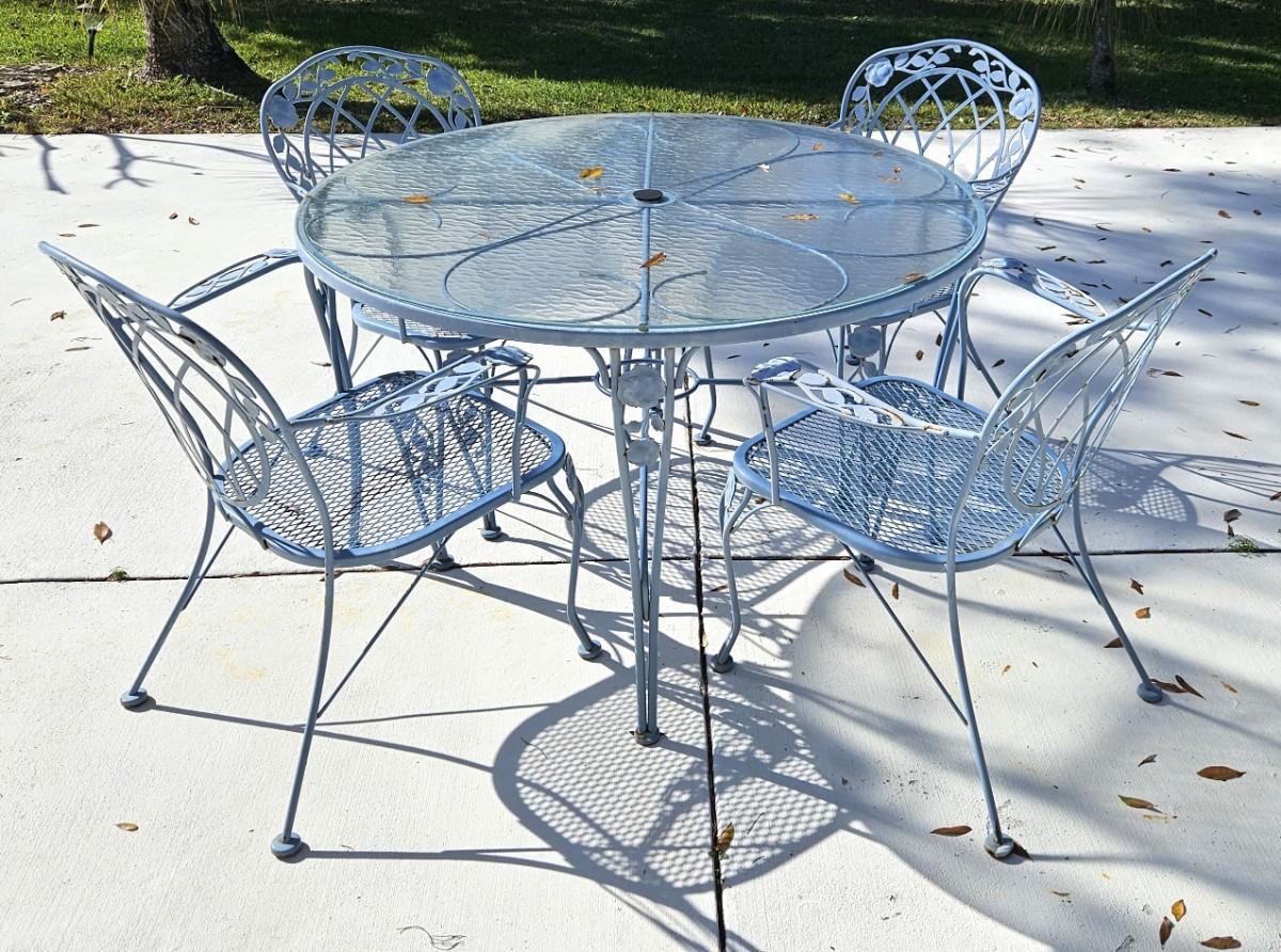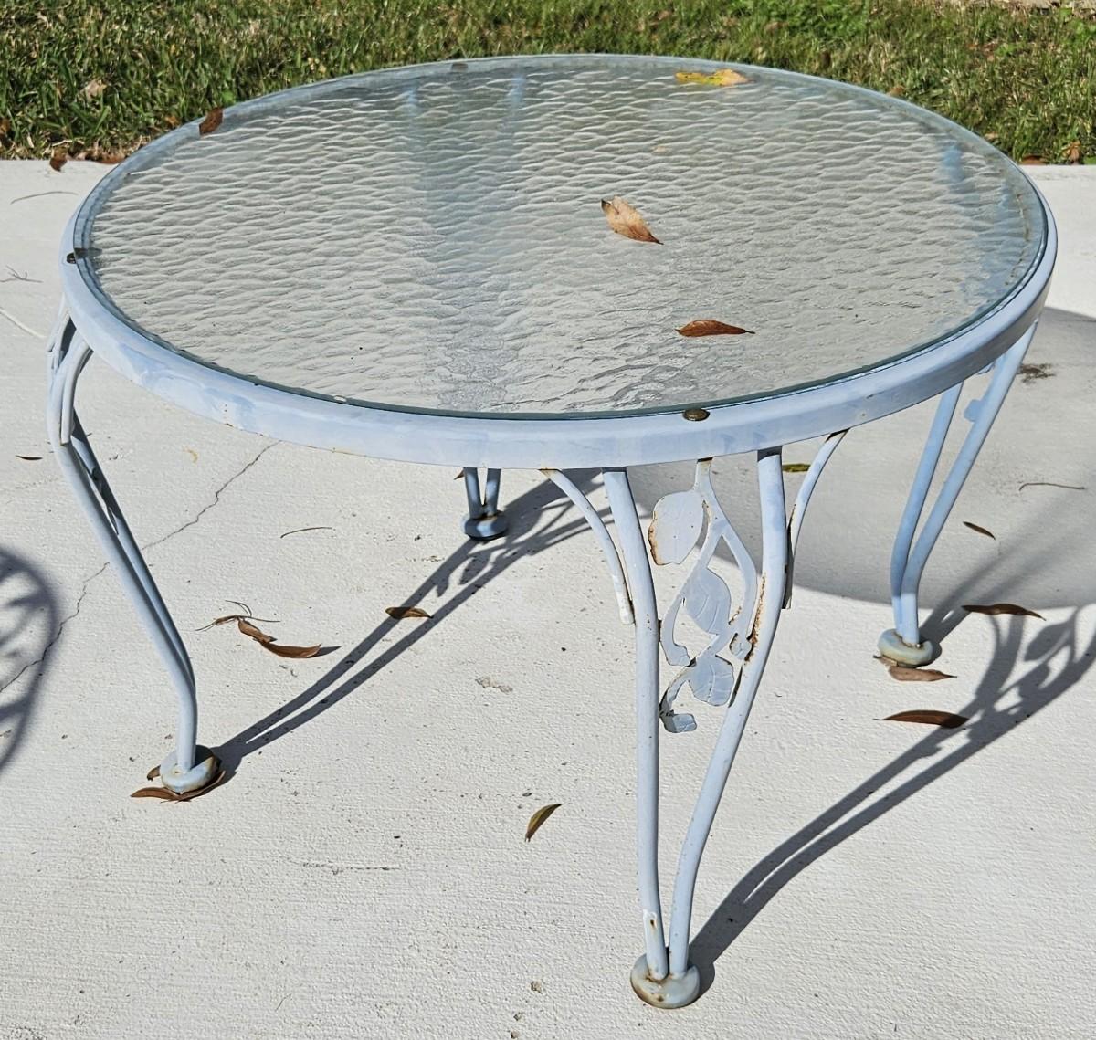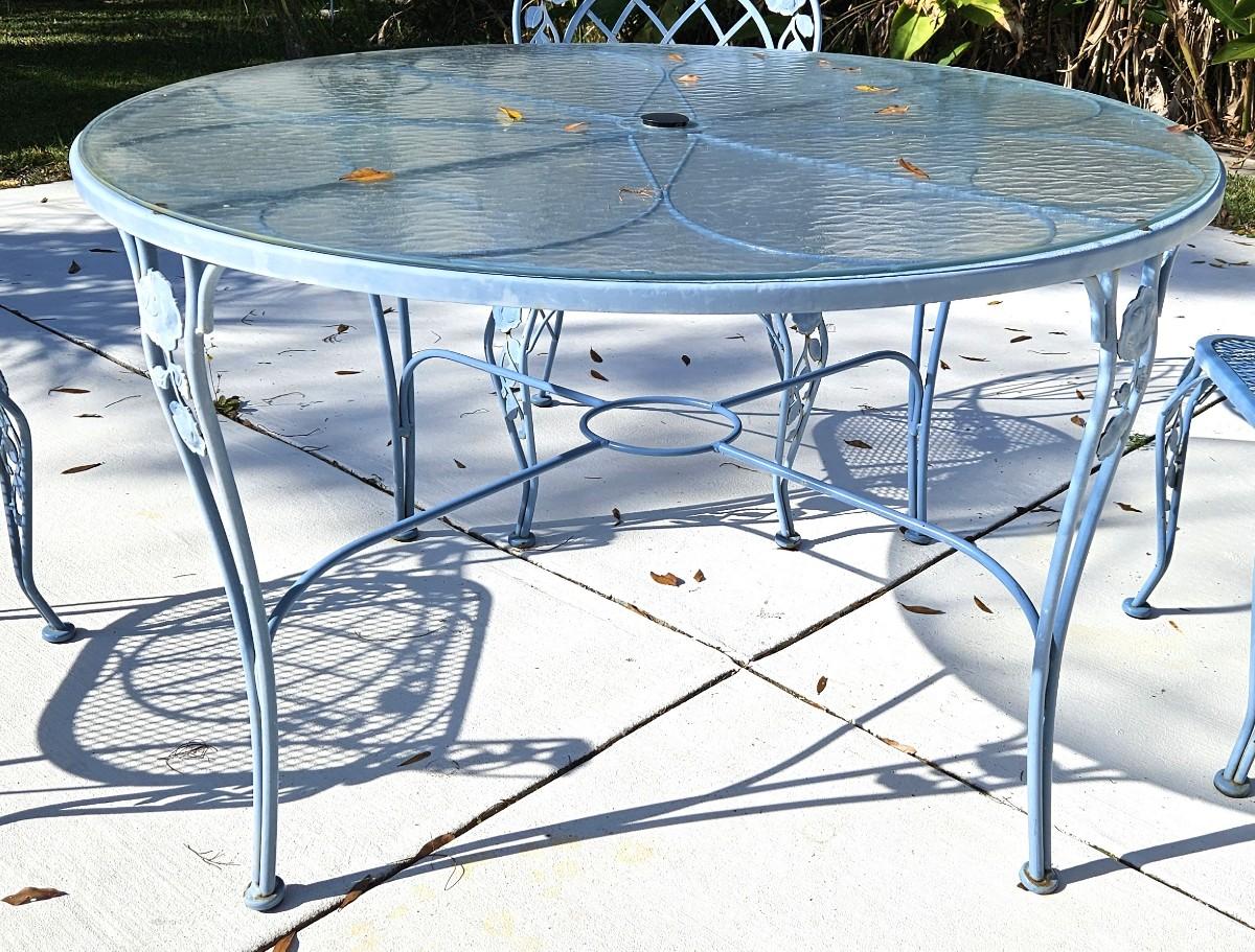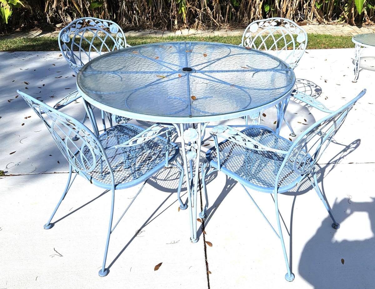 Blue Wrought Iron Table with Glass Top and Chair Set with Additional Side Table