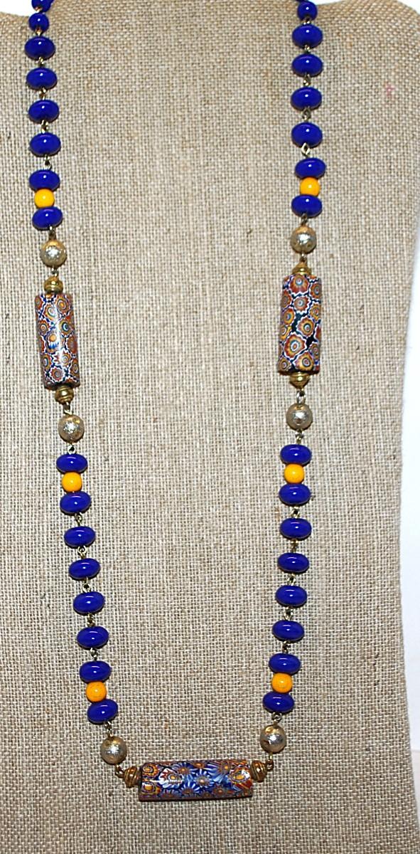 Blue & Yellow Beaded NECKLACE with 3 Large Multi-Color Flower-Designed Cylinders & Gold Colored Globe Accents 28" L