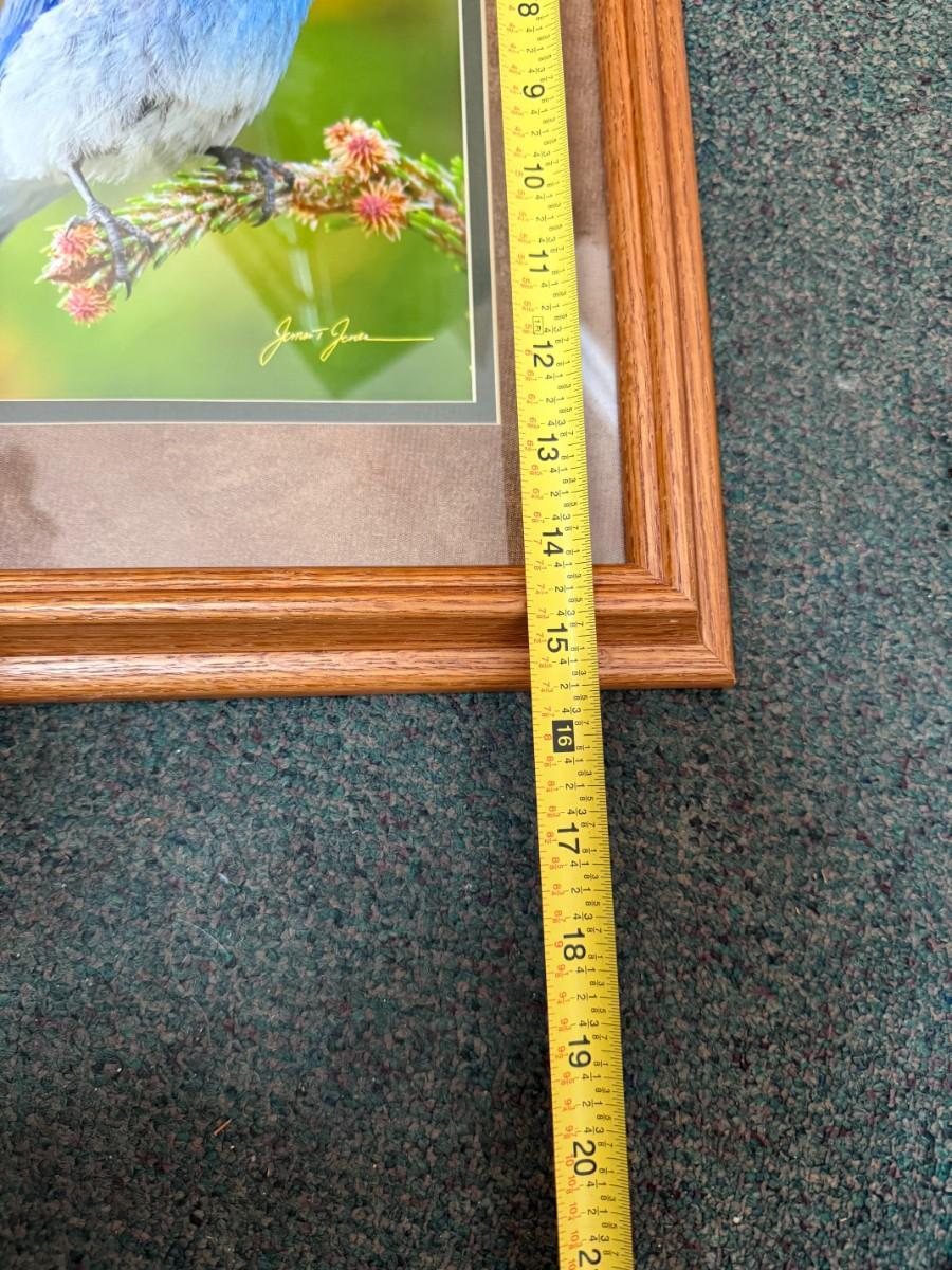 A charming signed artwork featuring bluebirds, perfect for bird lovers looking to add a pop of color to their decor.
