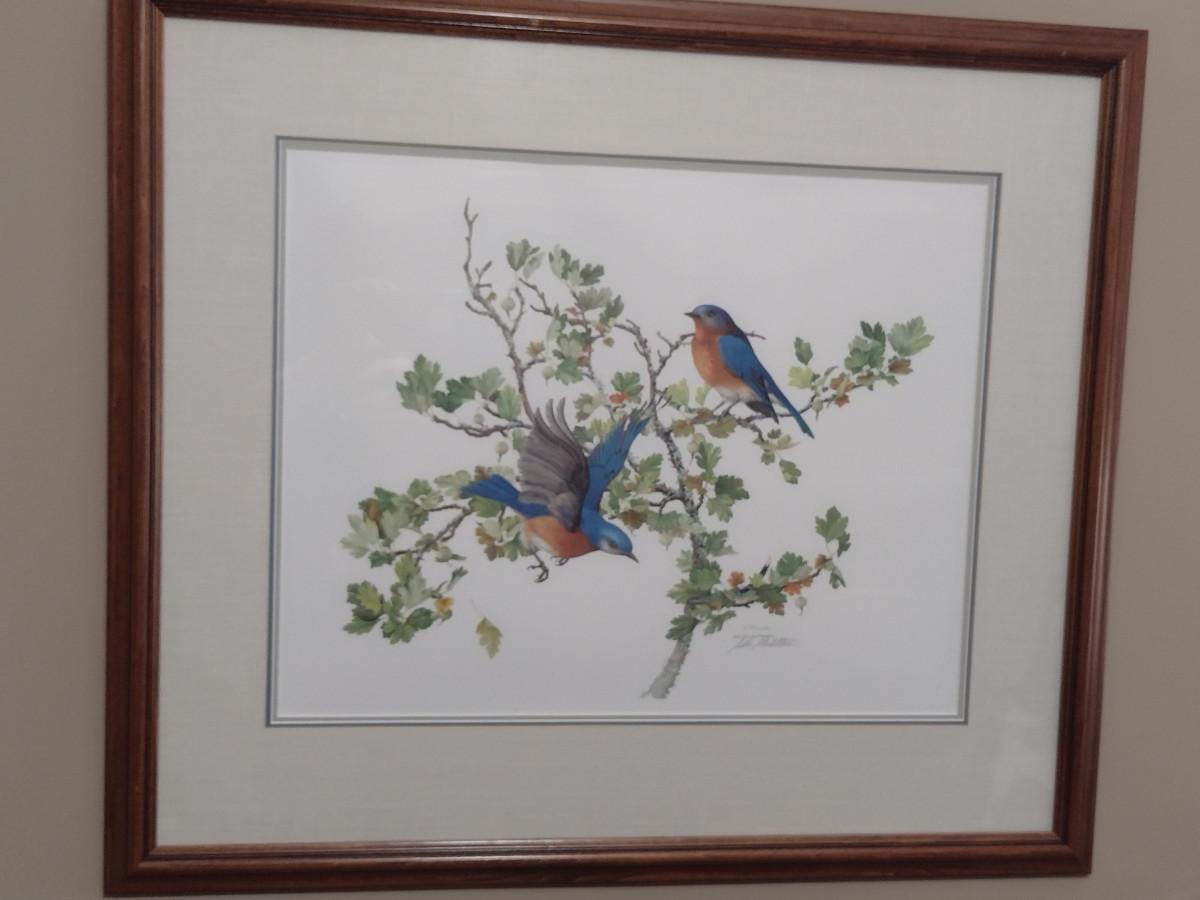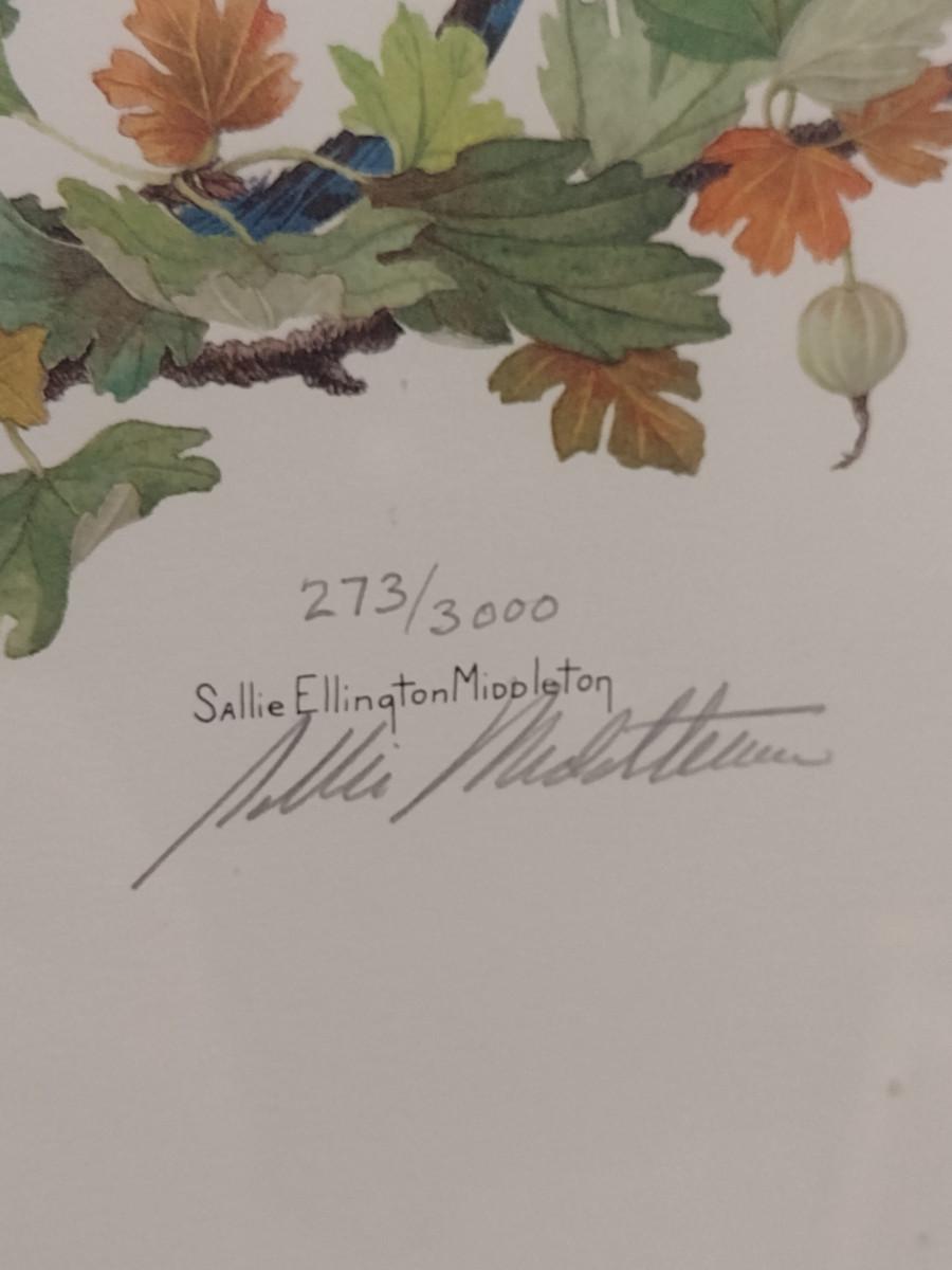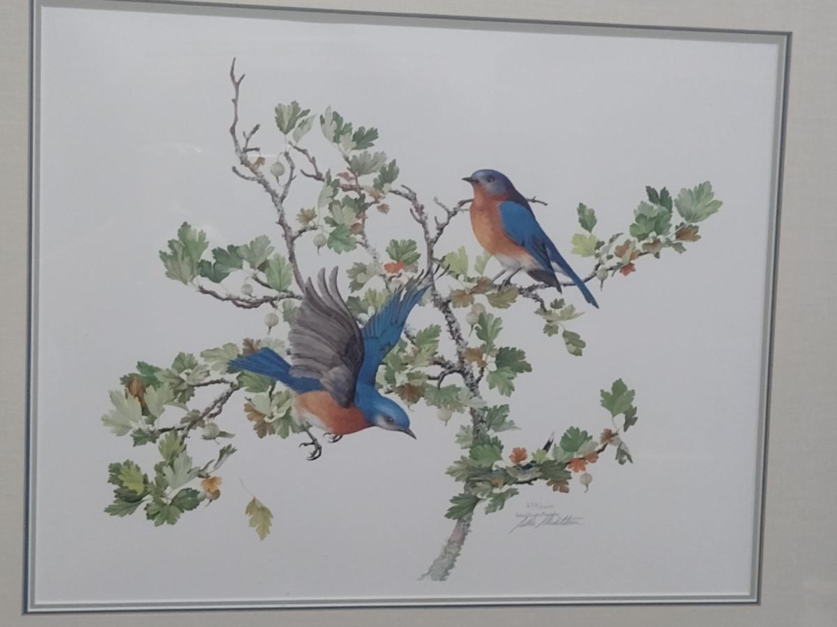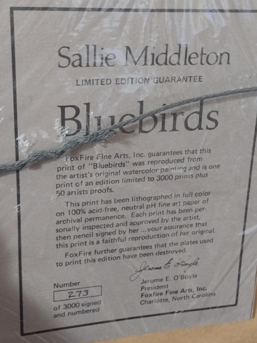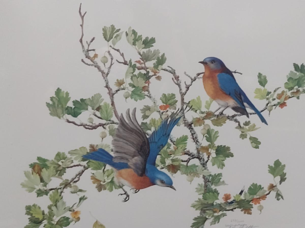 'Bluebirds' by Sallie Ellington Middleton- Double Signed and Numbered- Framed Under Glass- Approx 30 3/4" x 26 1/4"