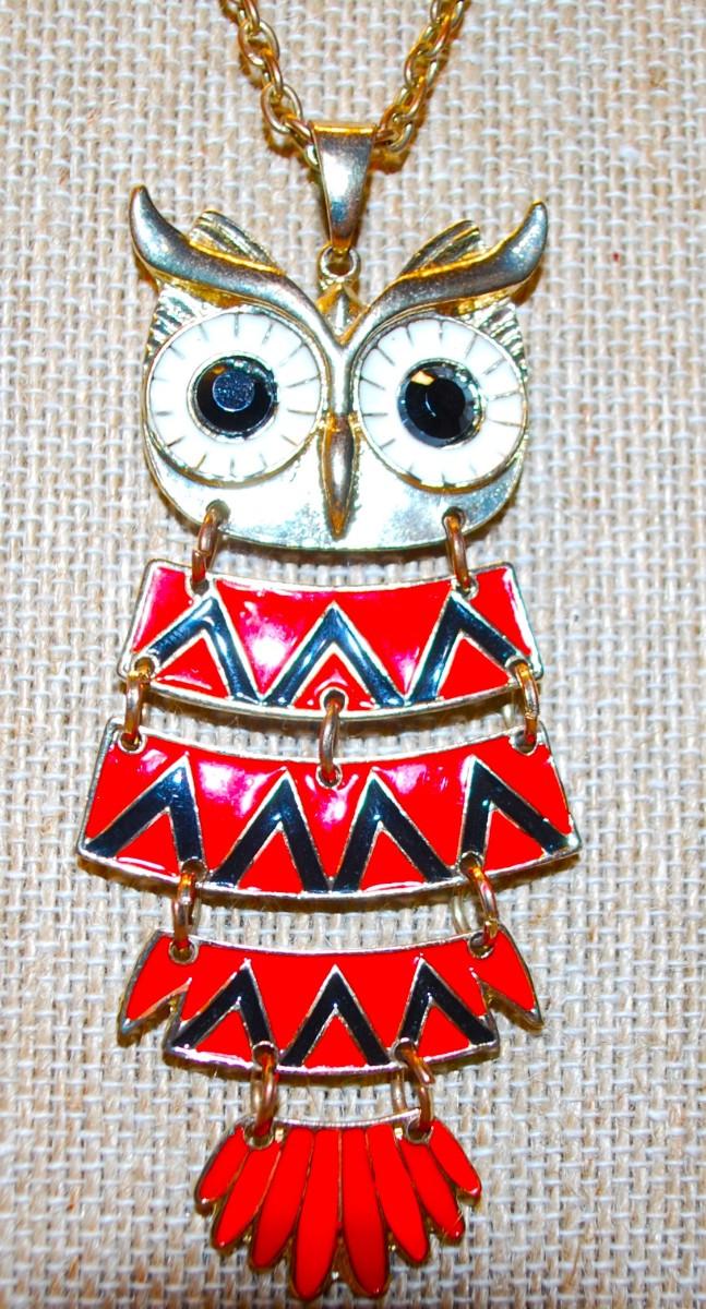 Blue/Black Eyed Owl PENDANT (3¼" x 2¼") in 5 Moveable Red/Black Sections on a Gold Tone Necklace Chain 28" L