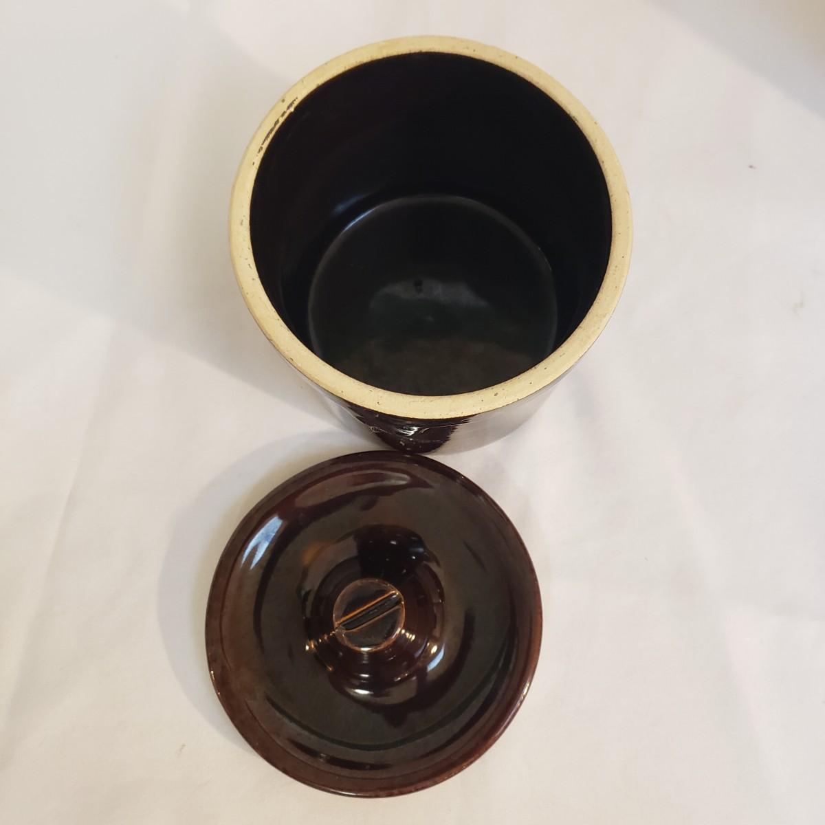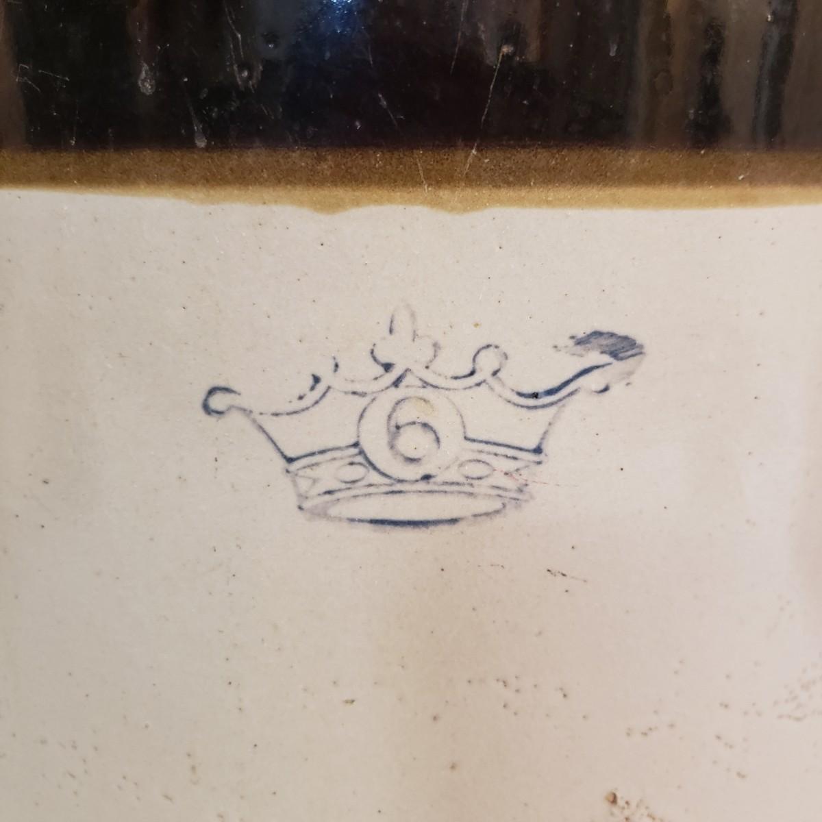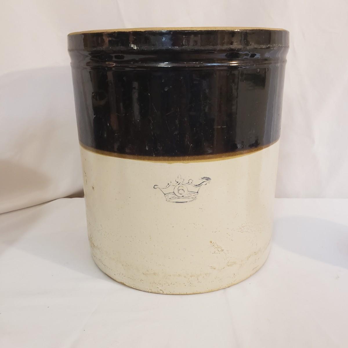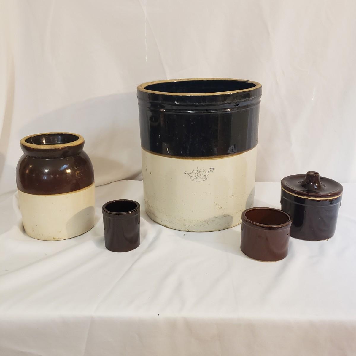 This stoneware crock lot contains five pieces. The largest crock is stamped with a blue '6' crown and appears to be from Ransbottom. It measures approximately 13" x 14"H. The crock is quite heavy. There is a crack towards the bottom, yet still feels solid. See pictures for details. The next three crocks are covered in a brown glaze and appear to have had a metal lock down feature at one point due to the holes on each side. The last crock measures approximately 6" x 10"H.