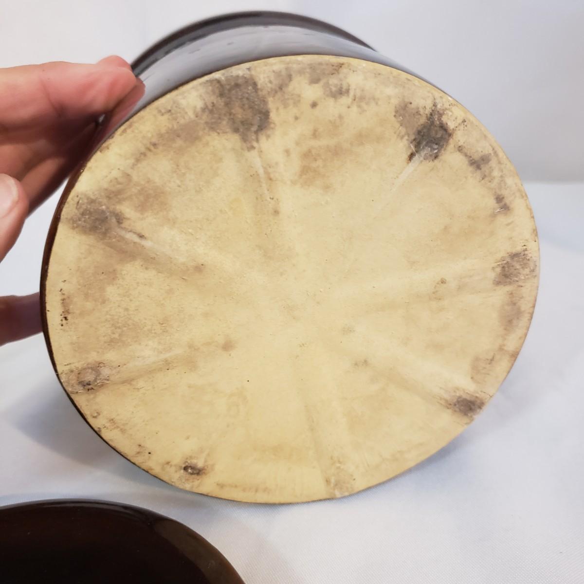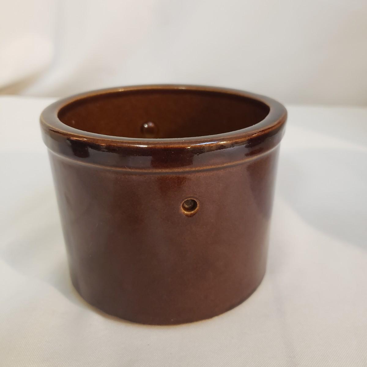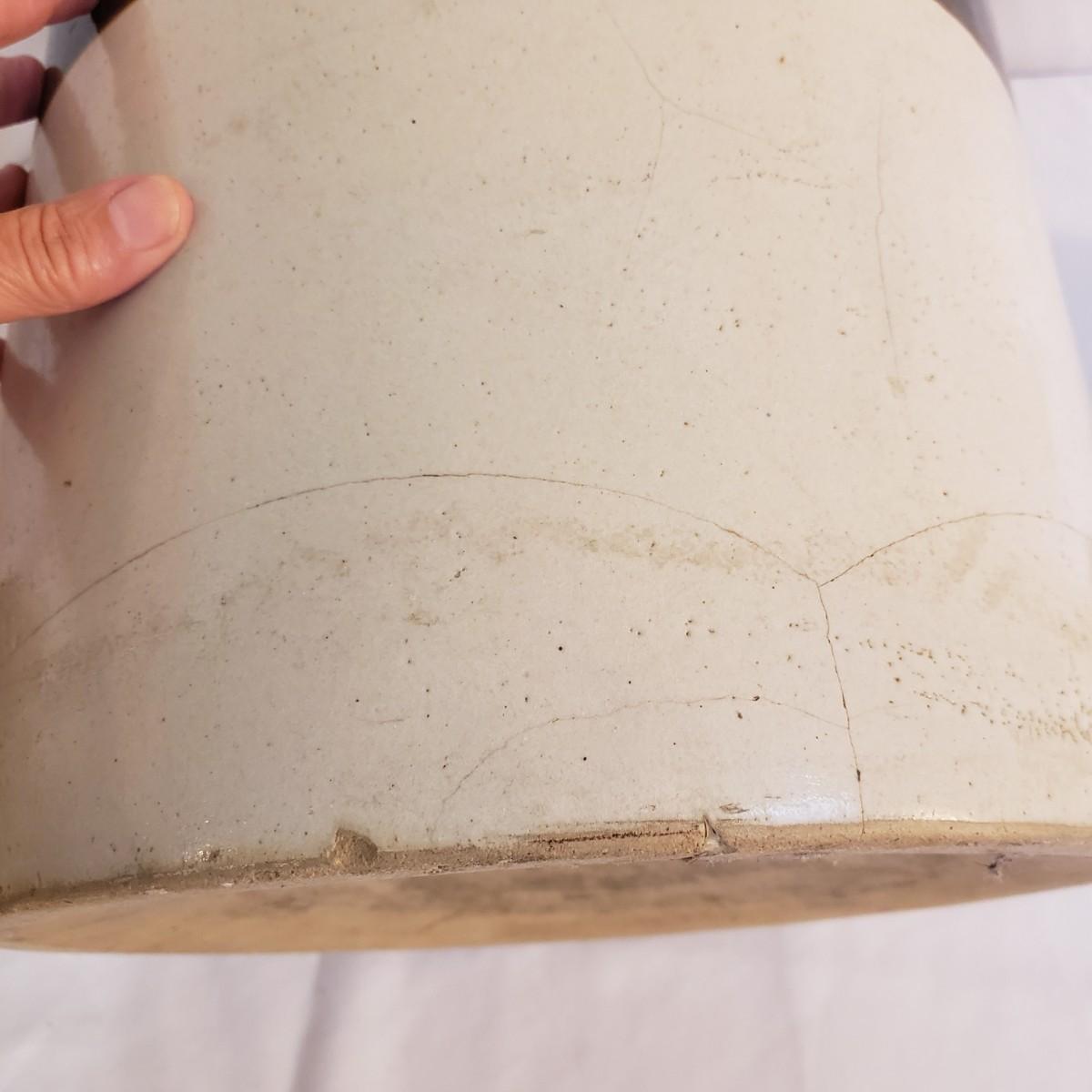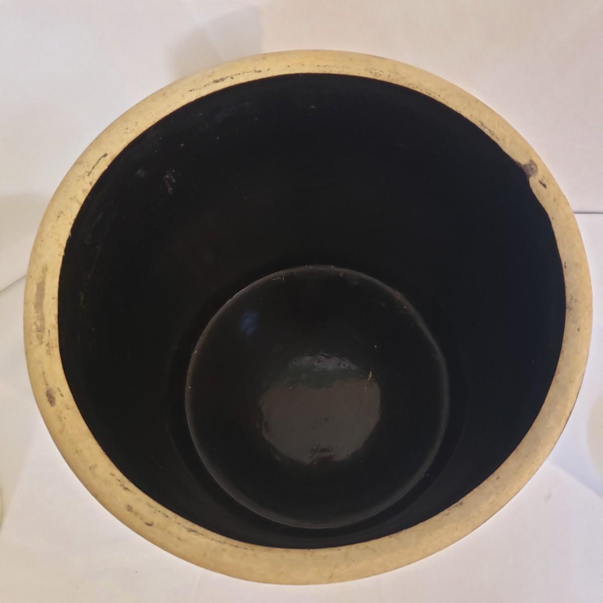 This stoneware crock lot contains five pieces. The largest crock is stamped with a blue '6' crown and appears to be from Ransbottom. It measures approximately 13" x 14"H. The crock is quite heavy. There is a crack towards the bottom, yet still feels solid. See pictures for details. The next three crocks are covered in a brown glaze and appear to have had a metal lock down feature at one point due to the holes on each side. The last crock measures approximately 6" x 10"H.