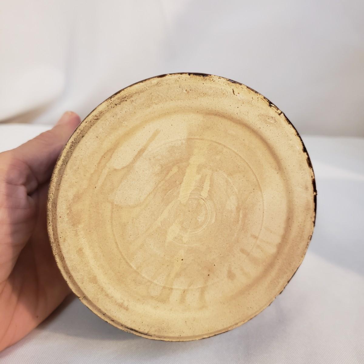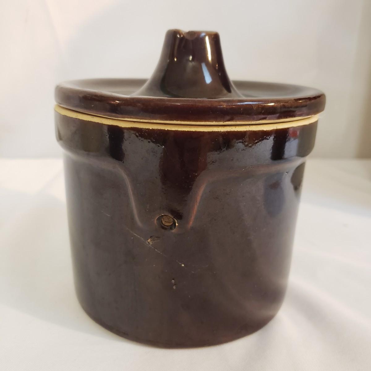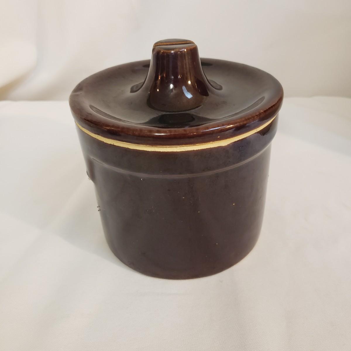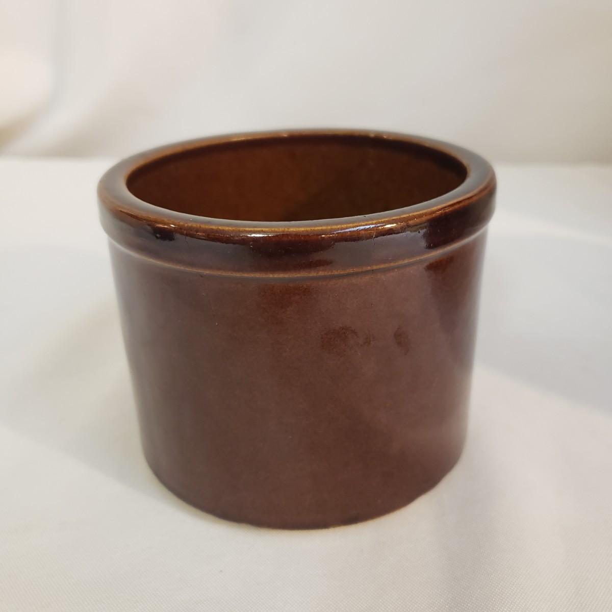 This stoneware crock lot contains five pieces. The largest crock is stamped with a blue '6' crown and appears to be from Ransbottom. It measures approximately 13" x 14"H. The crock is quite heavy. There is a crack towards the bottom, yet still feels solid. See pictures for details. The next three crocks are covered in a brown glaze and appear to have had a metal lock down feature at one point due to the holes on each side. The last crock measures approximately 6" x 10"H.