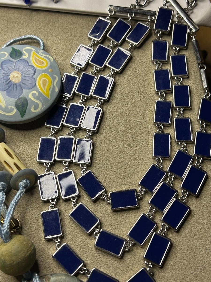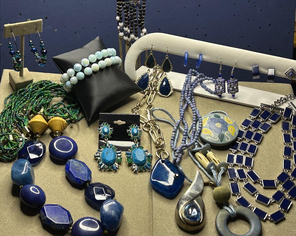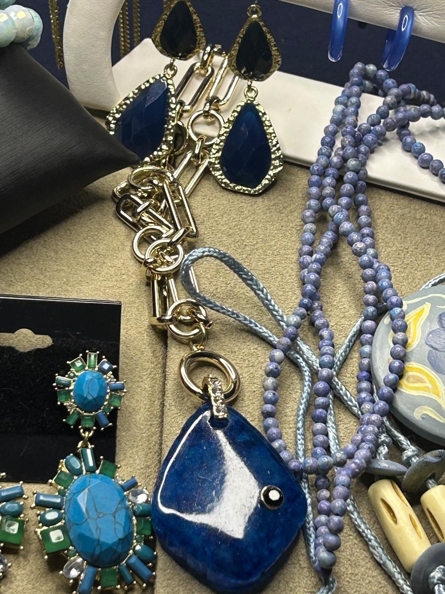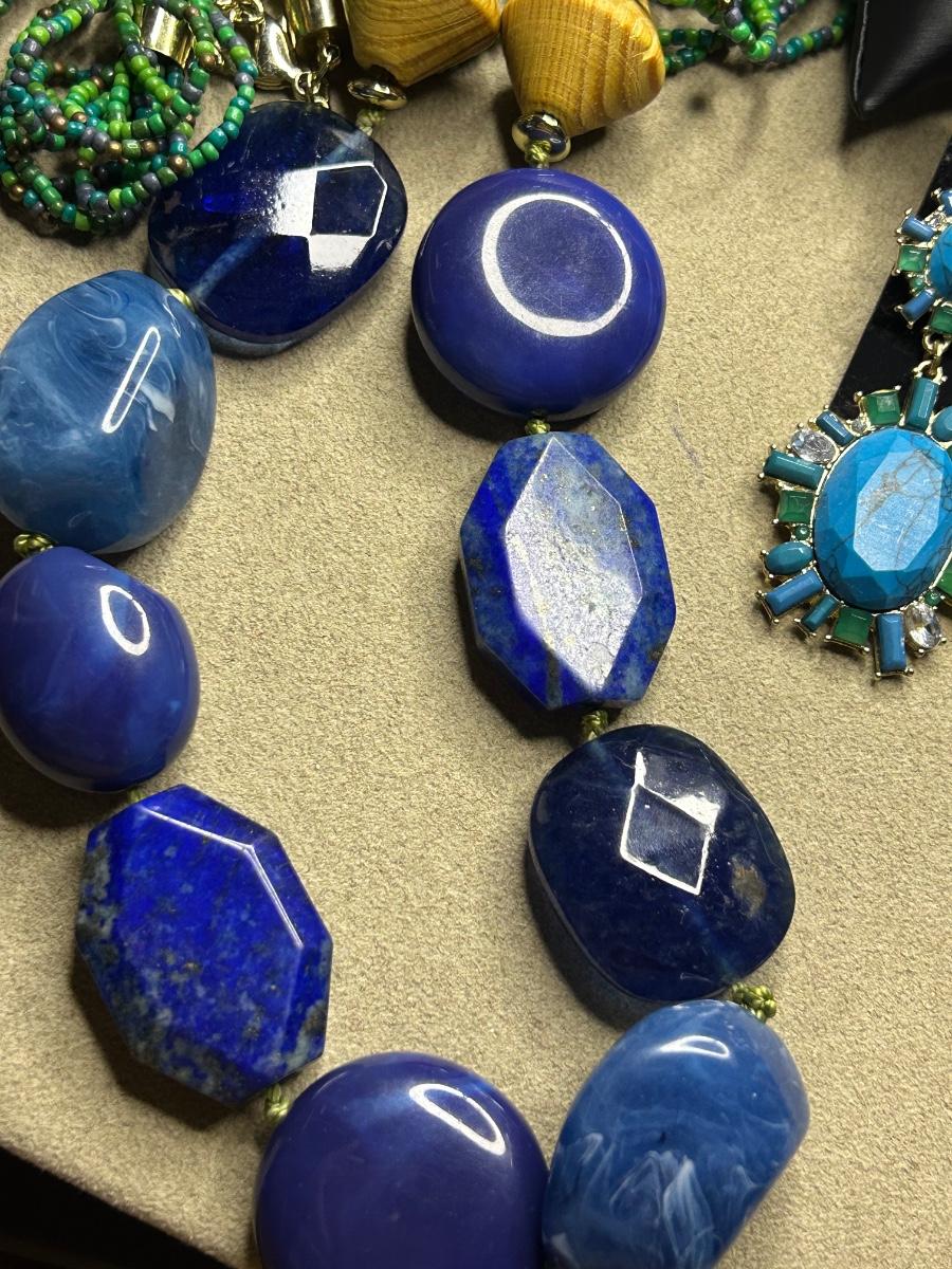 This is a full lot! Some vintage, some wood, some beads, metal & stone!! The big blue stone necklace is White House black market. The green & blue necklace has 2 big lapis stones & is Chicos. The little navy blue earrings are Trifari & clip ons. A couple stretch bracelets, 2 brooches etc. There’s some high dollar pieces to take advantage of!!