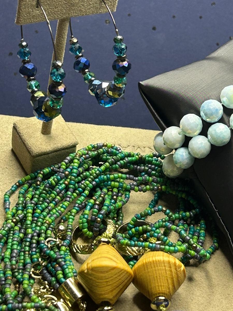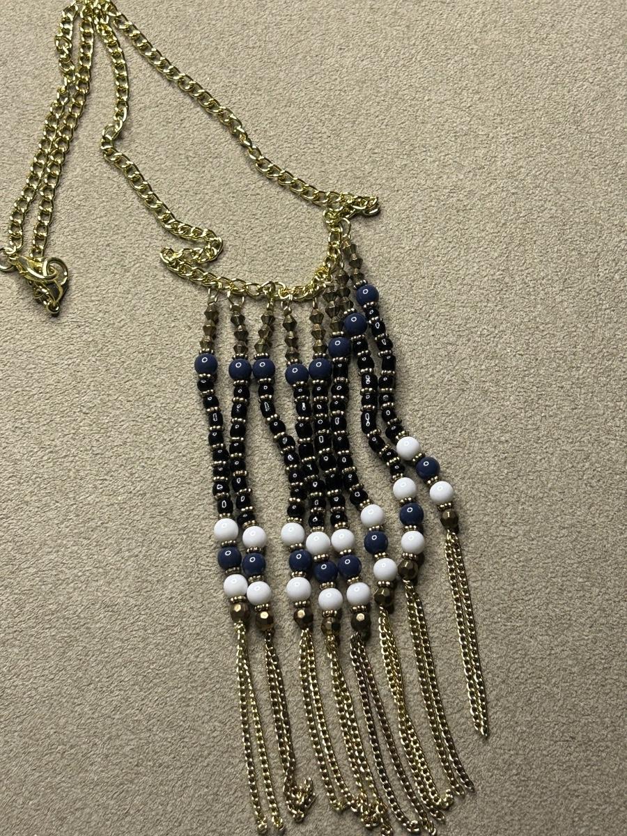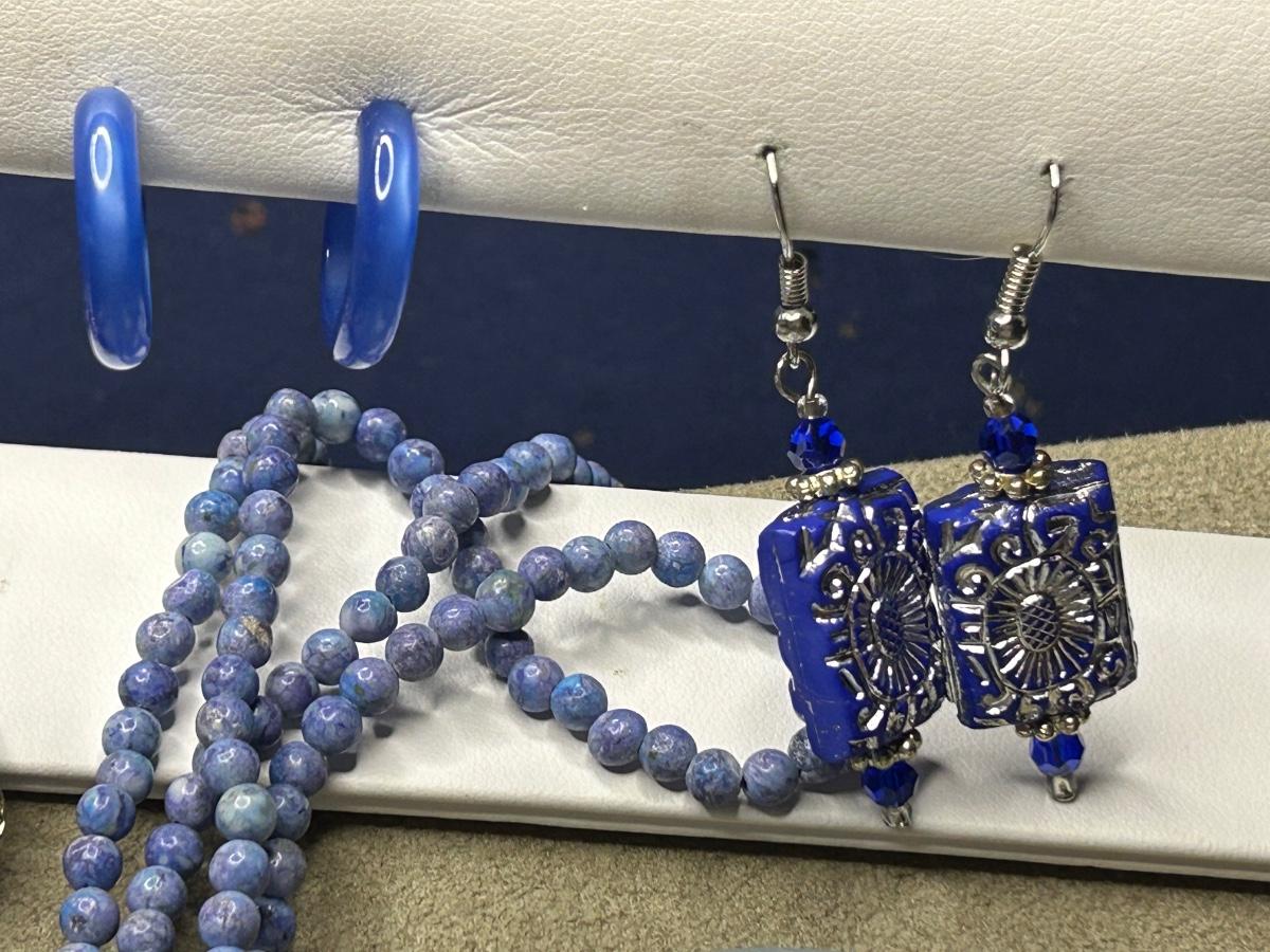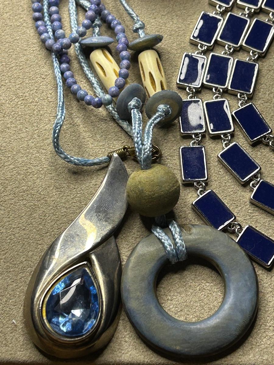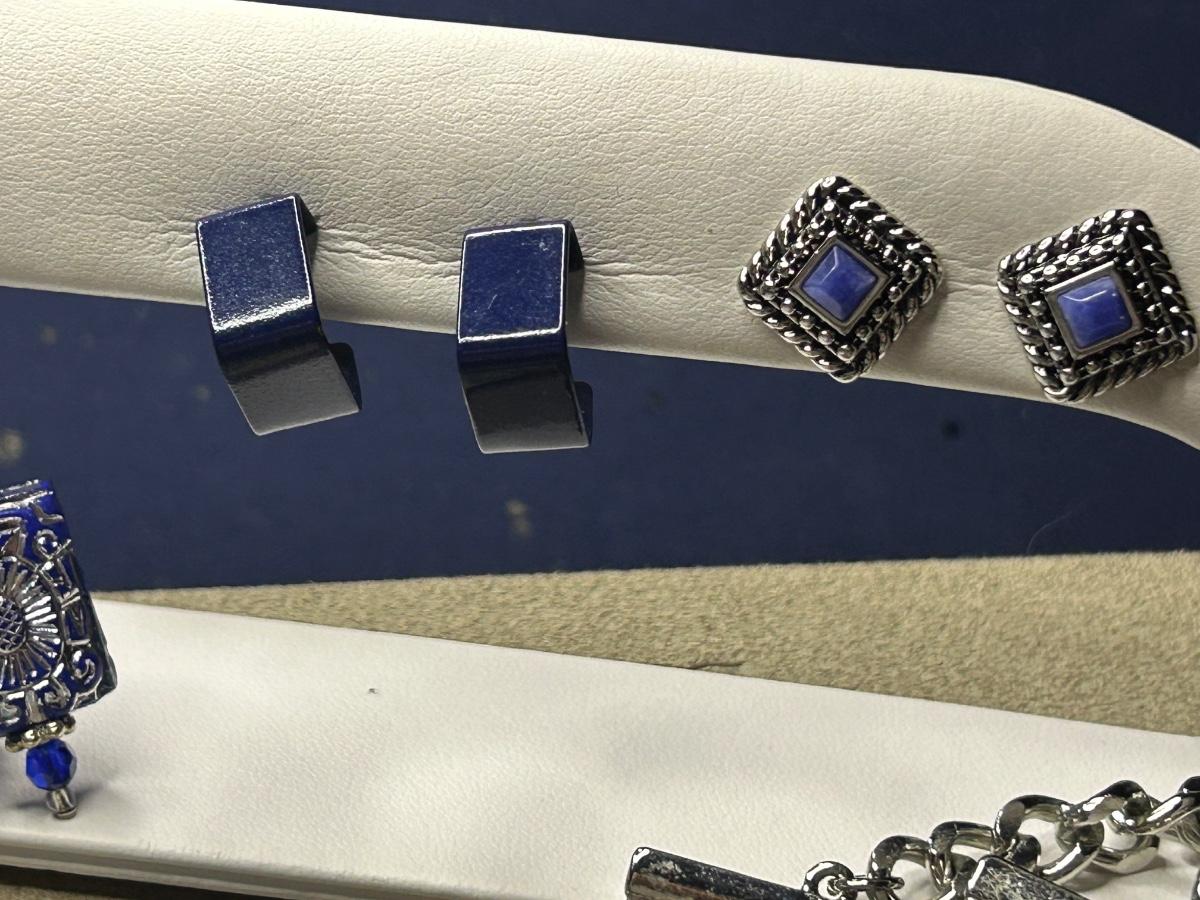 This is a full lot! Some vintage, some wood, some beads, metal & stone!! The big blue stone necklace is White House black market. The green & blue necklace has 2 big lapis stones & is Chicos. The little navy blue earrings are Trifari & clip ons. A couple stretch bracelets, 2 brooches etc. There’s some high dollar pieces to take advantage of!!
