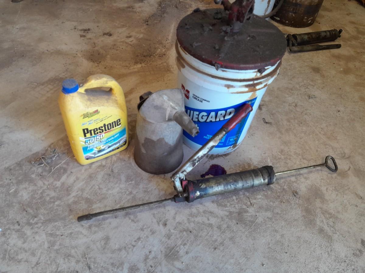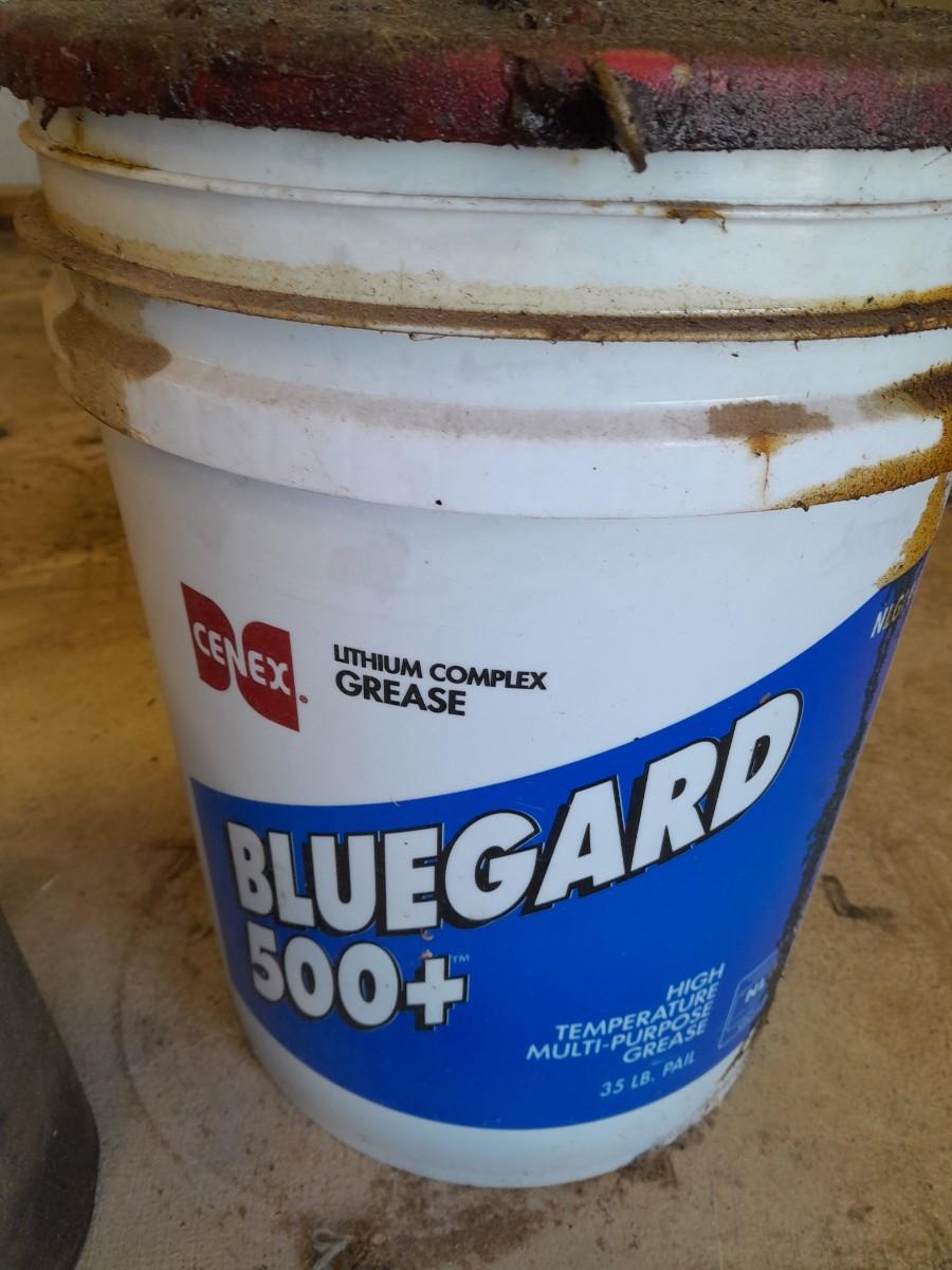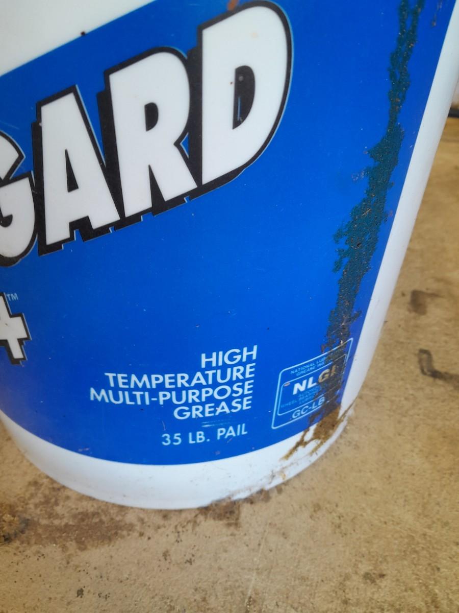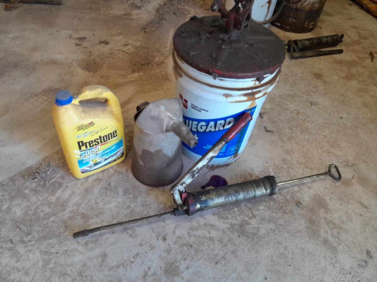5 GALLON BUCKET OF BLUEGARD LITHIUM COMPLEX GREASE PARTIALLY FULL, GREASE GUN, GALVENIZED METAL CAN, AND PRESTONE 50/50 ANTIFREEZE