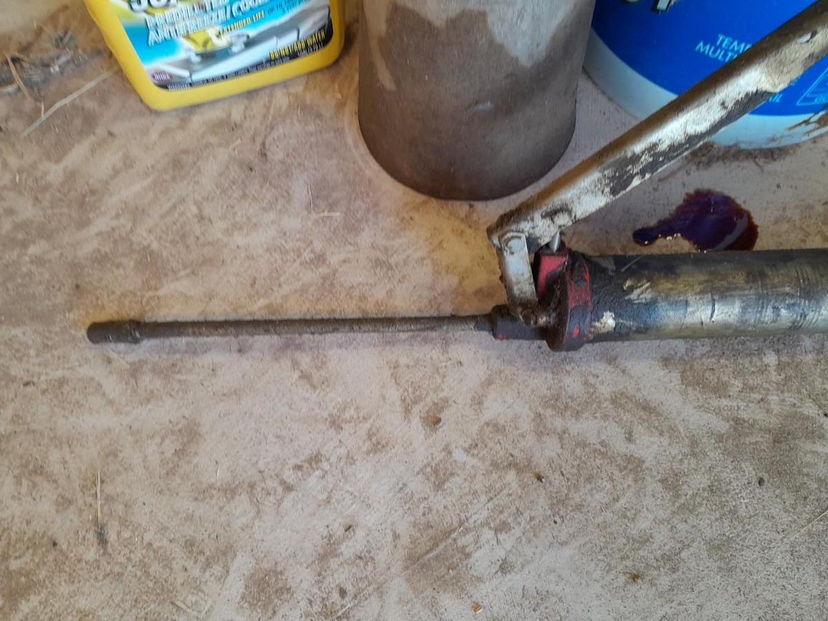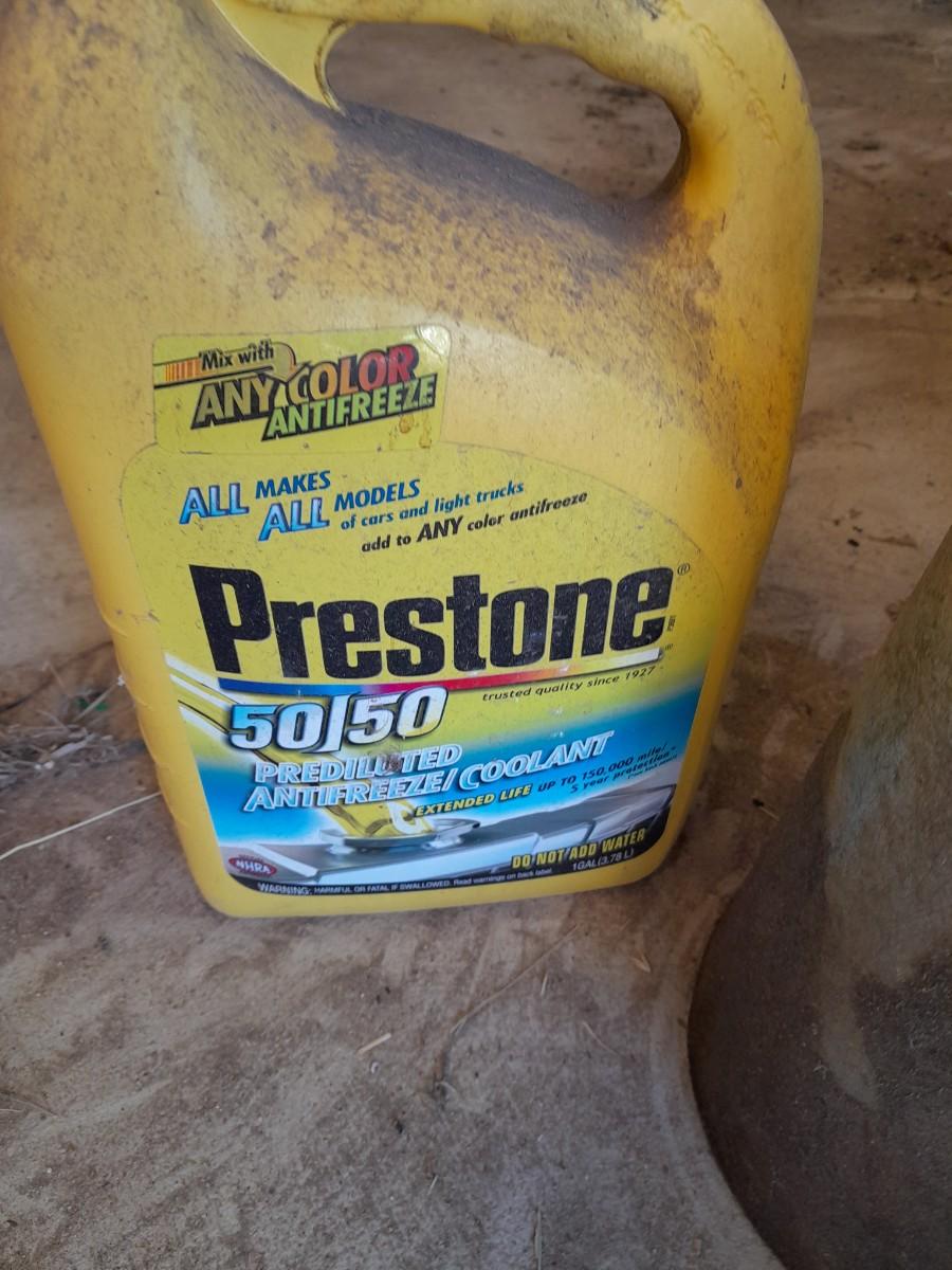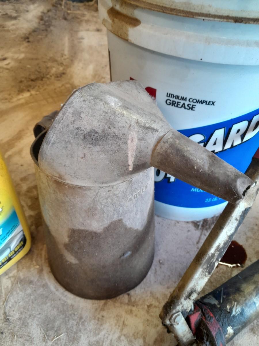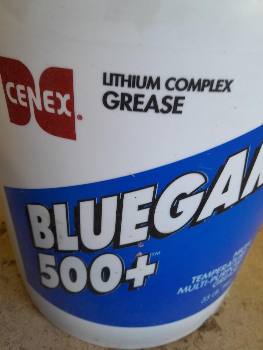 5 GALLON BUCKET OF BLUEGARD LITHIUM COMPLEX GREASE PARTIALLY FULL, GREASE GUN, GALVENIZED METAL CAN, AND PRESTONE 50/50 ANTIFREEZE