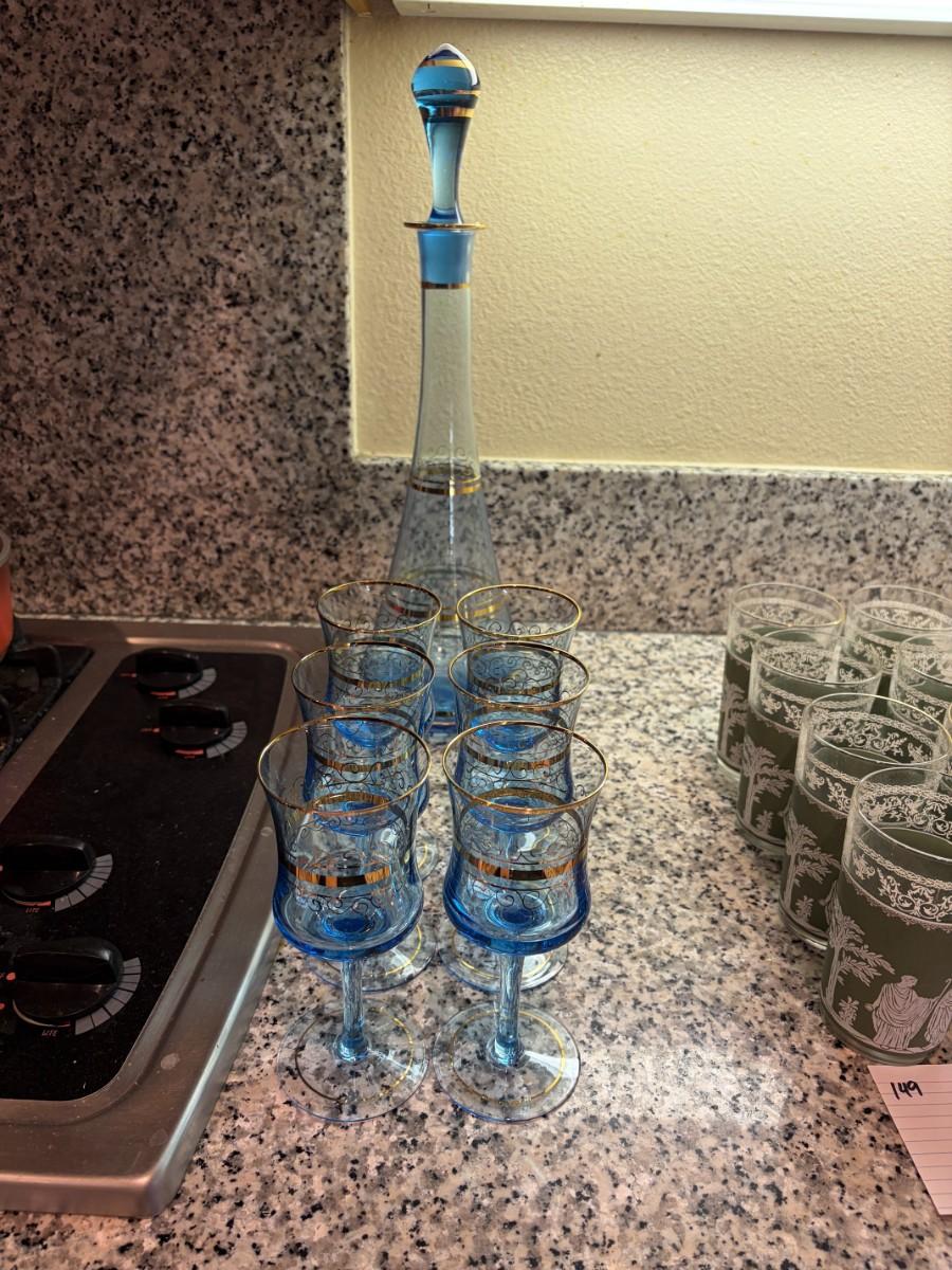 Blue/gold decanter with 6 glasses