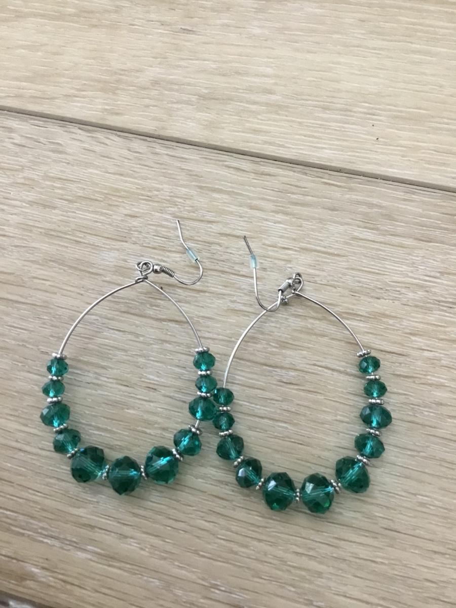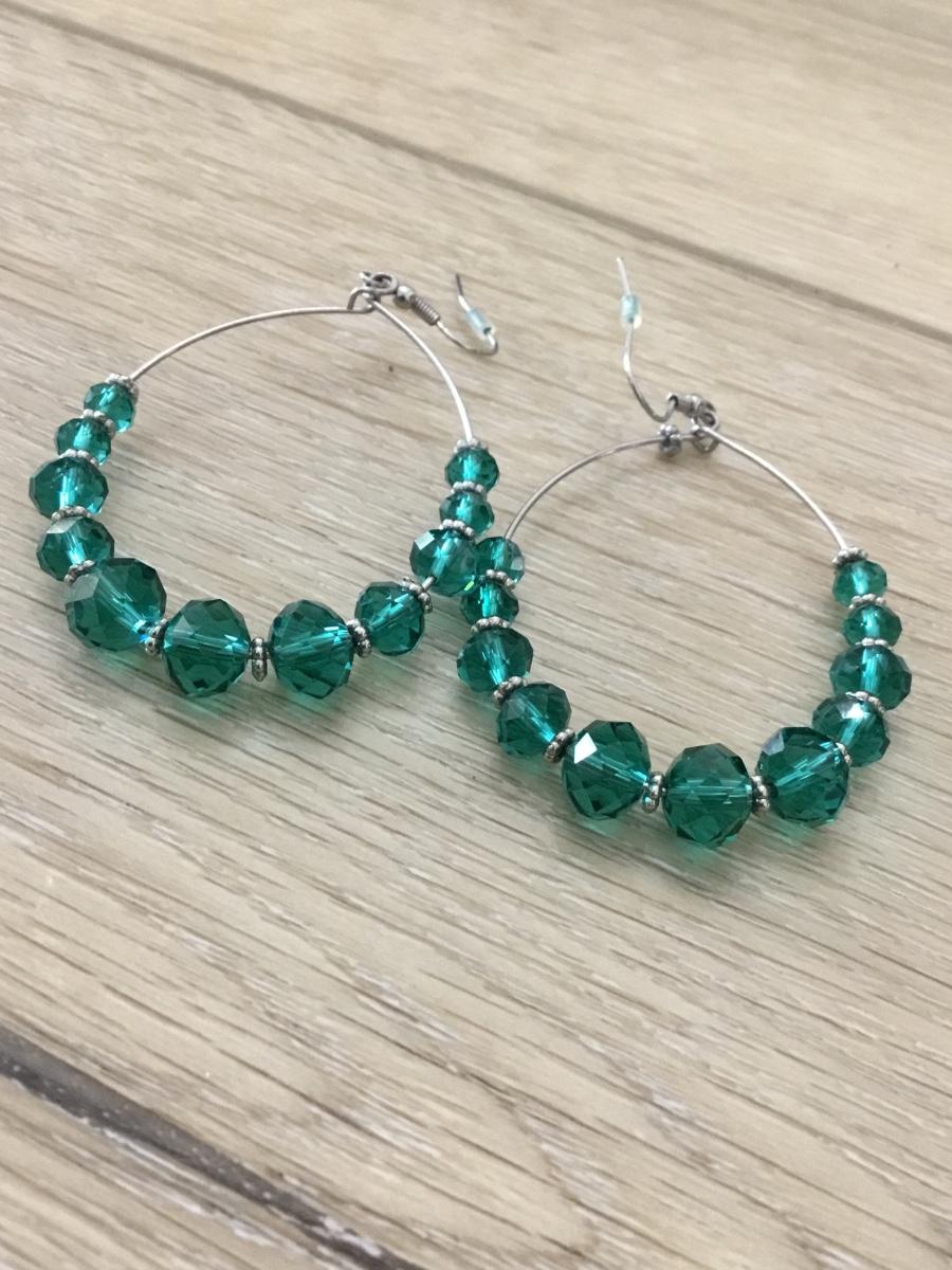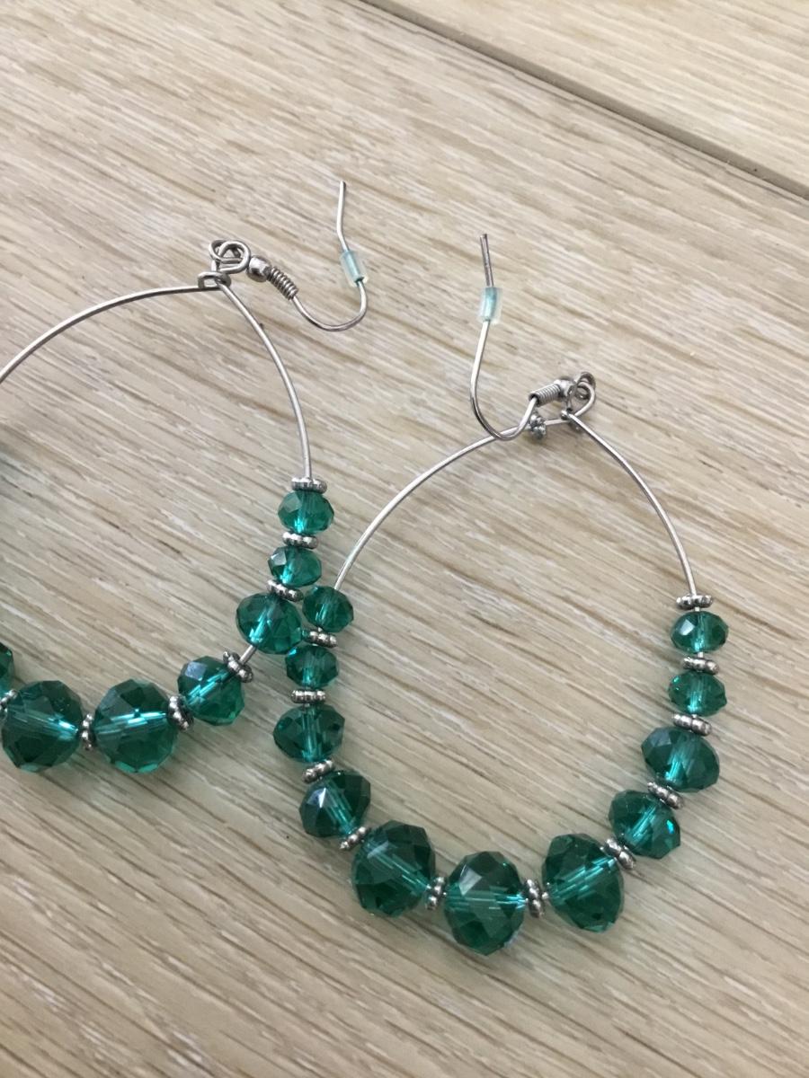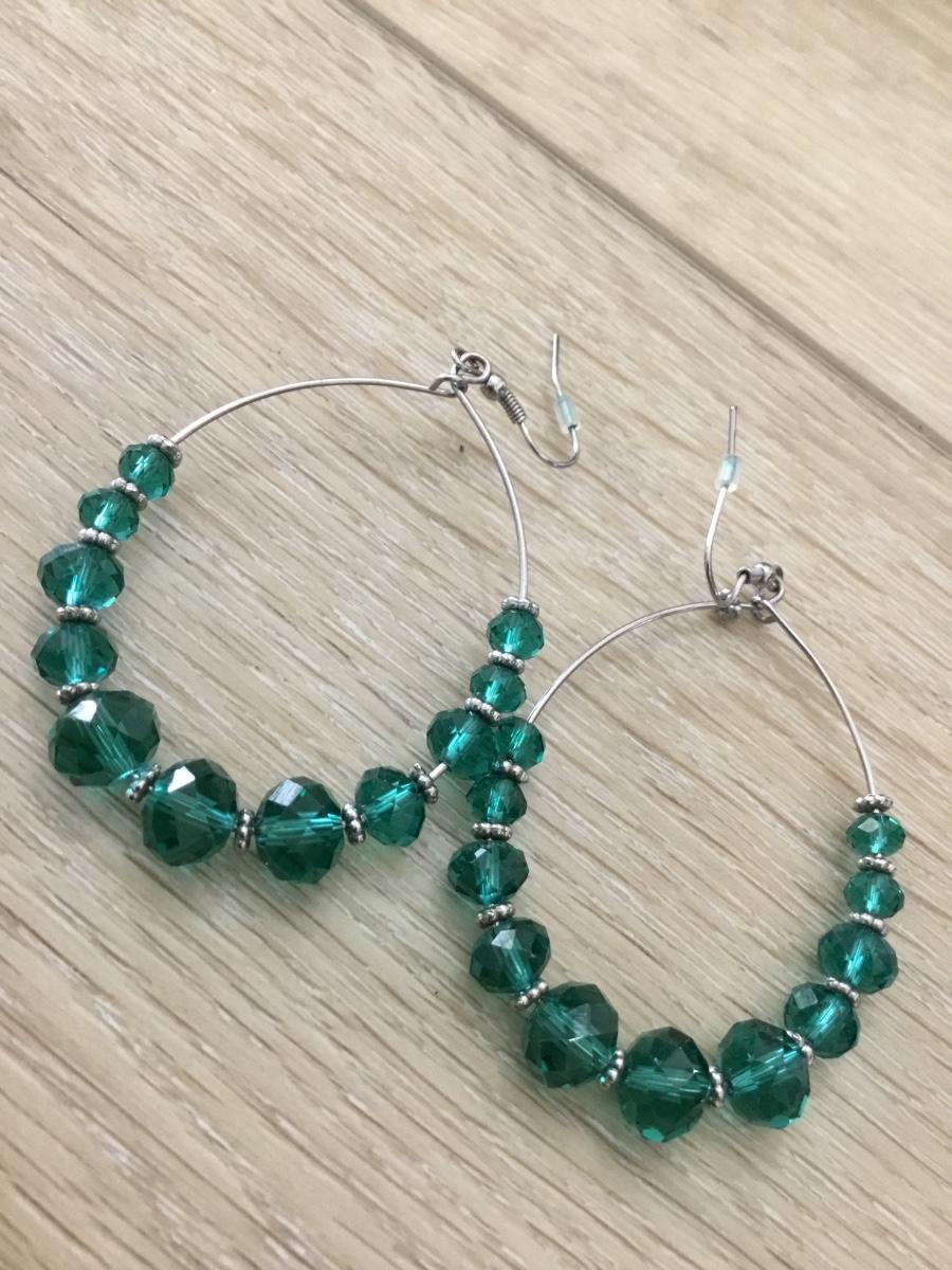 Blue/green beaded silver tone loop earrings