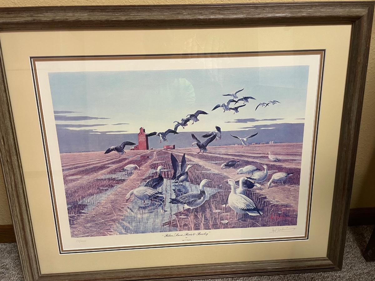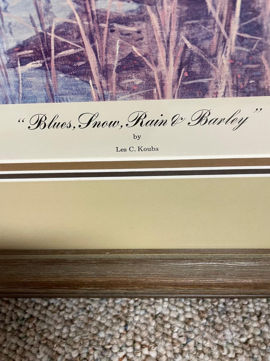 Blues, snow, rain and barley print with frame by Les C Kouba. Dimensions 35”x28 1/2”