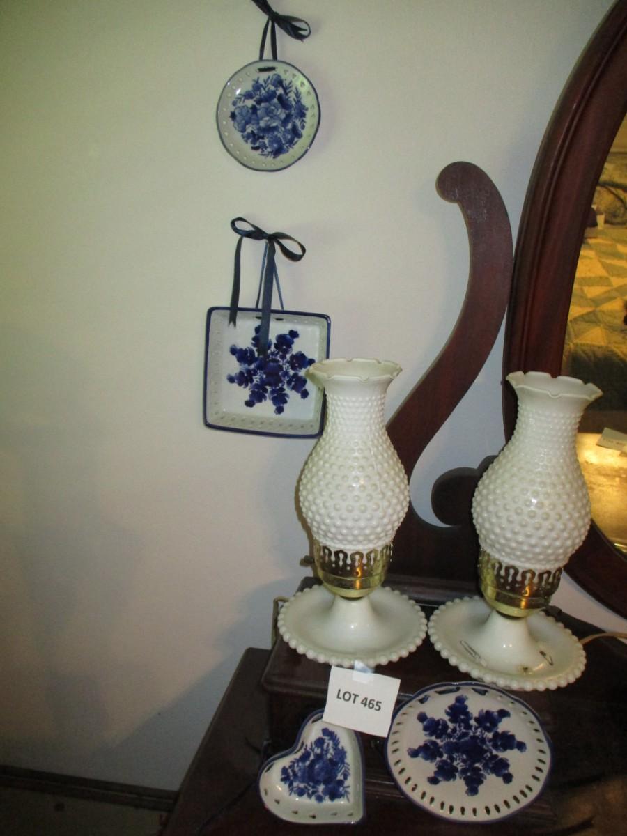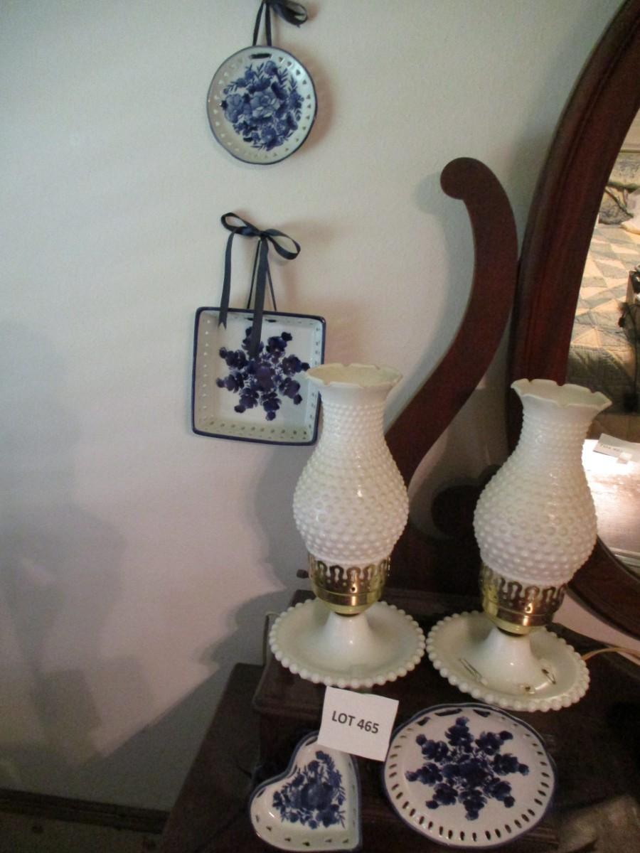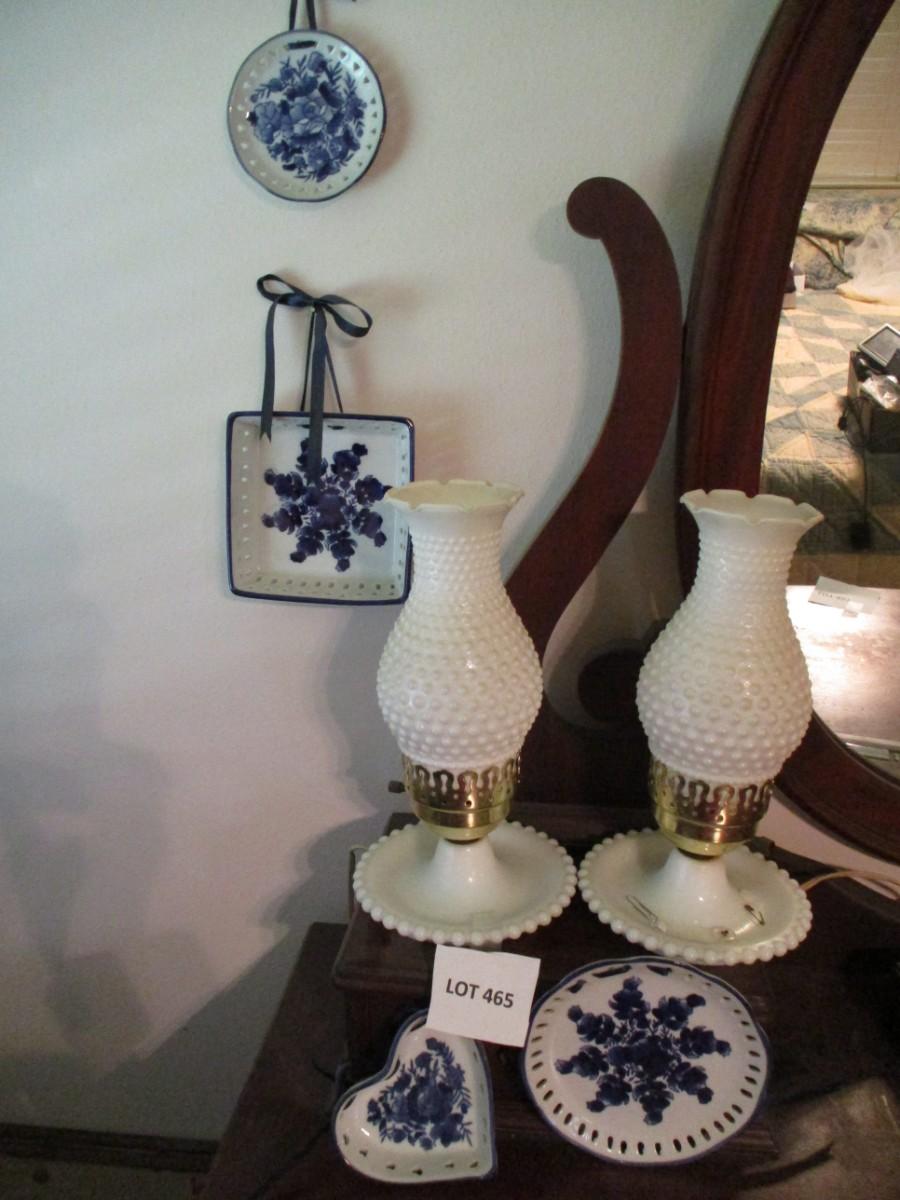 2 Hobnail Lantern Style Lamps. Wall plates blue & white