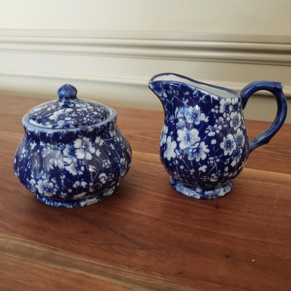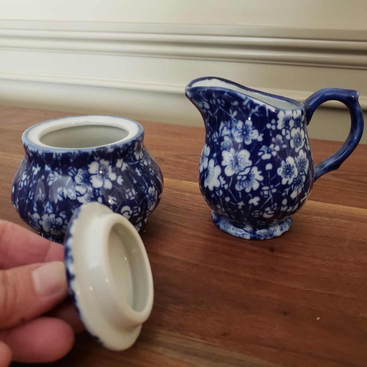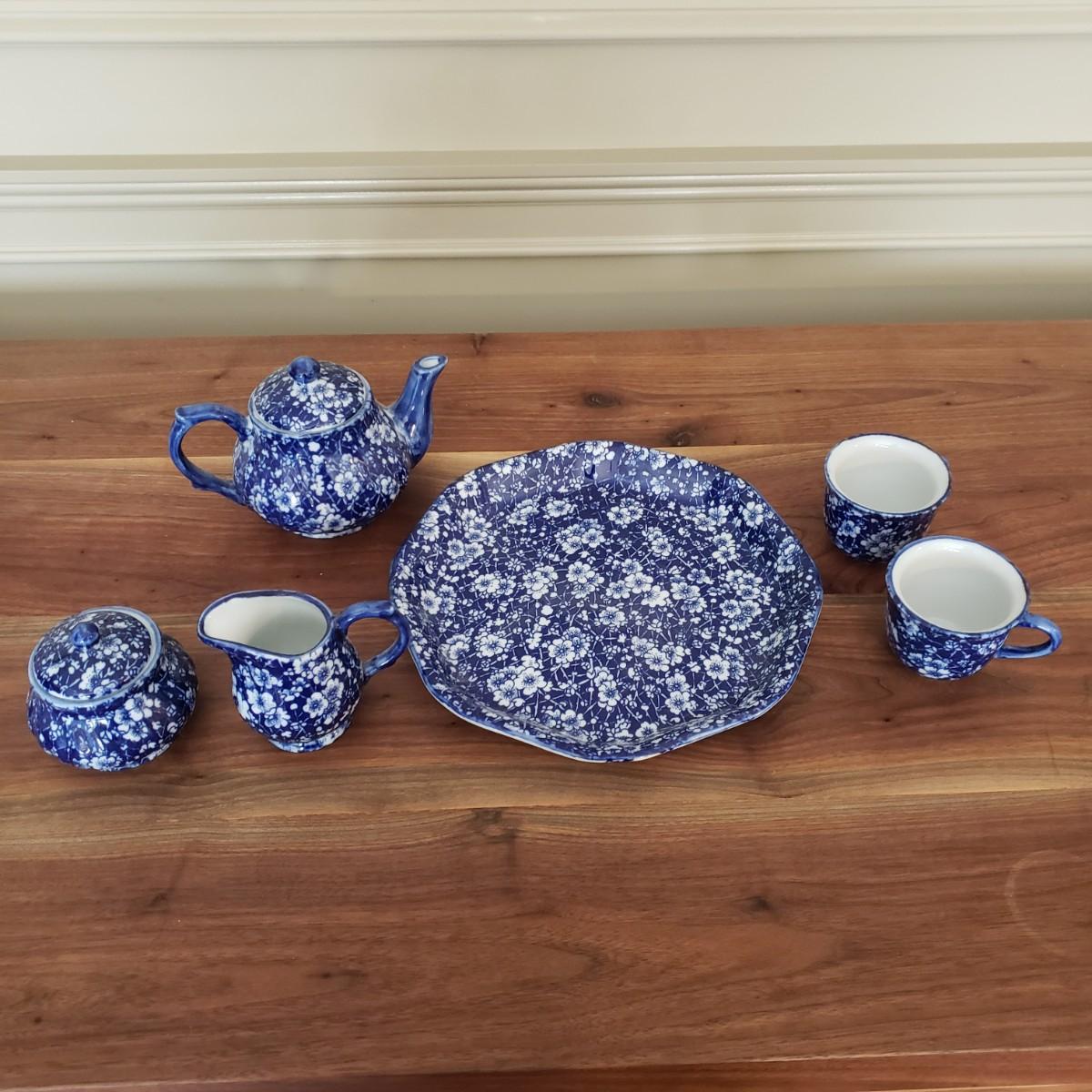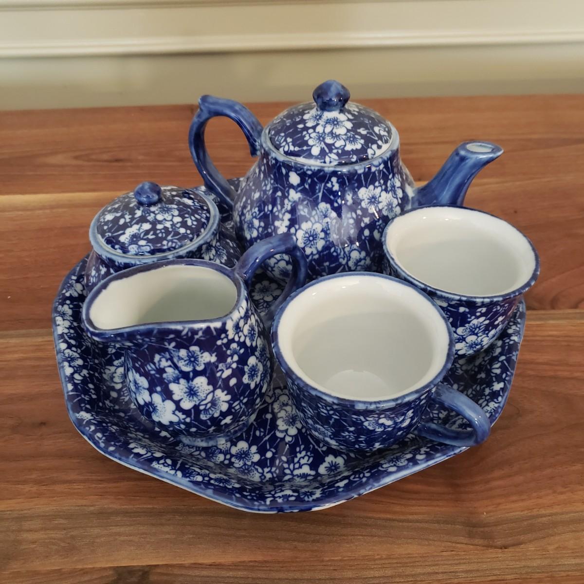 This blue and white floral tea set is perfect for tea for two! It comes with a serving tray that measures 10"D. This ceramic set is solid and sturdy. The set appears to not have any blemishes.