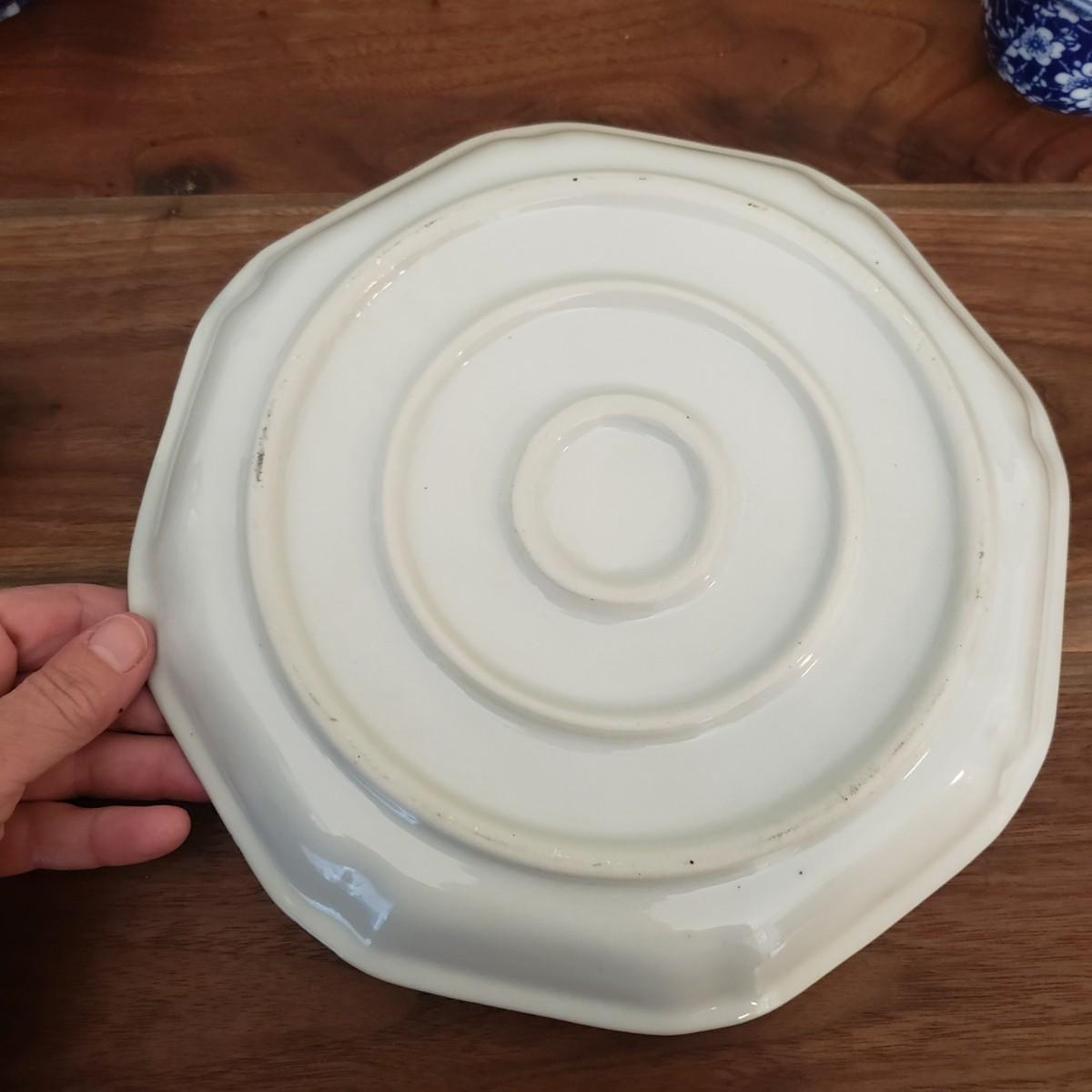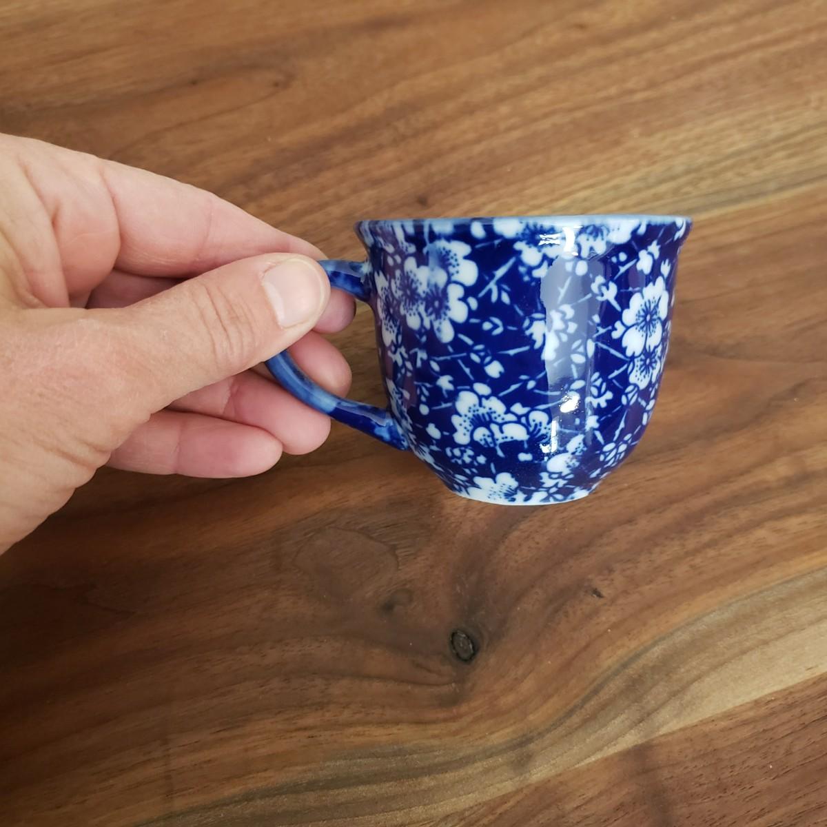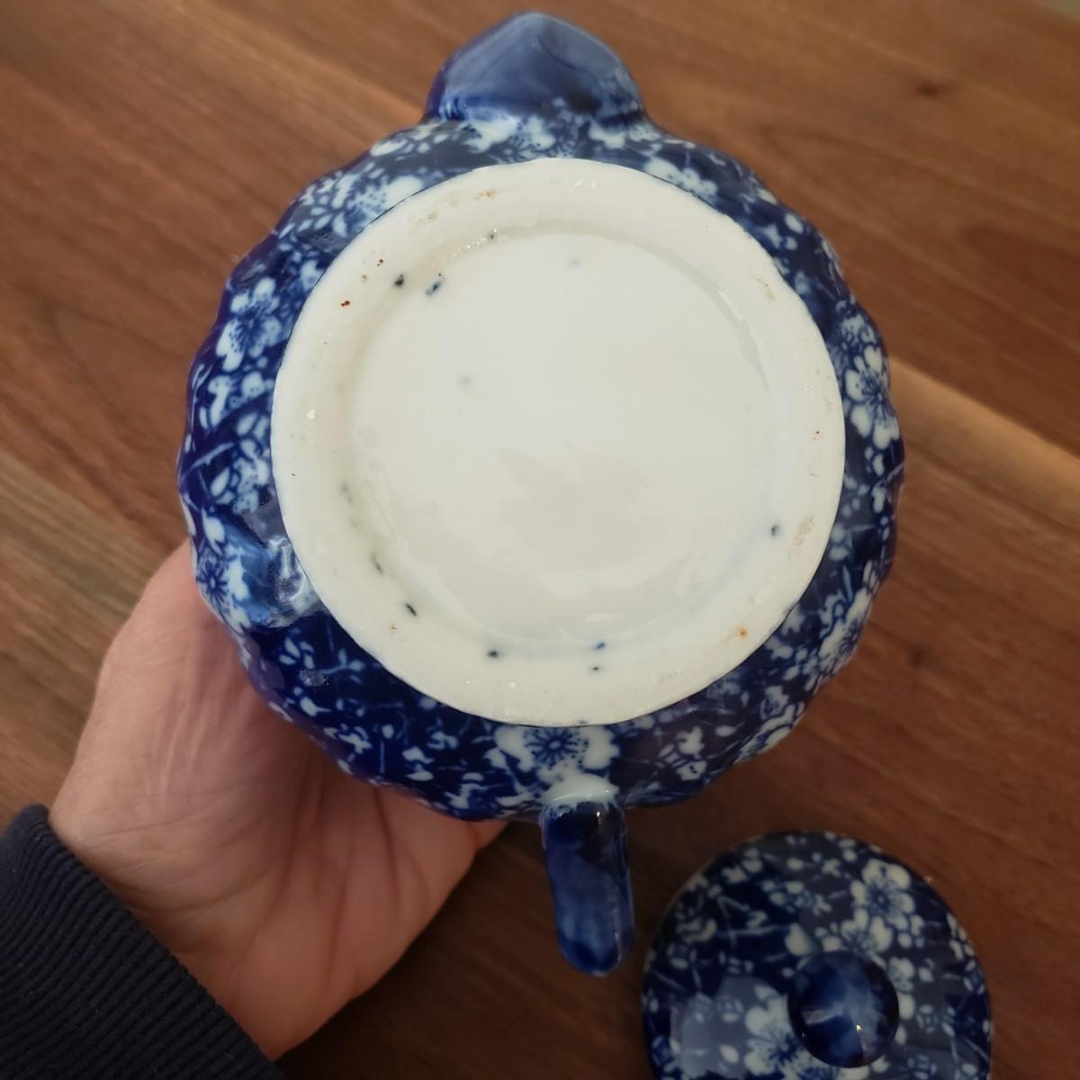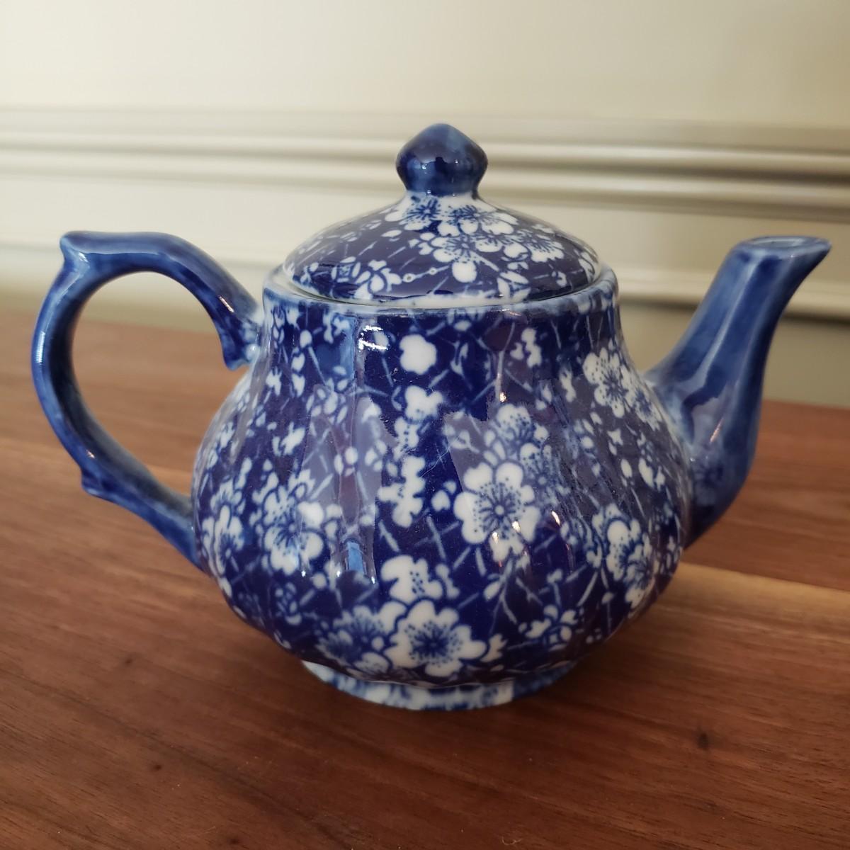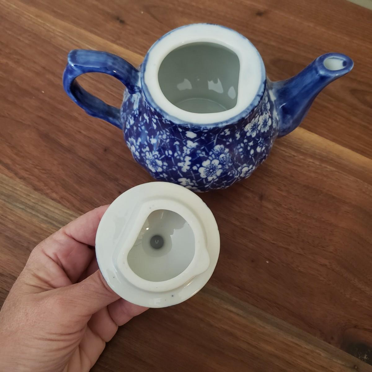 This blue and white floral tea set is perfect for tea for two! It comes with a serving tray that measures 10"D. This ceramic set is solid and sturdy. The set appears to not have any blemishes.