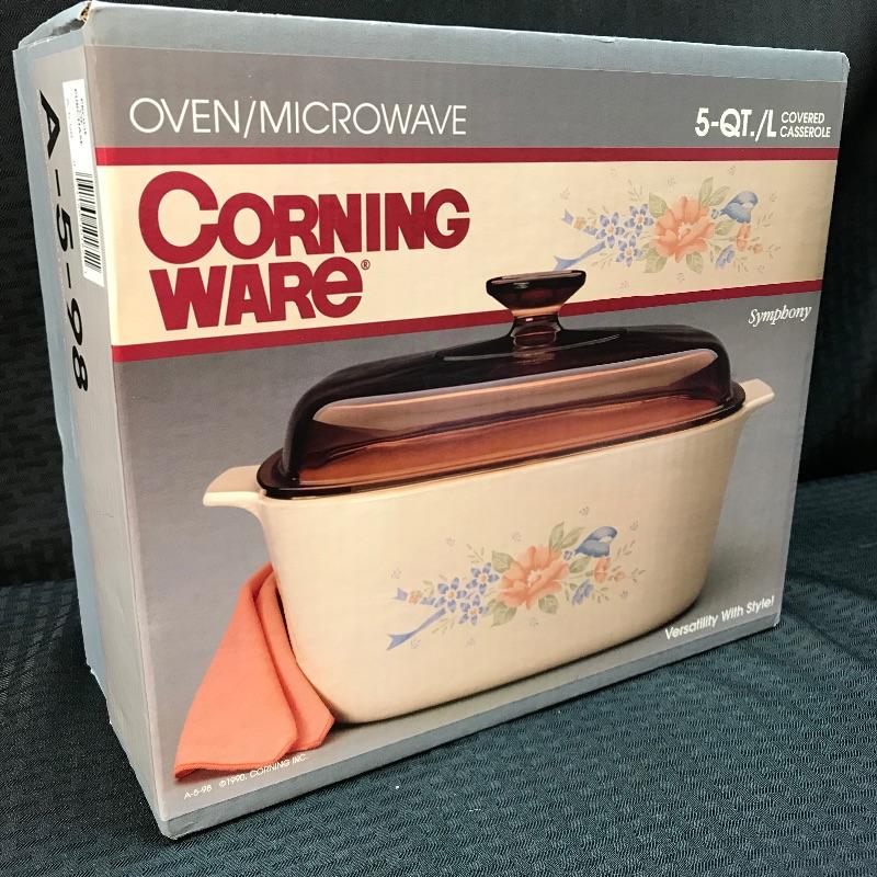 Still brand new, and sealed in its original box is it CorningWare Symphony 5 quart Dutch oven with glass amber lid. The symphony line has long been discontinued and it’s extremely rare to find these additions especially one in its original box! Bidding starts at $40, don’t miss your chance!!!!!