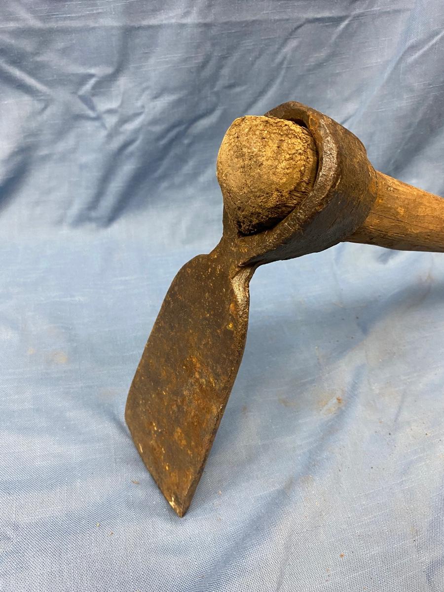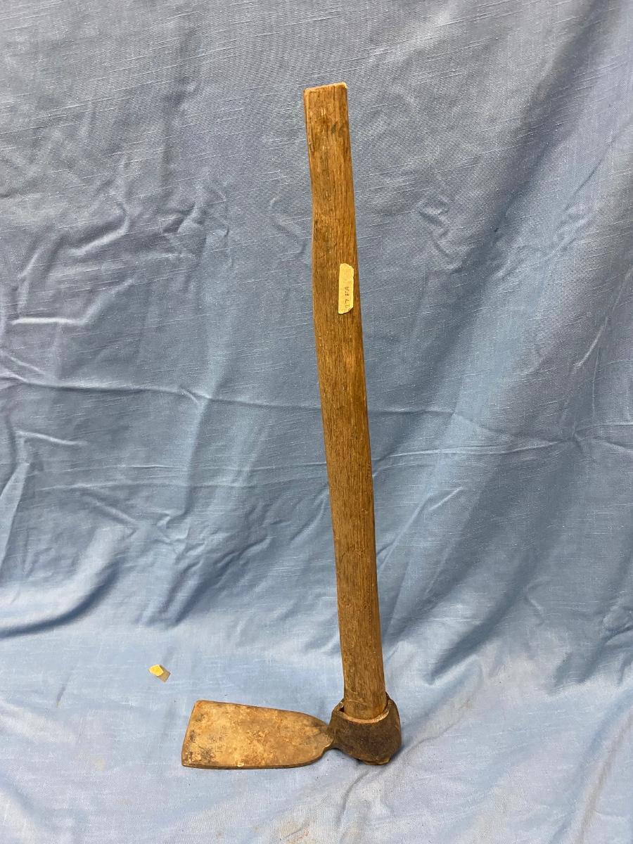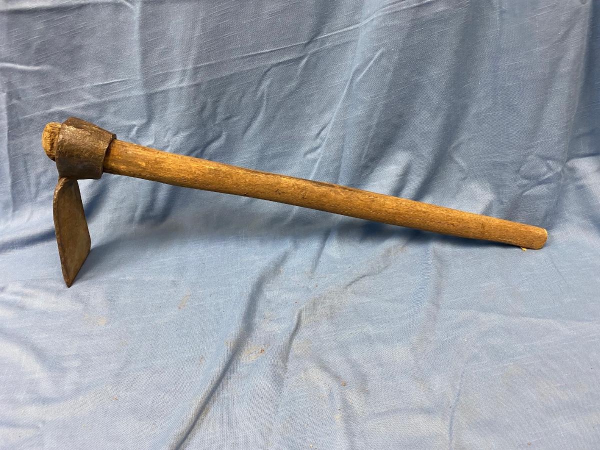 Antique 29" Primitive Grub Hoe Blacksmith Wrought. Narrow blade edge. Displays nice. There is some stamping on the blade but can't make it out.
