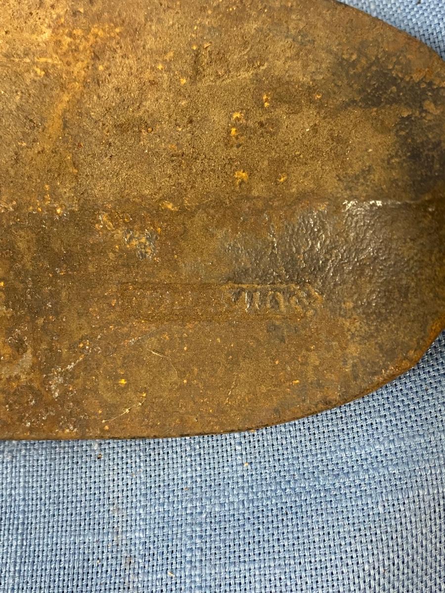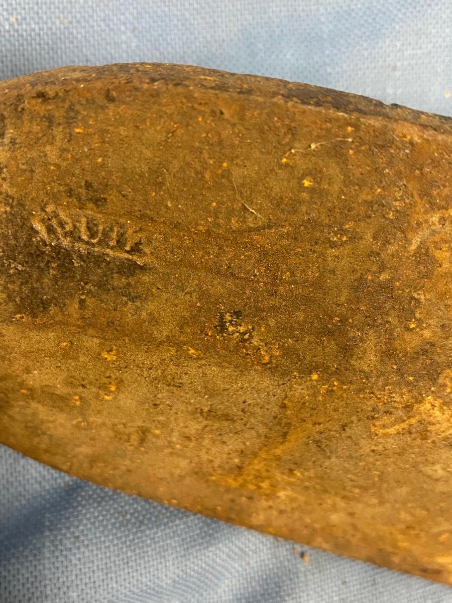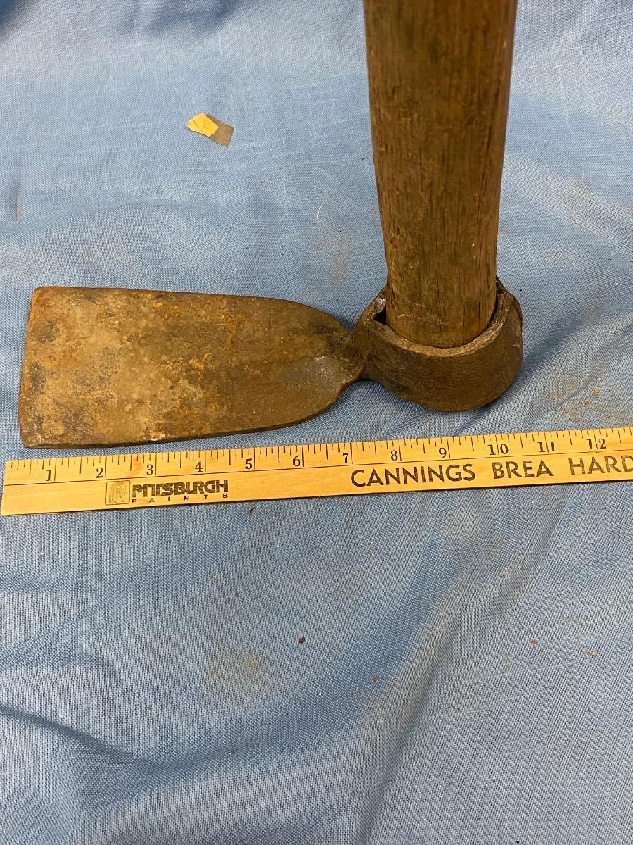 Antique 29" Primitive Grub Hoe Blacksmith Wrought. Narrow blade edge. Displays nice. There is some stamping on the blade but can't make it out.
