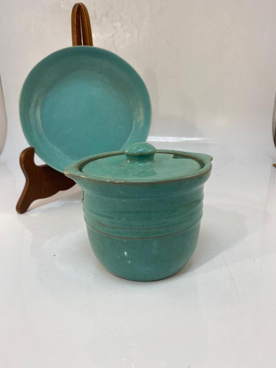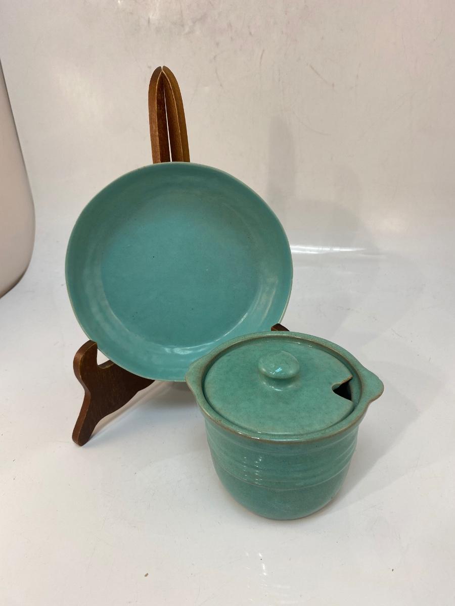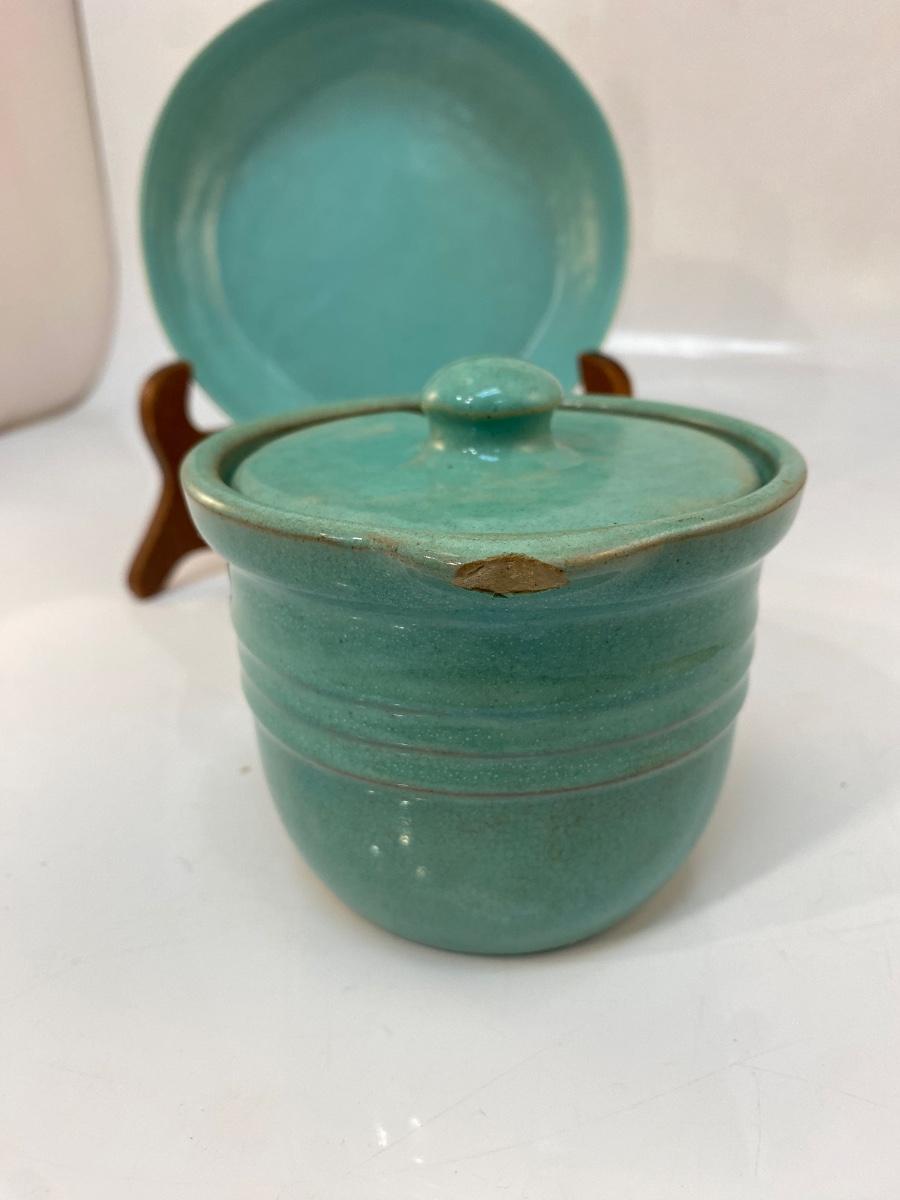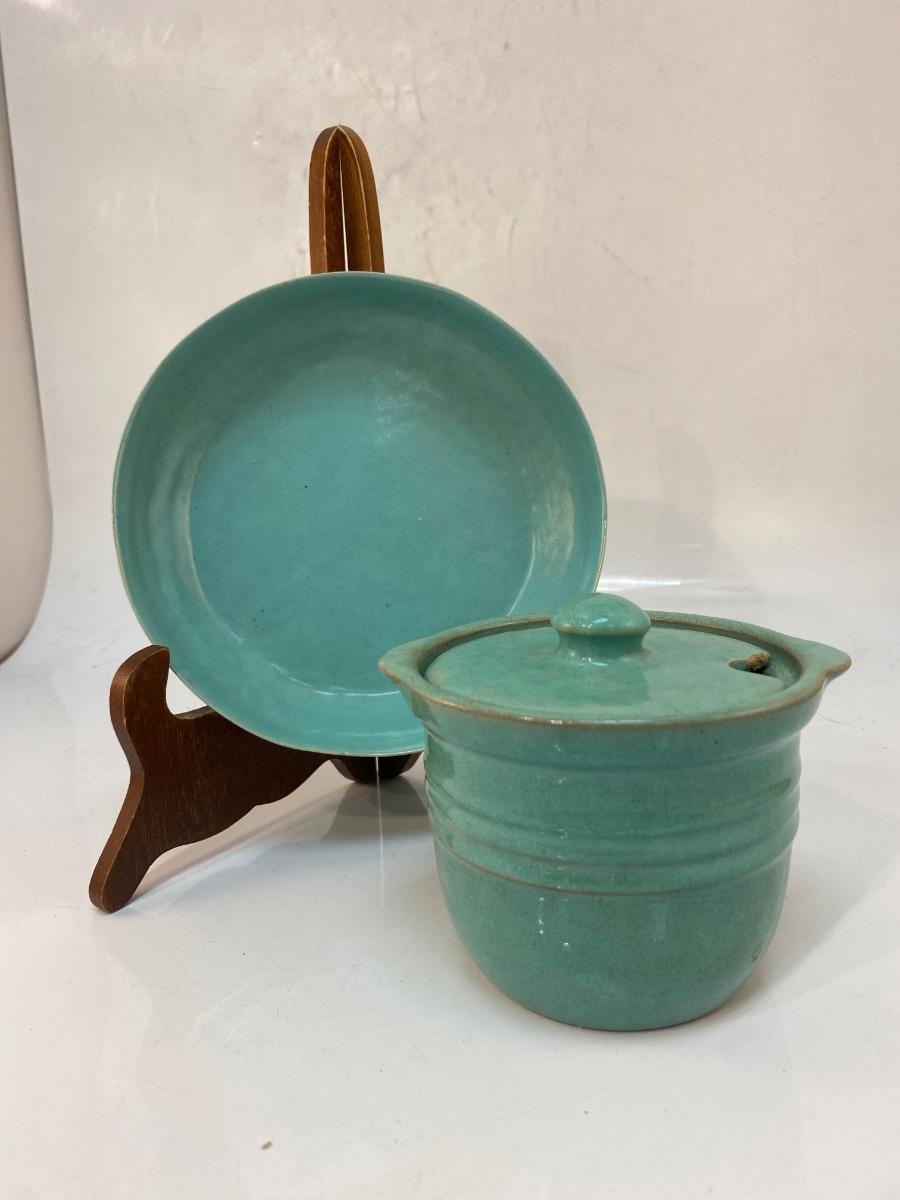 Vintage Turquoise Pottery Crock and Shallow Plate Bowl