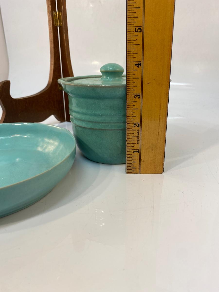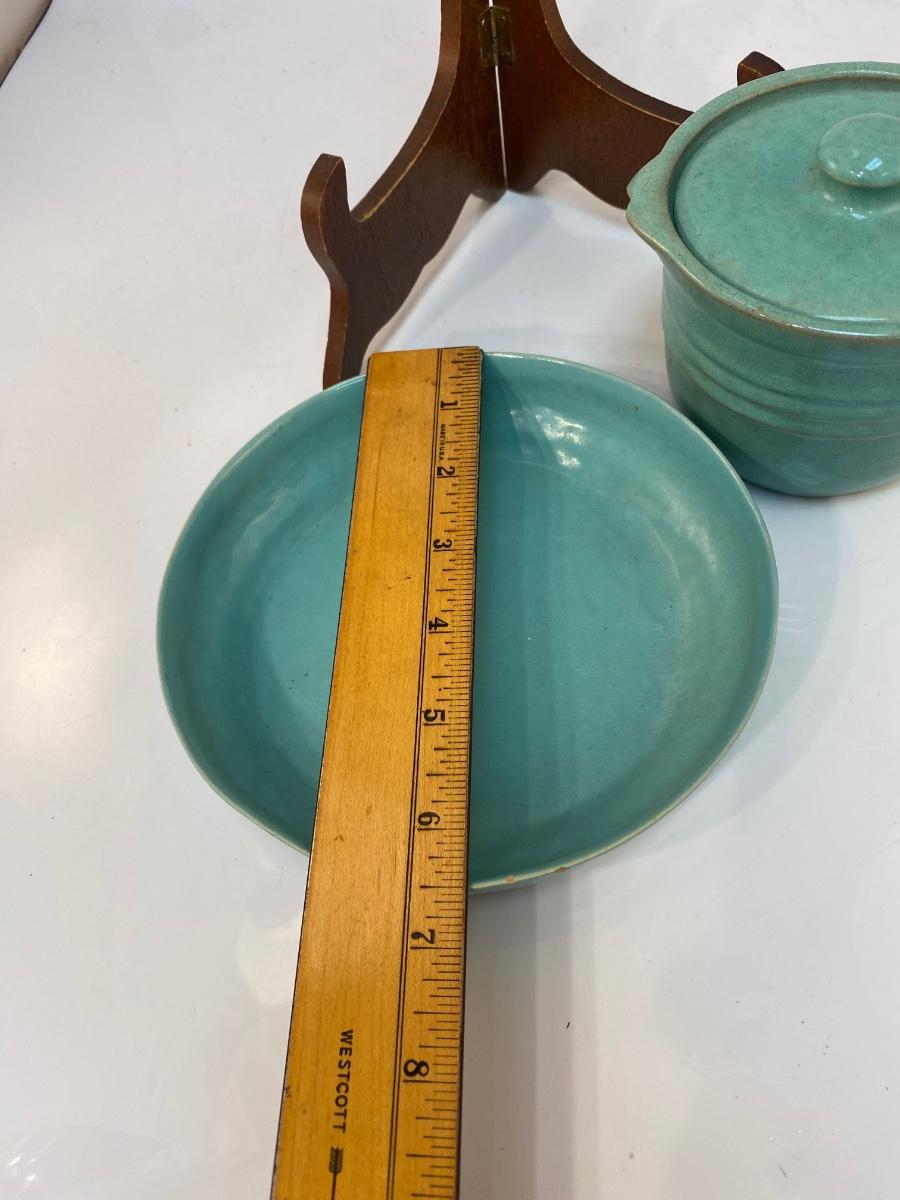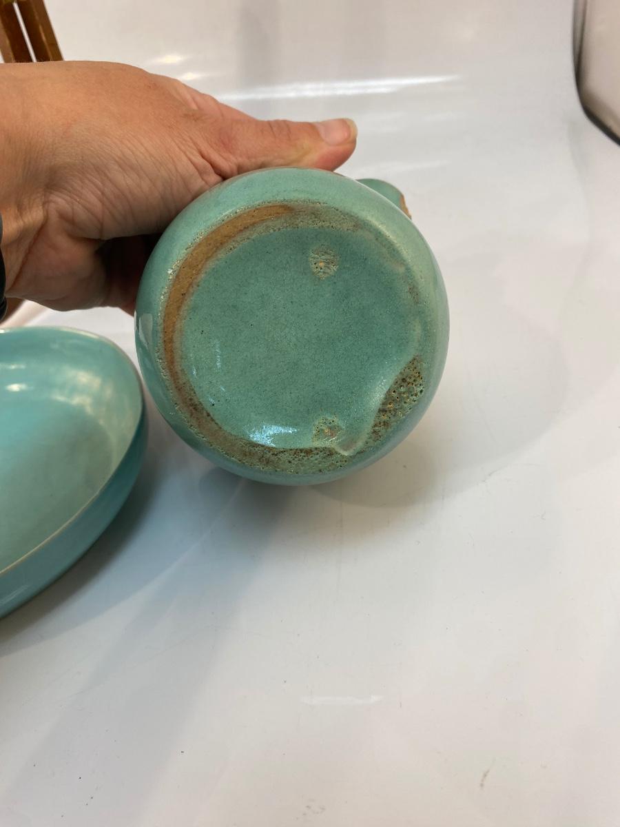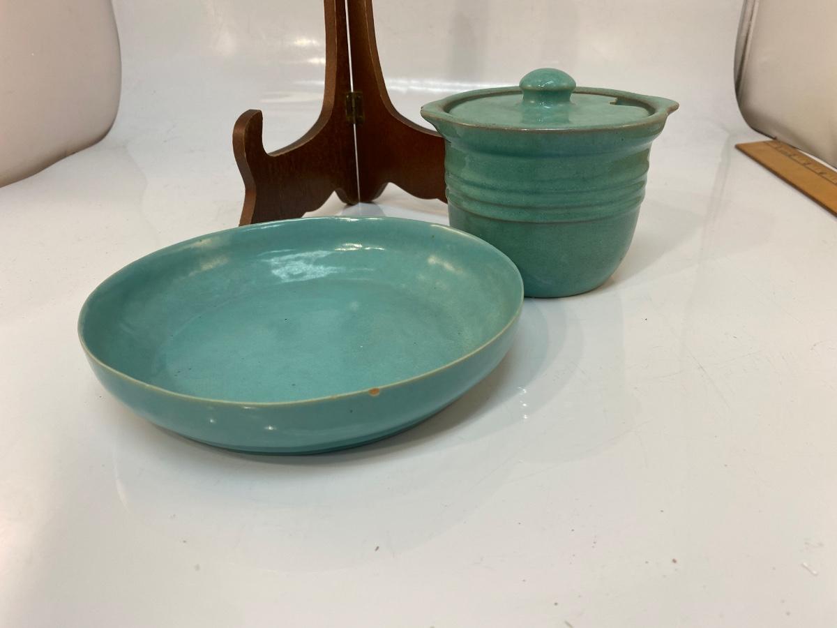 Vintage Turquoise Pottery Crock and Shallow Plate Bowl