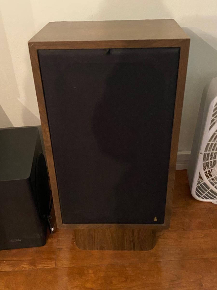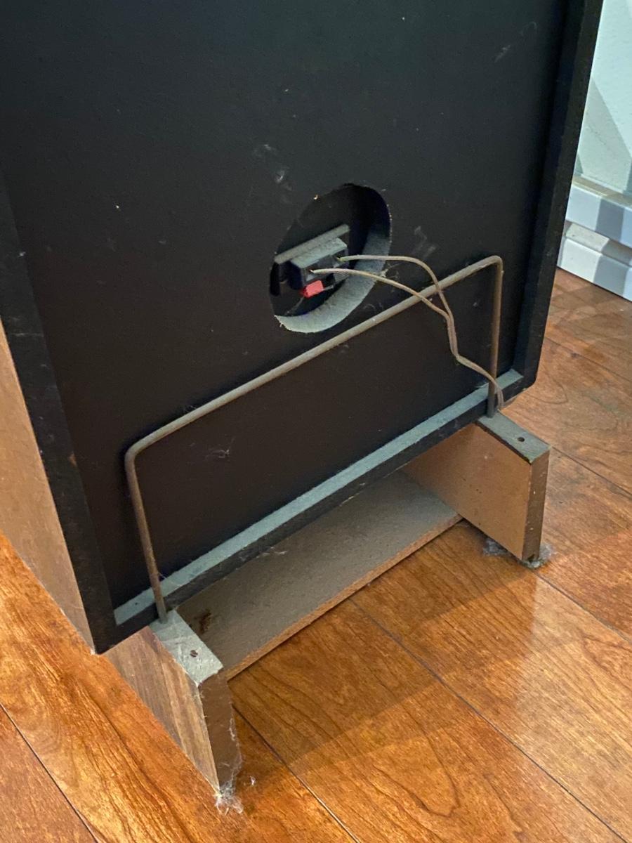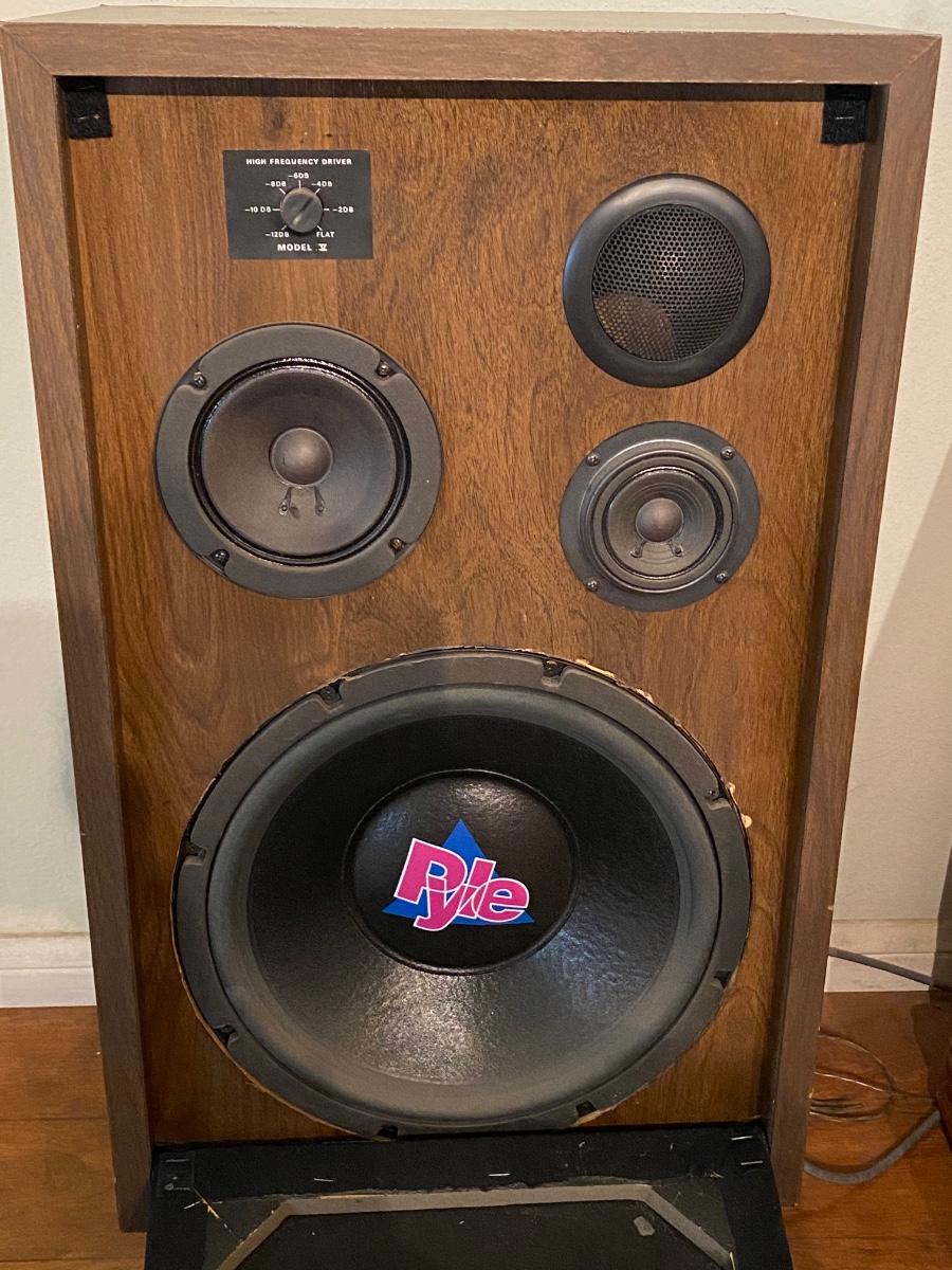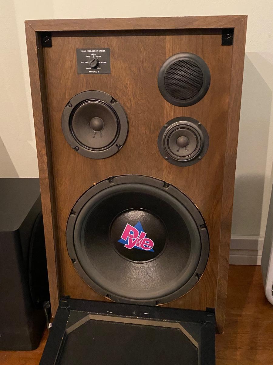 Vintage PYLE High Frequency Driver Home Stereo Wood Case Speakers Model V with Speaker Stands. Untested. Look to be in good condition, minimal wear to the wood cases, no holes in speaker covers. Total height with stands is about 31".