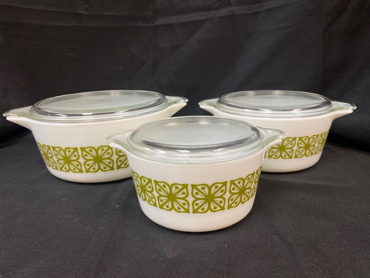 Vintage Pyrex White & Green Nesting Stacking Lidded Casserole Dishes Verde Square Flowers 473 474 475-B