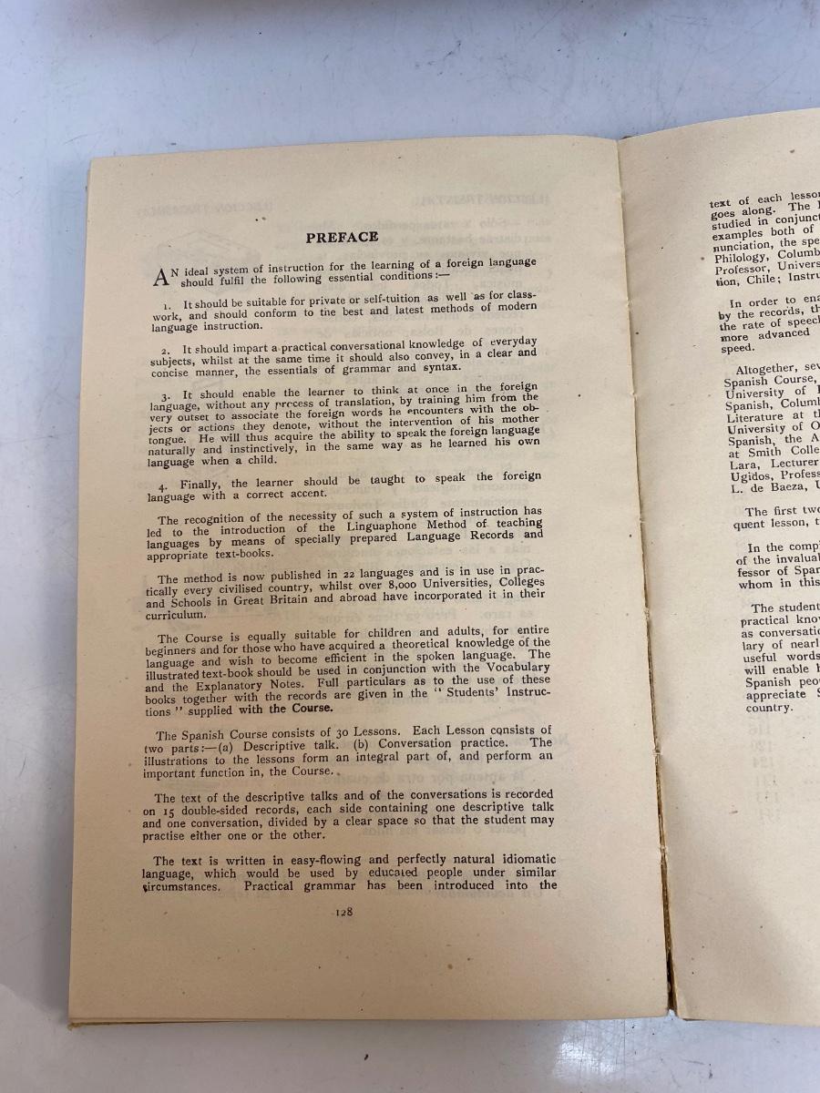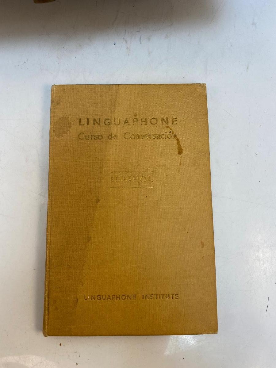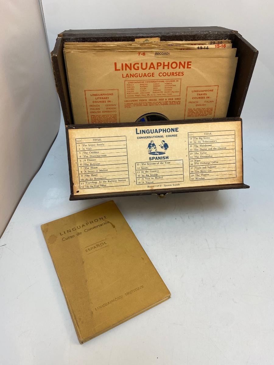 Vintage Linguaphone Learn Spanish Conversational Course on Album with Carry Case. Missing one album of the 15-album set. Comes with a follow along style book. In vintage condition. Case has wear. Mid 1950s.