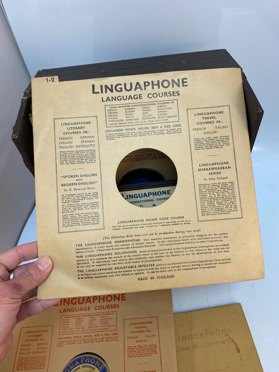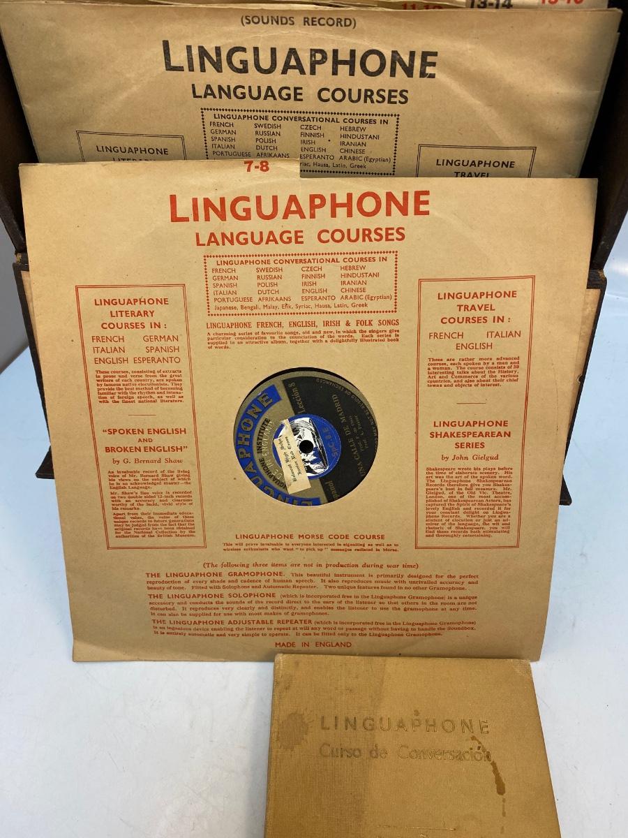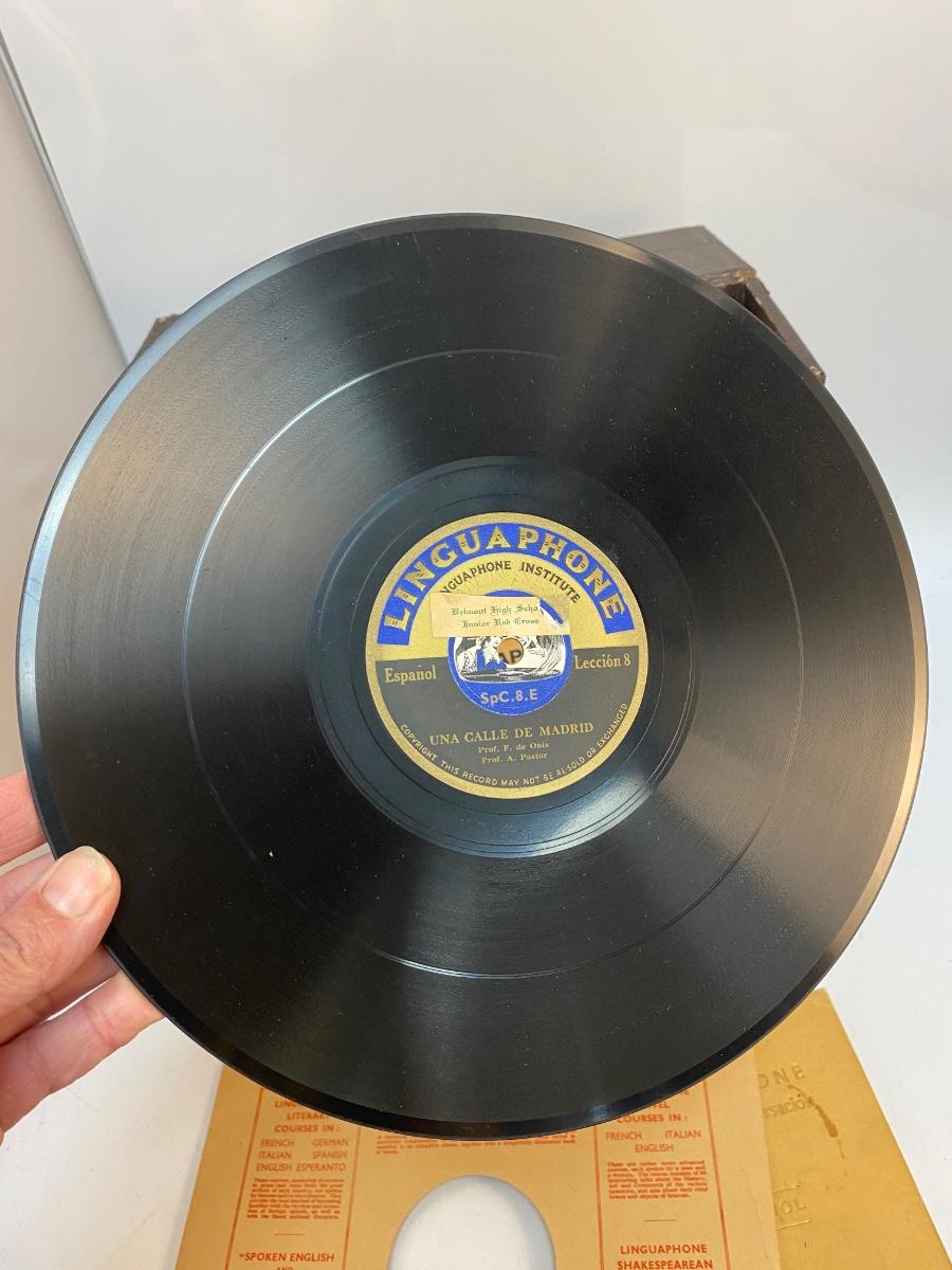 Vintage Linguaphone Learn Spanish Conversational Course on Album with Carry Case. Missing one album of the 15-album set. Comes with a follow along style book. In vintage condition. Case has wear. Mid 1950s.