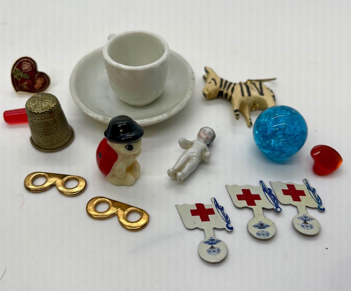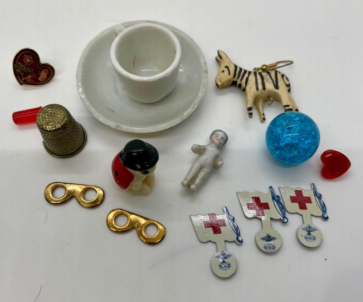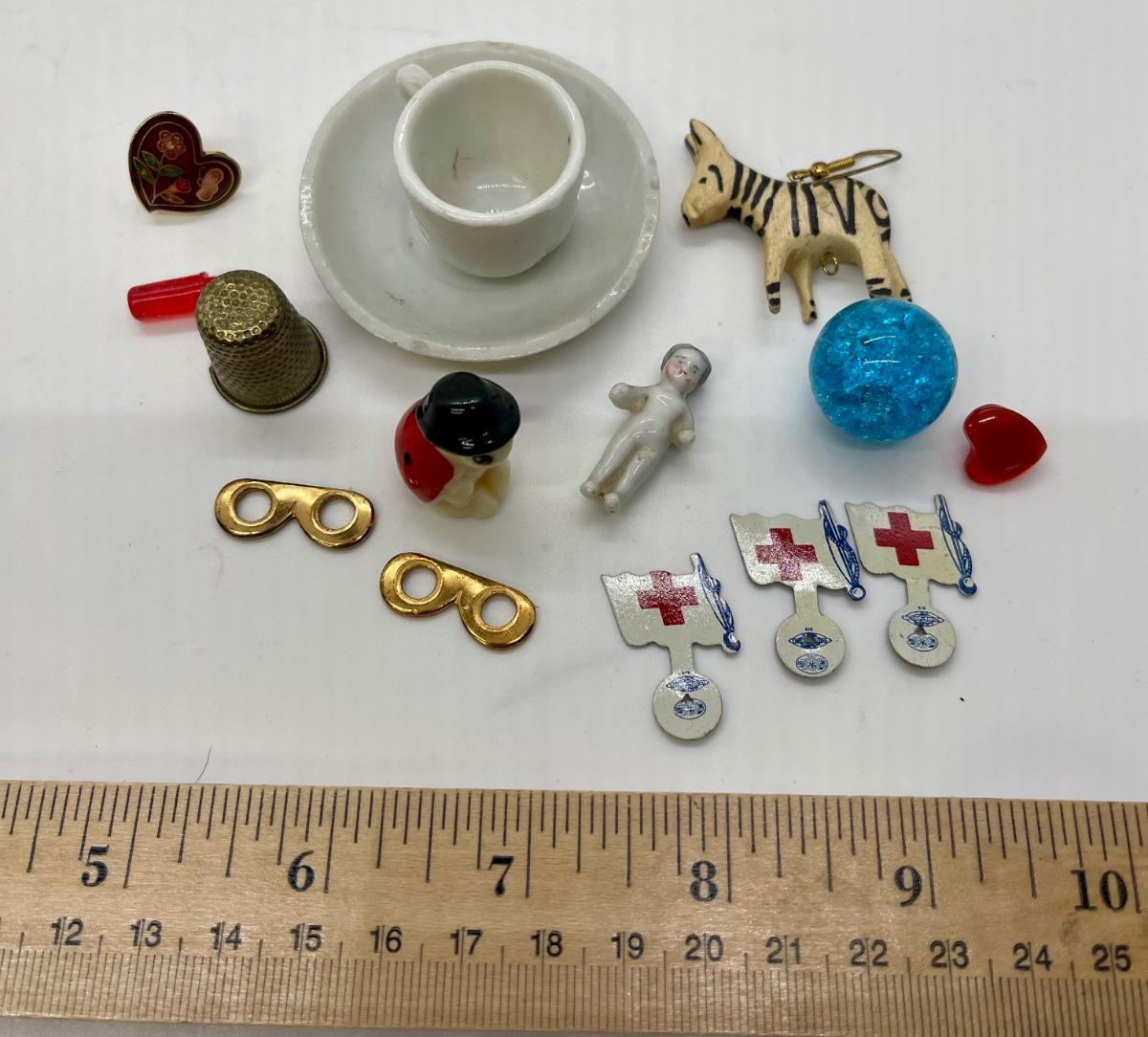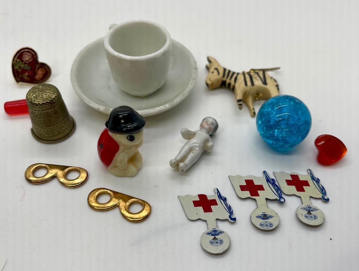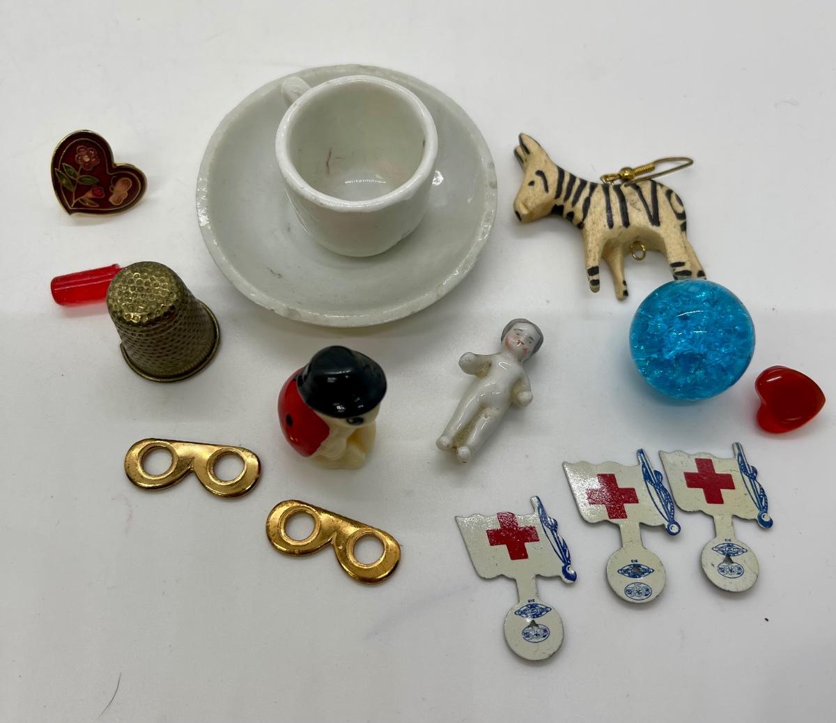 Miniature Odds & Ends Lot - figurines, teacup & saucer, marble, thimble, red cross tabs, etc
